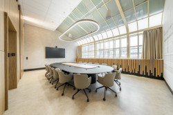Fotoateliér ve Státní tiskárně cenin už ztratil svůj původní účel. Byl to ale krásný prostor s panoramatickým oknem. Architektky ze studia JKH Architects ho proměnily v zasedací místnost, která se stala vizuální vizitkou instituce. Dominantní stůl doplňují konferenční křesla společnosti LD Seating.