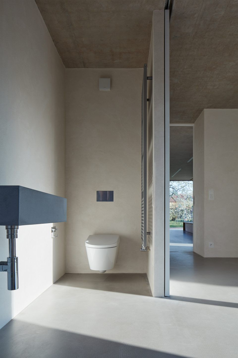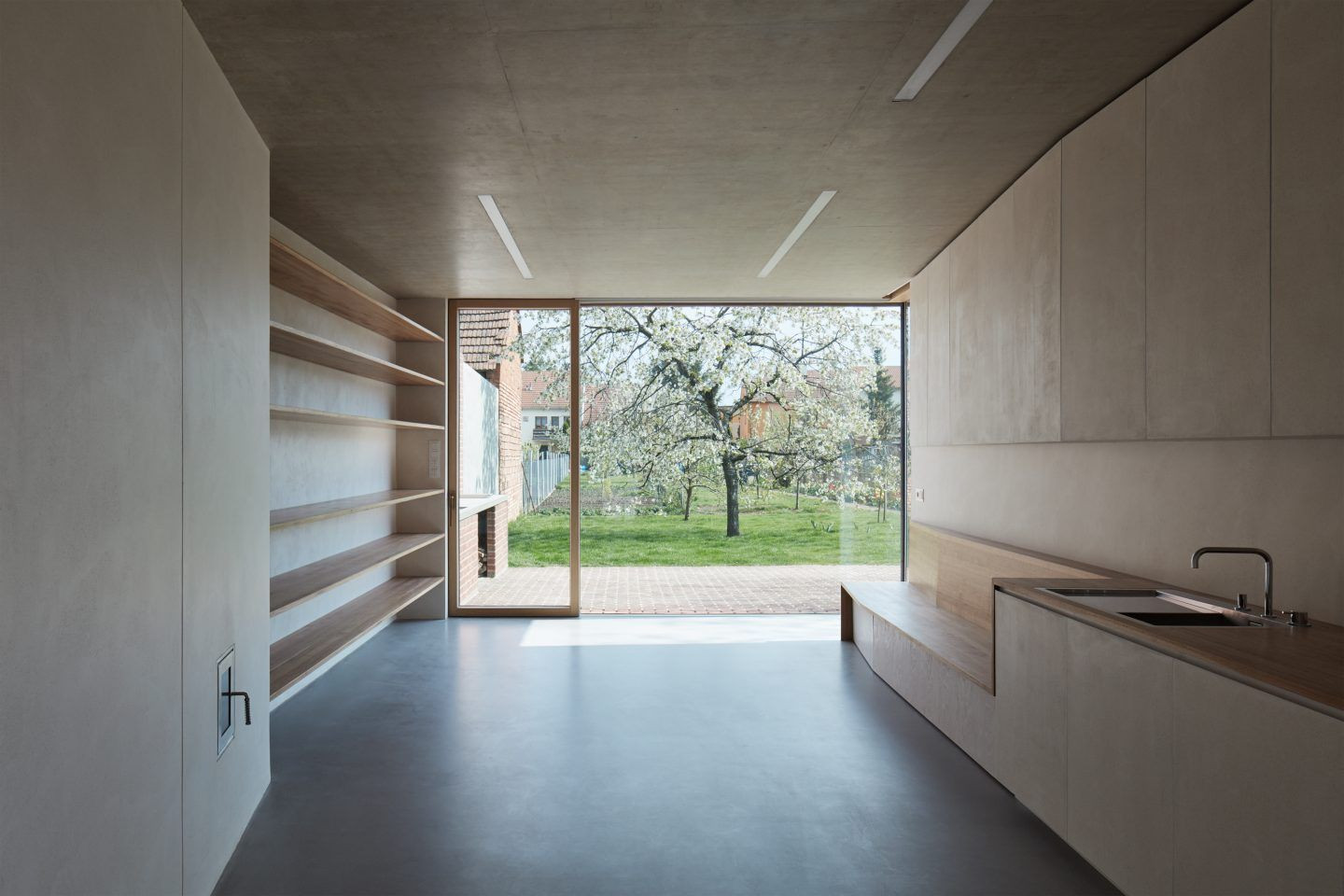V zadní části už často omítka nebyla použita, porotože takové řešení bylo nákladnější. Novostavba je dlouhá a úzká. Slouží jako přirozený plot k sousedům. Urbanistické řešení je tedy velmi podobné tomu původnímu, s jediným rozdílem: nový dům je oddělen od starého. Tím je docíleno čistého dělení starého a nového. Použitím ploché střechy se minimalizoval konečný objem stavby, což působí na malém prostoru elegantně. Fasáda domu tak evokuje další zídku, která pak definuje tvar dvora a zrcadlí se v dlažbě. Půdorys samotného domu je řešen jednoduše a funkčně. Objektu dominuje místnost s kuchyní, velký stůl a velké okno do zahrady. Vedle je ložnice s úzkou koupelnou. Cílem bylo navrhnout malý dům, který respektuje své okolí, je pohodlný a přijemný na žití.