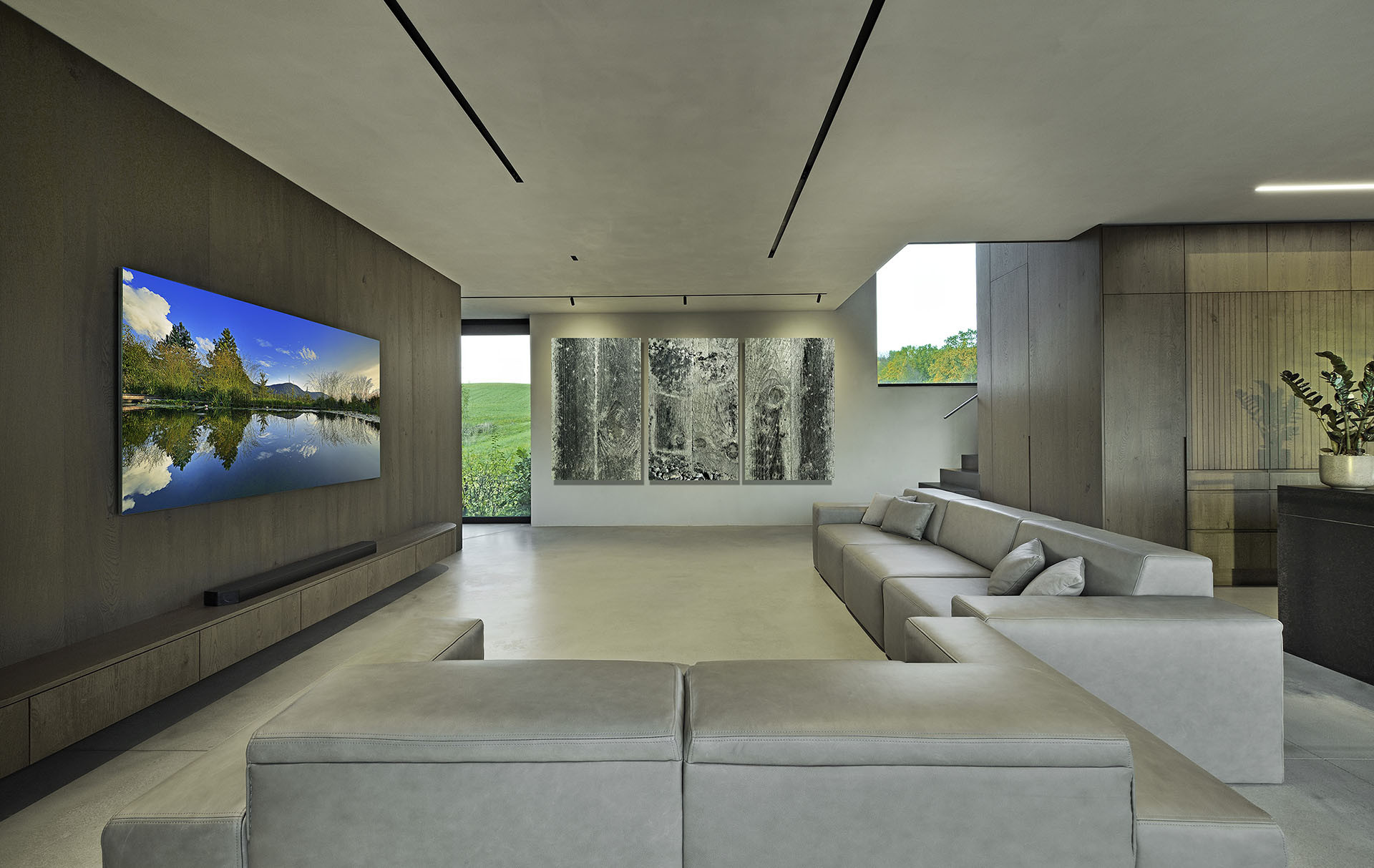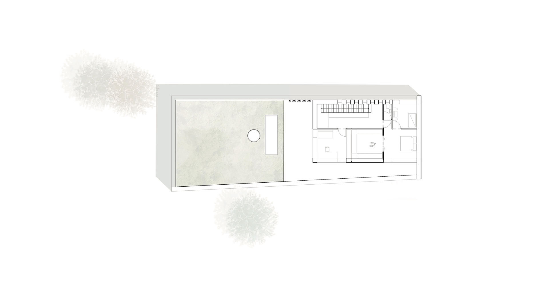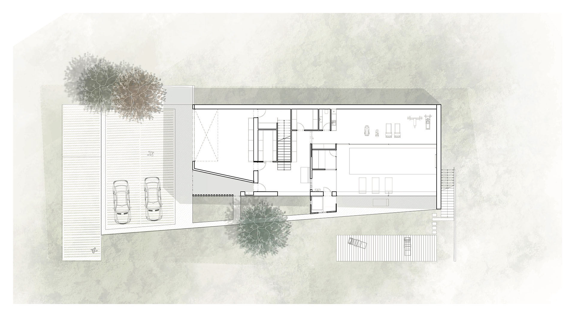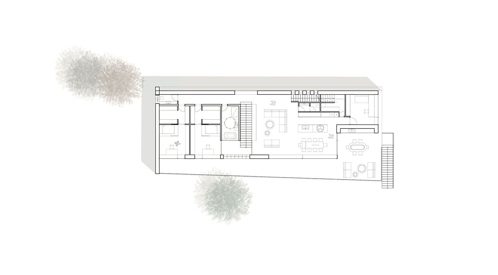 V momentě, kdy se k vile ve Skalici přiblížíte ze strany obce, působí jako dvoupodlažní dům, kterých je okolo celá řada. Ve skutečnosti má ale novostavba podlaží tři, to nejnižší ovšem šikovně schované. Suterén – v němž však není žádný sklep, ale posilovna s bazénem – se totiž nachází pod úrovní okolního terénu. „Dům má celkem tři podlaží – suterén, který jsme z větší části zapustili pod terén, a dvě podlaží nadzemní,“ popisuje základní koncept vily David Kotek – hlavní architekt projektu z ateliéru Projektstudio, s nímž na vile spolupracovala ještě architektka Andrea Jašková.