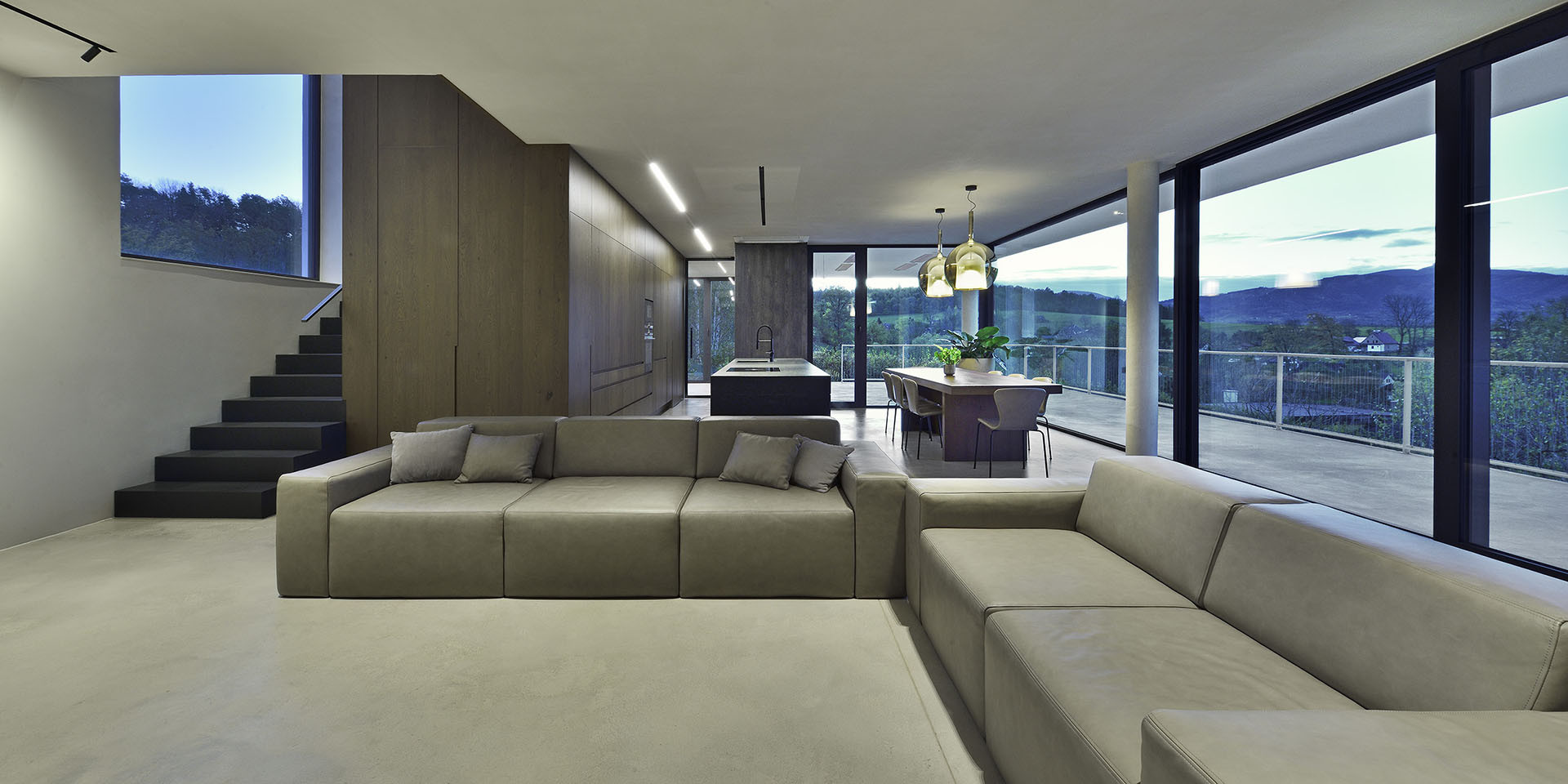 Díky systému zdvižně-posuvných dveří (MB-77HS HI) se dají vybrané „skleněné stěny“ otevírat odsunutím do strany. Specialitou, která se rodinných domech často nevidí, jsou tzv. panelová okna (MB-86 SI) – na vile jsou velmi úzká, dá se nimi větrat a v prosklené ploše nejsou téměř vidět. „Panelová okna nám pomohla splnit požadavek architekta zachovat maximální rozměr fixních prosklených pozic a minimalizovat otvírky,“ vysvětluje Tomáš Buček, projektový manažer firmy Aluprof. Právě díky těmto řešením je zahradní průčelí vily nejen estetické, ale také funkční.