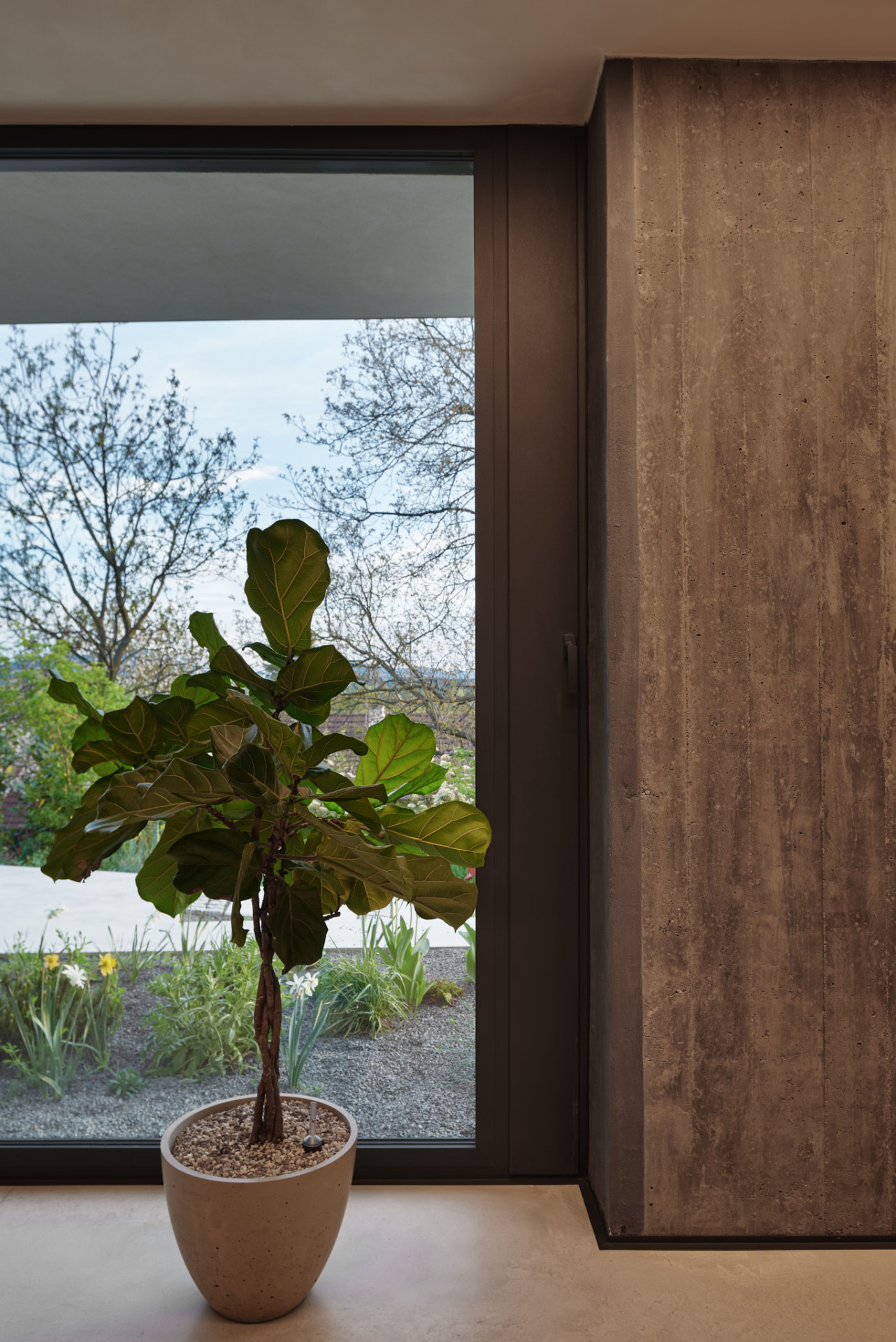 Projektstudio říká, že se vila „vine jako stuha“. Zdivo jako by se zalamovalo okolo velkých prosklených ploch. Ateliér ho záměrně nechal před okna lehce předstoupit – vznikly tak praktické přesahy, které interiéry stíní. Okna mají také své předokenní žaluzie a do budoucna mohou přibýt ještě zastiňovací paravány. Před nadměrným přehříváním se tedy vila umí chránit.