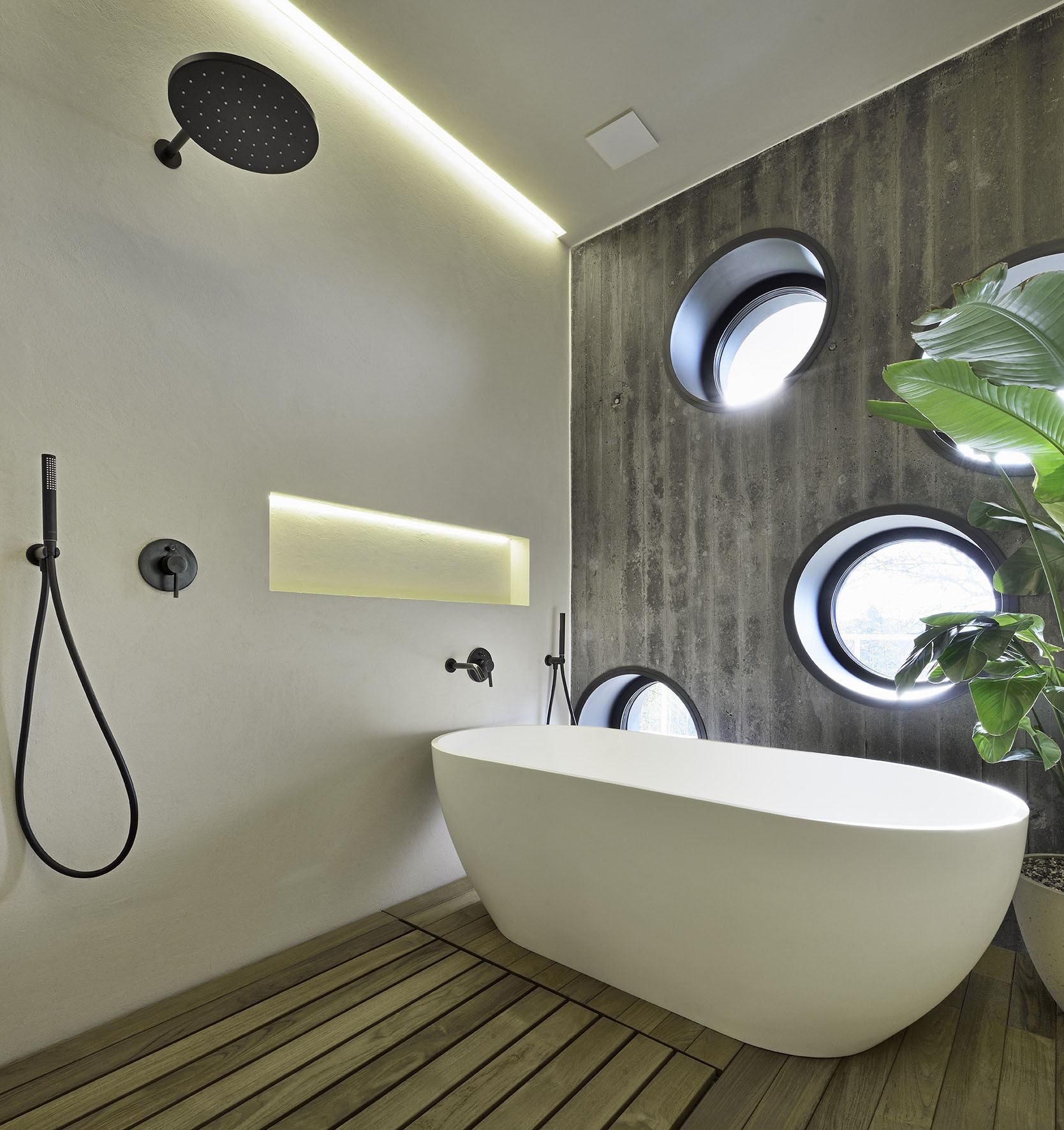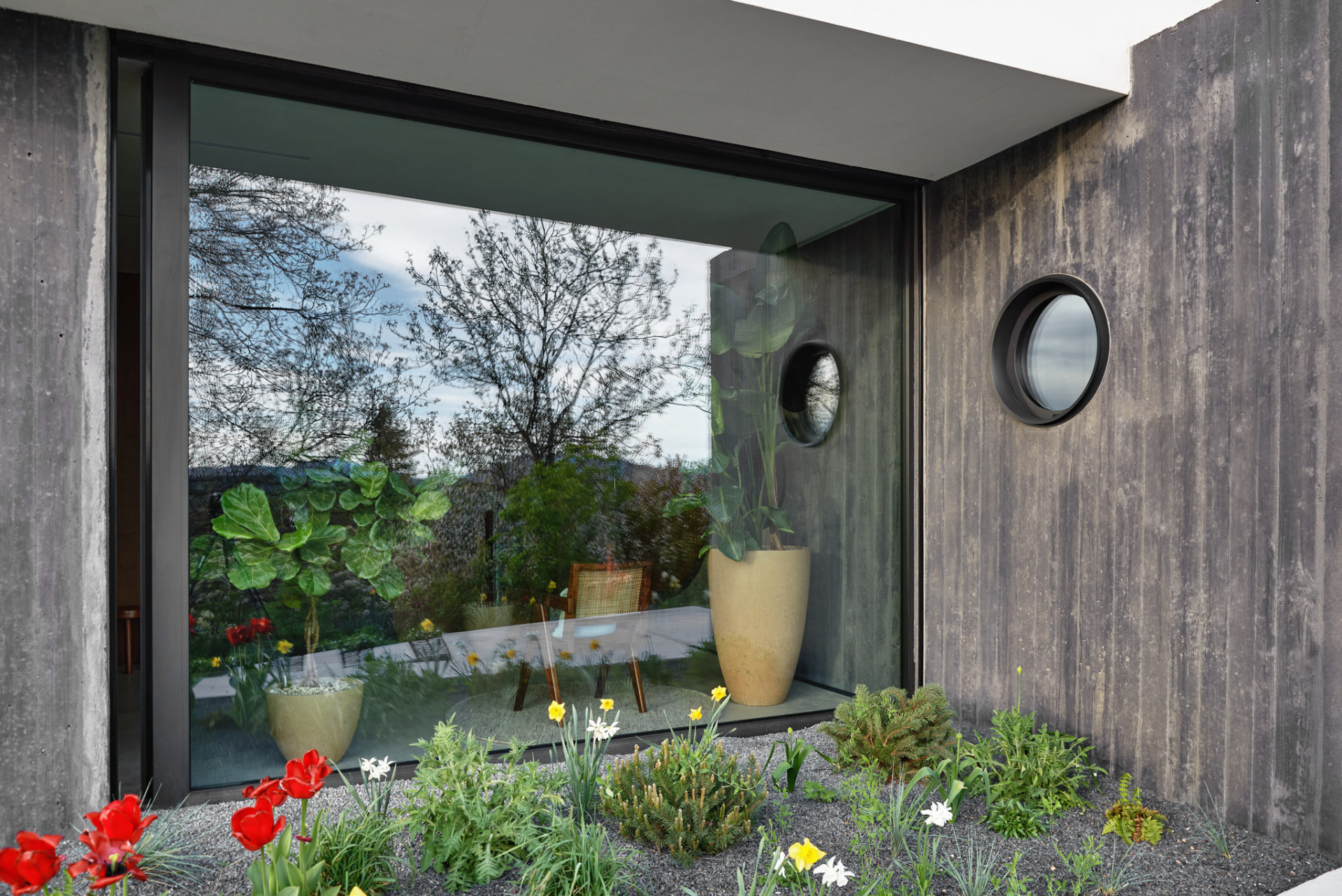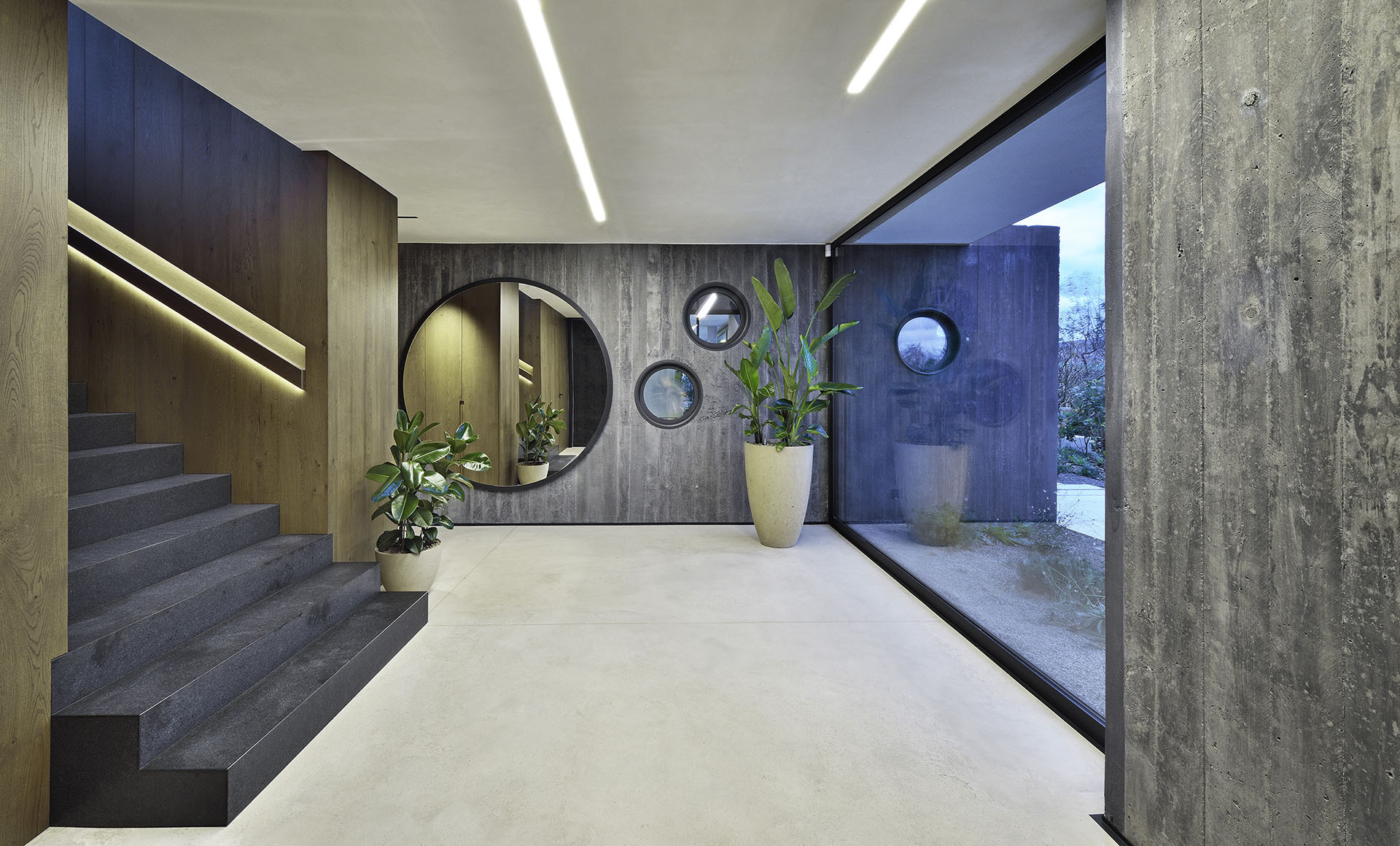 Konstrukce vily je z železobetonu. Navenek se však projevuje svými bílými fasádami, okny zasazenými do antracitových rámů a deskami z pohledového betonu, které na jinak prosklené zahradní fasádě kryjí místnosti, do nichž nemá být vidět. Je to třeba koupelna, do které denní světlo proniká malými kulatými okny. Vilu, v níž jinak vládne formální střídmost, to příjemně ozvláštňuje.