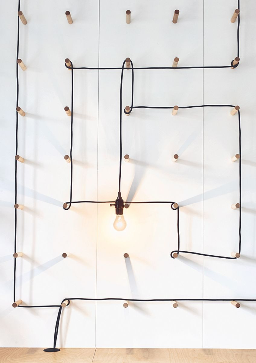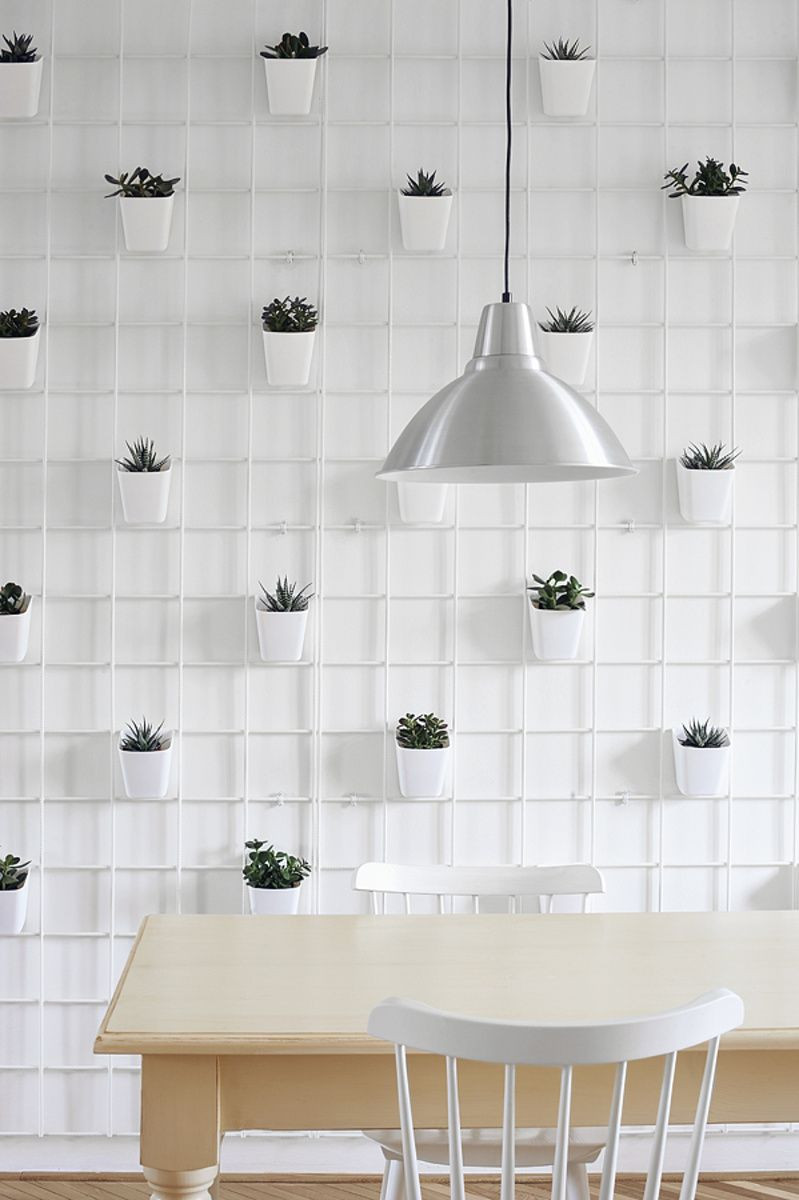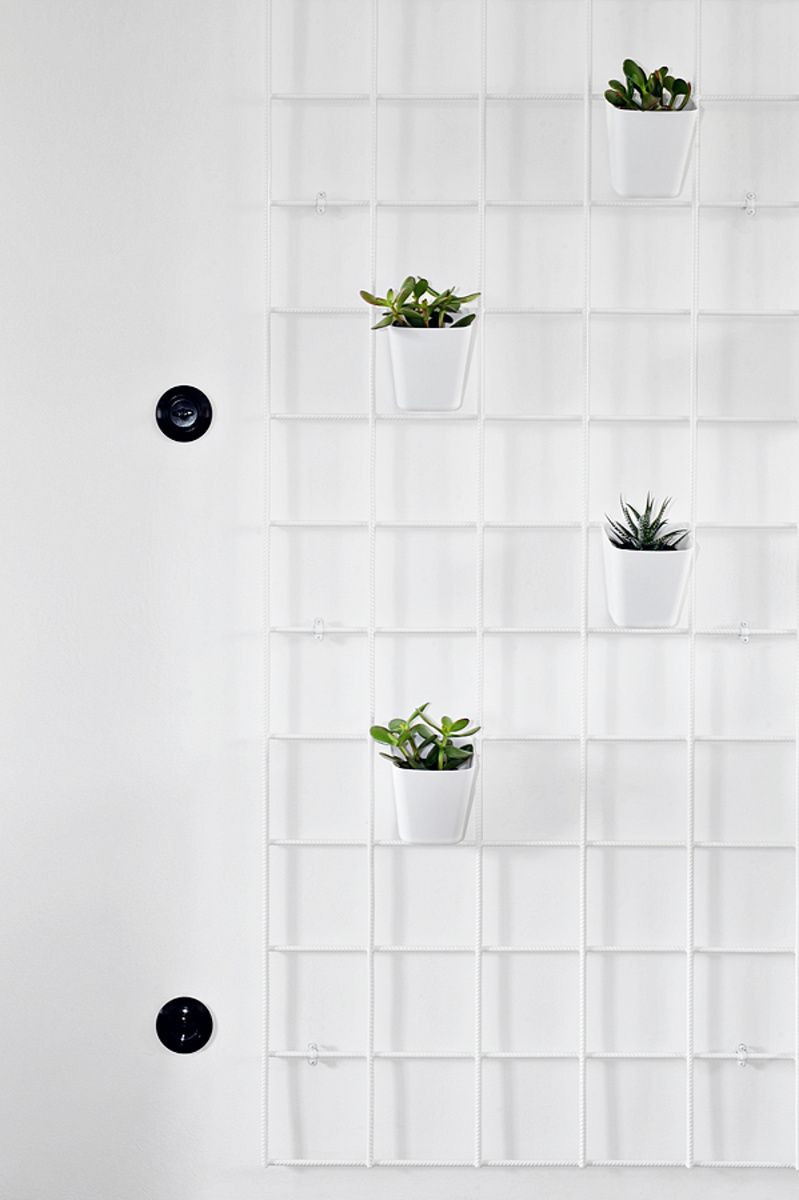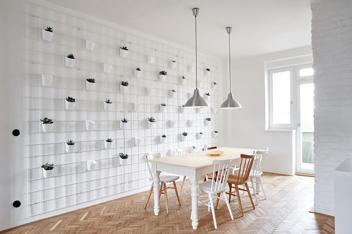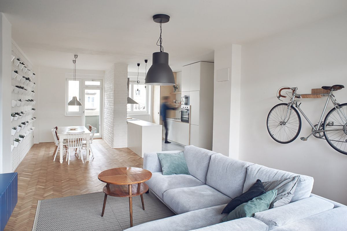 Byt se rozprostírá přes celou šířku patra, což mu umožňuje výborně prosvětlení a také přímý vstup na balkon hned ze dvou stran. Výrazným prvkem hlavního obývacího prostoru se stala stěna s chytře využitou kari sítí, která se běžně používá jako výztuž betonu. Zde ovšem plní funkci „držáku“ rostlin, které časem celý prostor velmi oživí. Kromě zelené stěny architekti byt ozdobili ještě jedním atypickým prvkem, který odkazuje na celý proces realizace. „Místo obrazu či autorského prvku jsme na stěnu zavěsili kolo (autentický dopravní prostředek na kontrolní dny) jako symbolickou parafu za dokončeným projektem,“ doplňují.