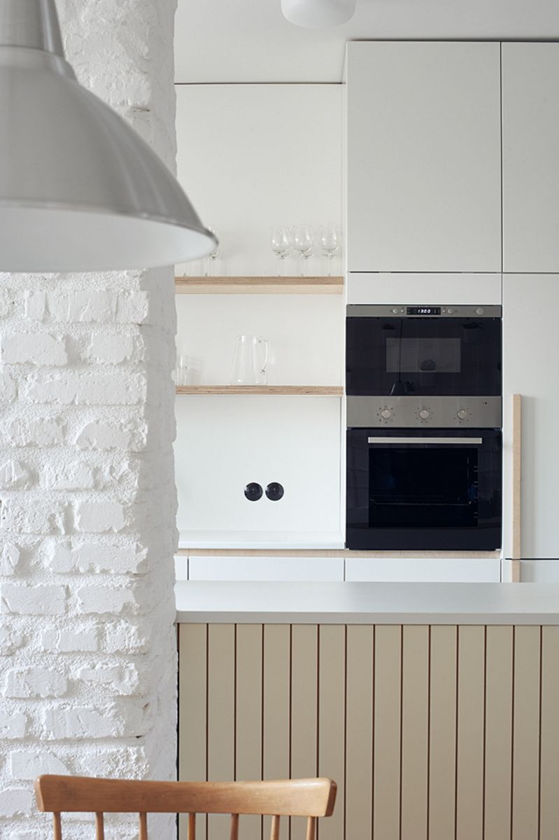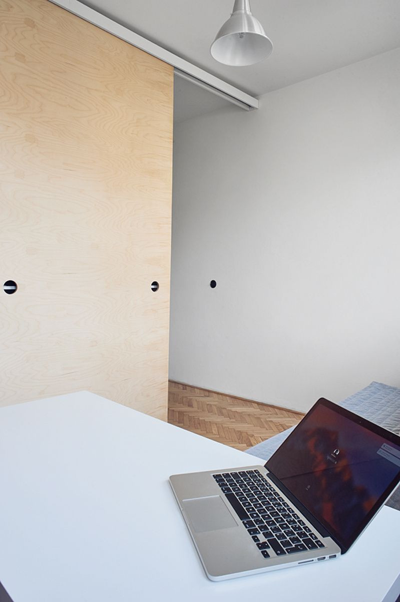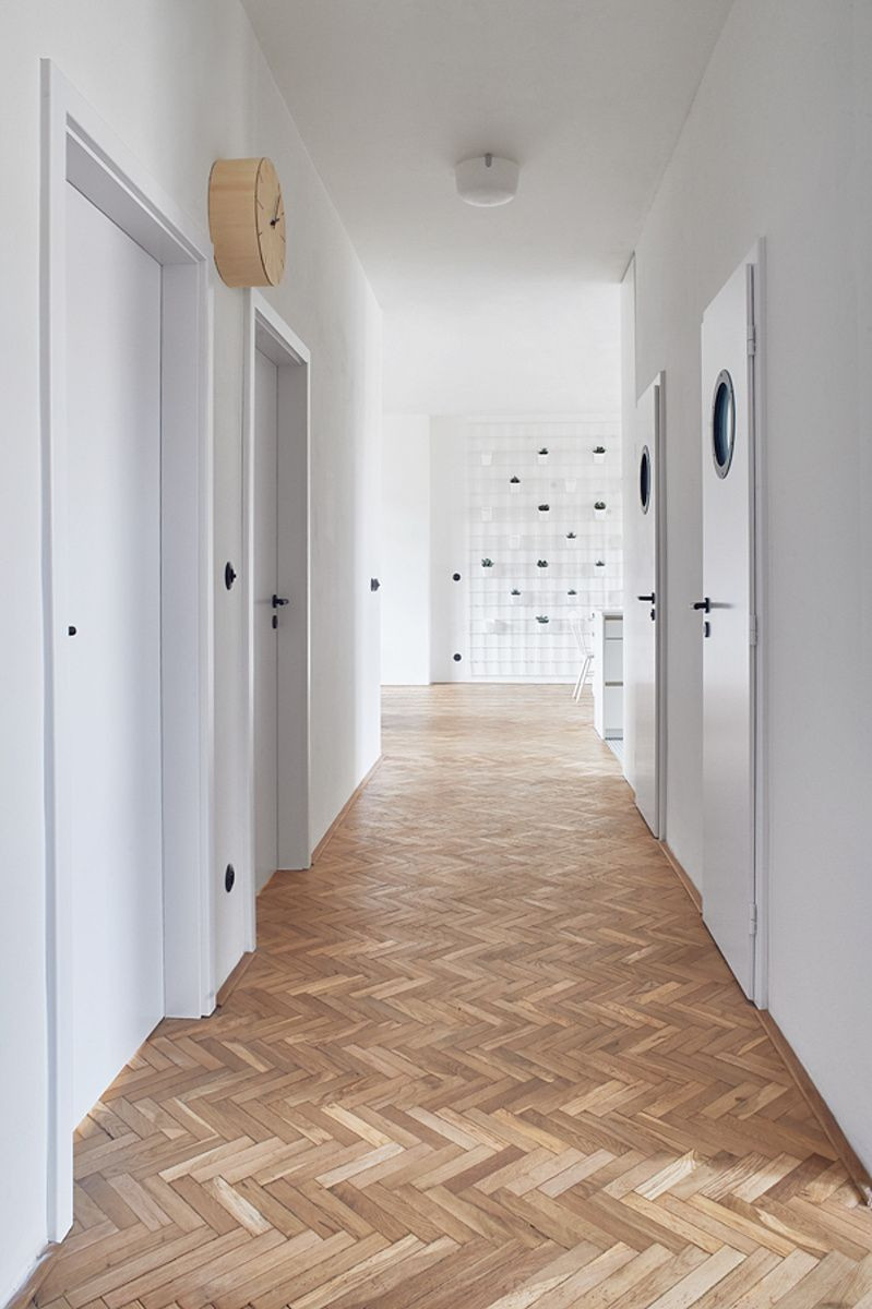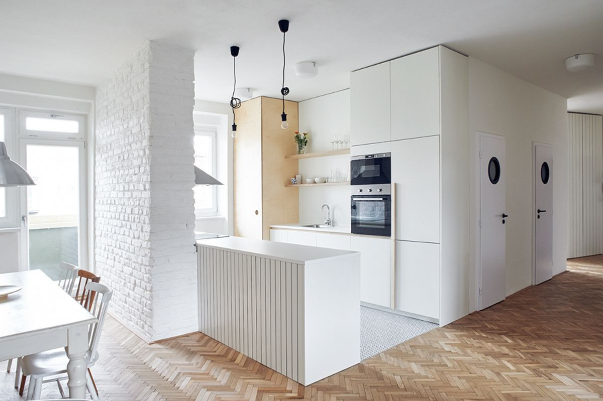 Byt s uzavřenými dispozicemi v domě ze 60. let proměnilo pražské studio Ti architekti v moderní a vzdušný domov s několika zajímavými detaily. Prostor sjednotila bílá barva stěn, dveří a většiny nábytku, která příjemně kontrastuje s masivními parketami a dalšími dřevěnými doplňky v přírodní barevnosti. Byt se rozprostírá přes celou šířku patra, čímž získává přístup na balkon ze dvou protilehlých stran hlavního obytného prostoru.
