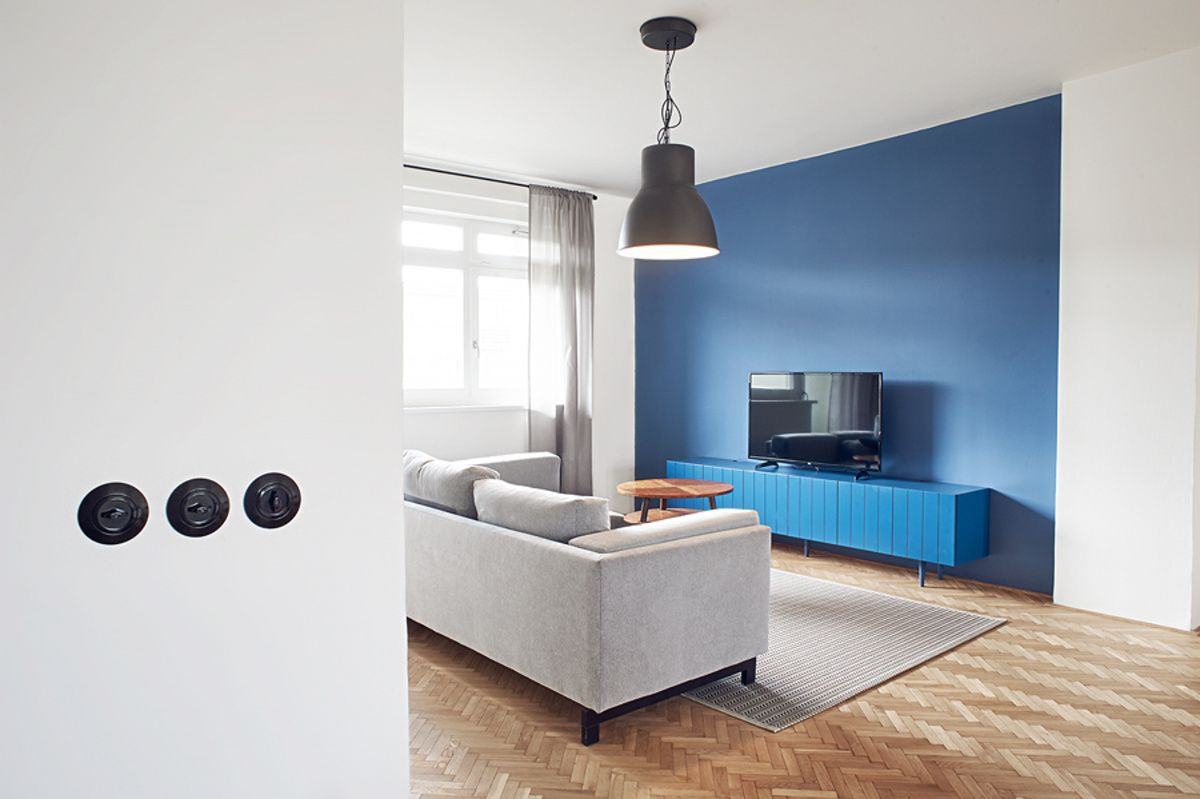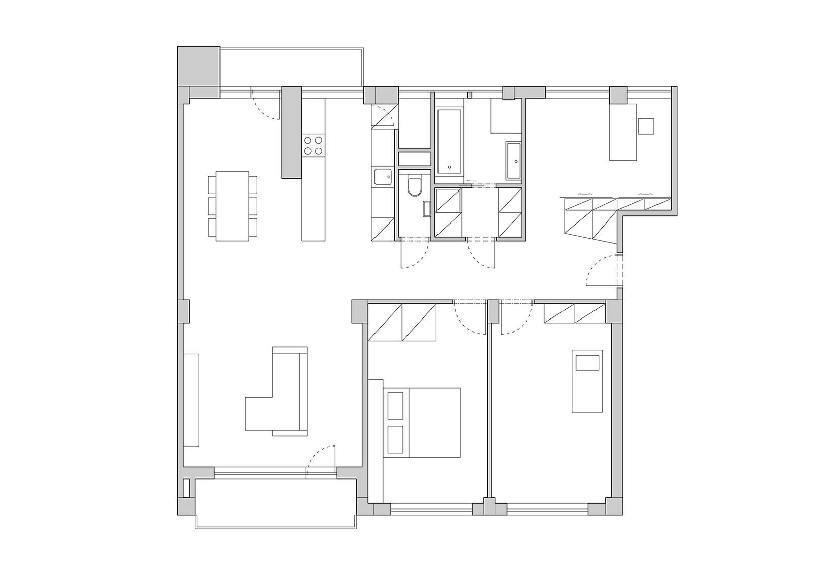 Architekti přistoupili k úpravě celkové dispozice bytu, který se nachází v jednom ze starších bytových domů v Praze z druhé poloviny minulého století. Z původní dispozice 5+1 vzniklo stavební úpravou 4+kk. Původně byla totiž každá místnost bytu uzavřená stěnami a příčkami, což bránilo celkové komunikaci vnitřních prostor. Možnost průhledů napříč celým bytem výrazně přispělo k čitelnosti a zpřehlednění bytu.