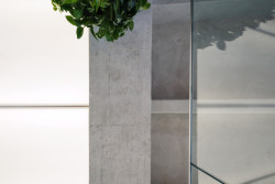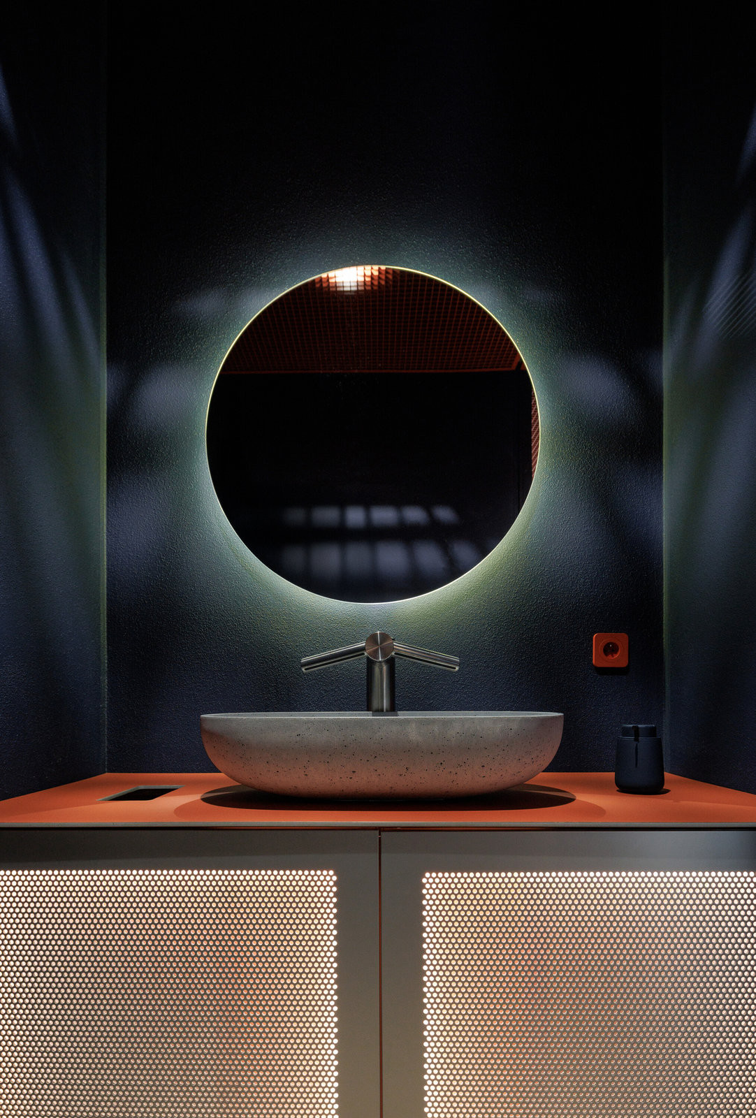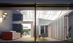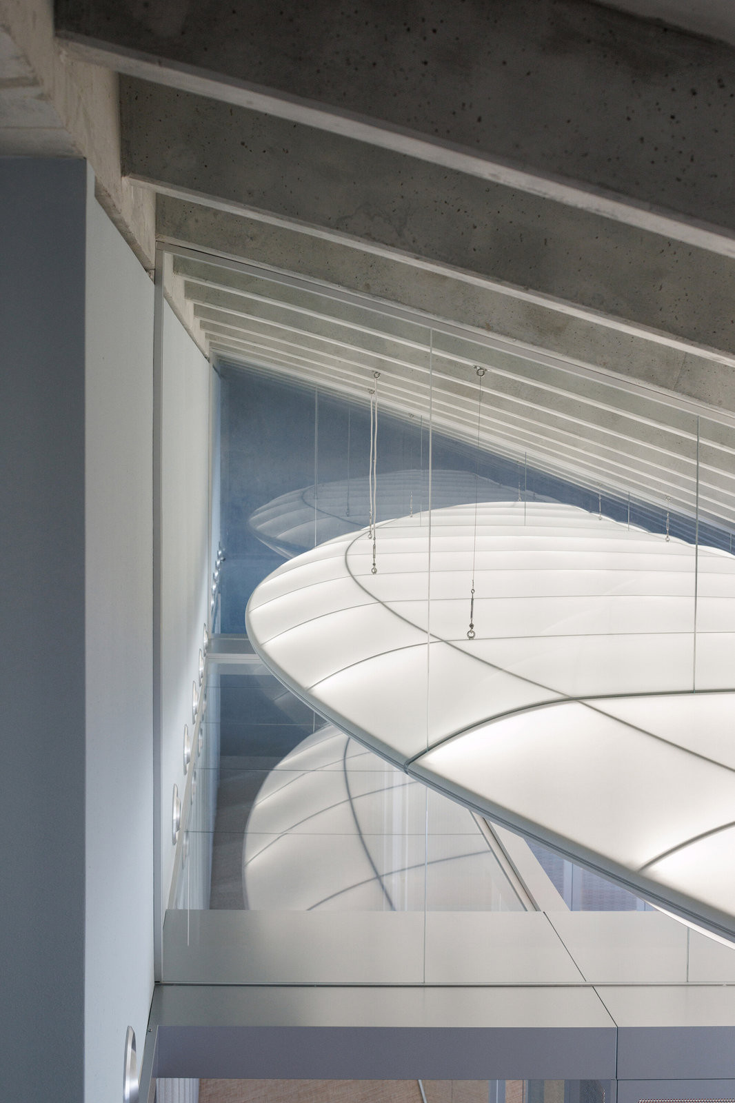 Když se sejmuly devadesátkové sádrokartonové podhledy, odhalila se klenba z monolitického betonu, která dnes definuje charakter celého kancelářského prostoru a podle Tomáše Císaře připomíná obrácený trup lodi.