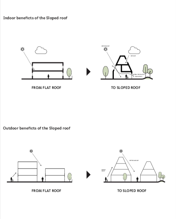Přístupu světla nahrává i šikmá střecha, která nabízí několik výhod jak pro vnitřní prostředí, tak pro okolní stavby. Přirozené denní světlo rozptýlené střešními okny může pronikat hlouběji do interiéru, díky otevřeným prostorům mezi patry se dostane i do nižších dispozic, čímž se zvyšuje pocit pohody, interiér působí vzdušněji a zároveň se snižuje potřeba umělého osvětlení. Šikmý sklon střech je oproti těm plochým zároveň ohleduplnější k sousedům, protože přímé sluneční záření dopadá blíže k patě domu. Nestíní tedy tolik sousední objekty, což umožní vyšší hustotu zástavby a podporuje jeden z dalších principů, a to komunitní bydlení. „Šikmé střechy mají výhodu i v tom, že když začnete přibližovat domky k sobě, tak si tolik necloní, pořád máte dostatečný výhled,“ doplňuje Marek Petrík.