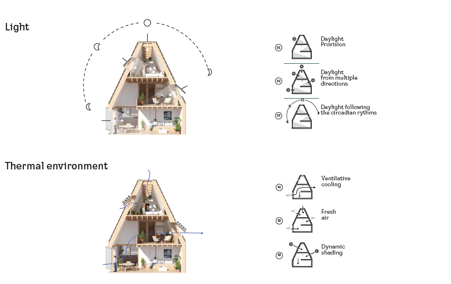 Projekt Living Places využívá denní světlo a čerstvý vzduch jako klíčové složky zdravého vnitřního klimatu. Vždyť 90 % času trávíme uvnitř budov, takže to, jak stavíme a žijeme, přímo ovlivňuje naše fyzické i duševní zdraví. Tvar domu, půdorysy jednotlivých pater a promyšlené rozmístění fasádních i střešních oken byly v Living Places navrženy s ohledem na náš cirkadiánní rytmus, tak aby v každé denní době byl v domě dostatek přirozeného světla.