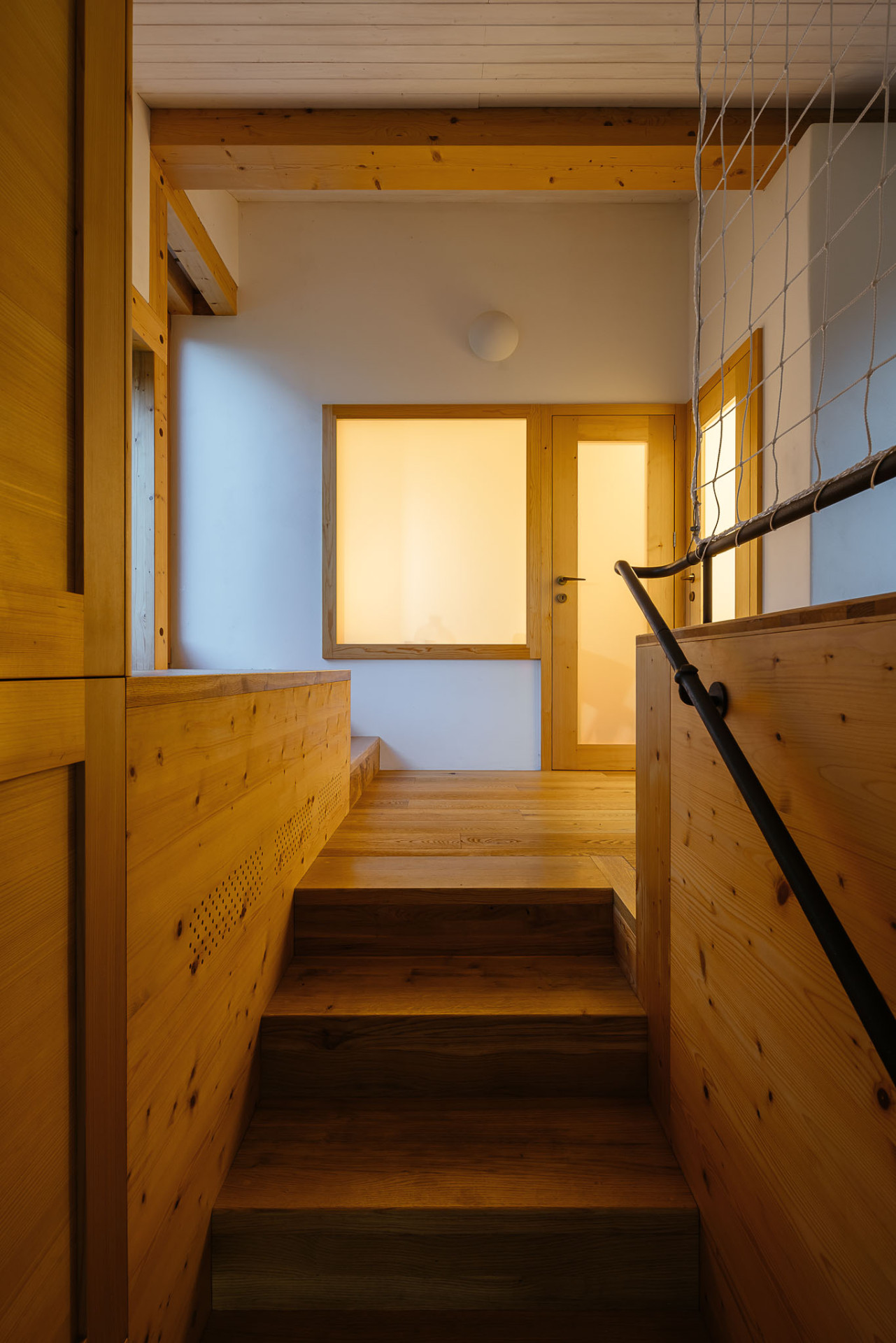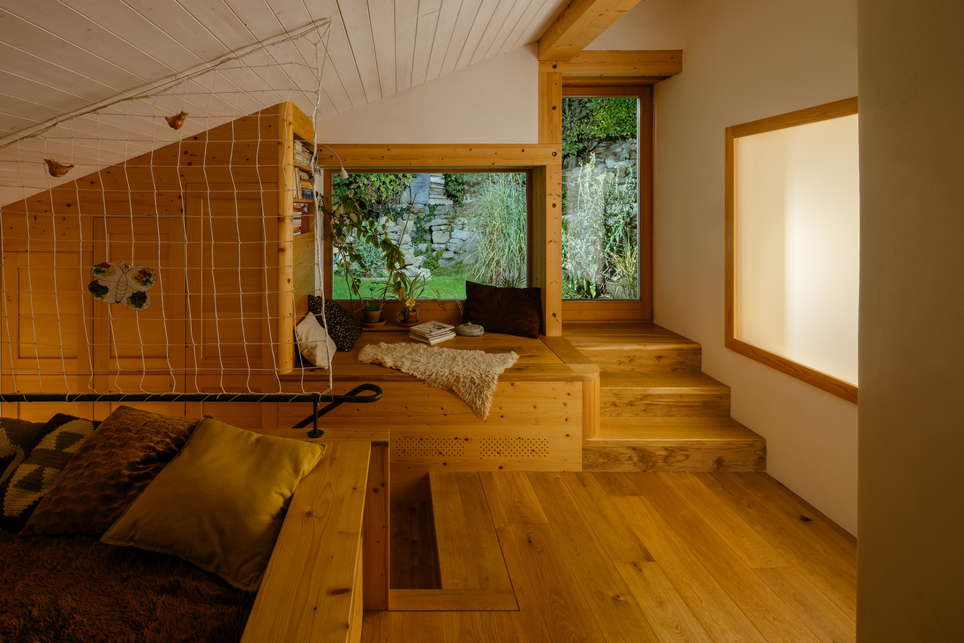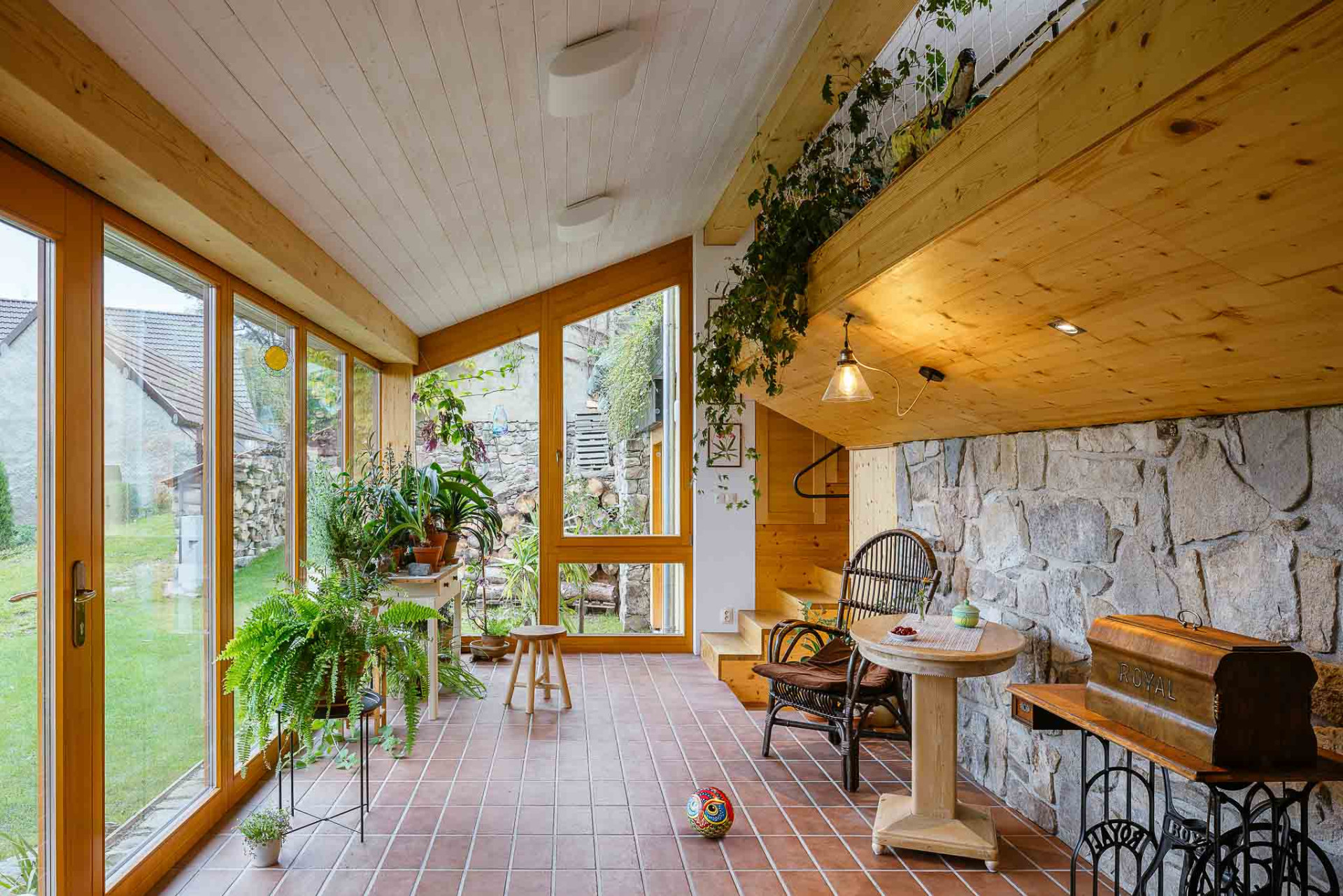 Do přístavby se vstupuje přes původní chalupu. Vejdeme dovnitř a ze zádveří vedou dveře doleva do zimní zahrady. Hlavní pobytové patro se nachází nad zimní zahradou a sklepem. Dostanete se tam po schodech, které ústí do koupelny a malého dětského pokoje, ze kterého dál vede výsuvný žebřík do patýrka se sníženou výškou. To slouží jako dětská hernička i místo pro spaní většího počtu dětí. Hned u schodiště je také okno se sedacím výklenkem. Tímto oknem se také dostanete na venkovní terasu.