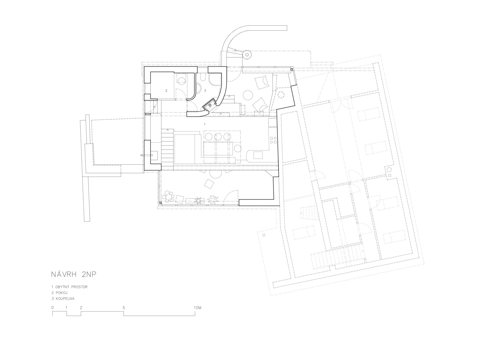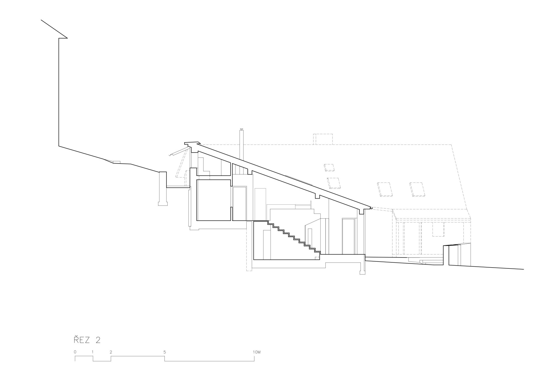 Novostavba zastřešila historický sklep a „zakusuje“ se do svahu. Byt má mnoho výškových úrovní, společných prostor i soukromých „zašíváren“. Stojí na okraji Šumavy.