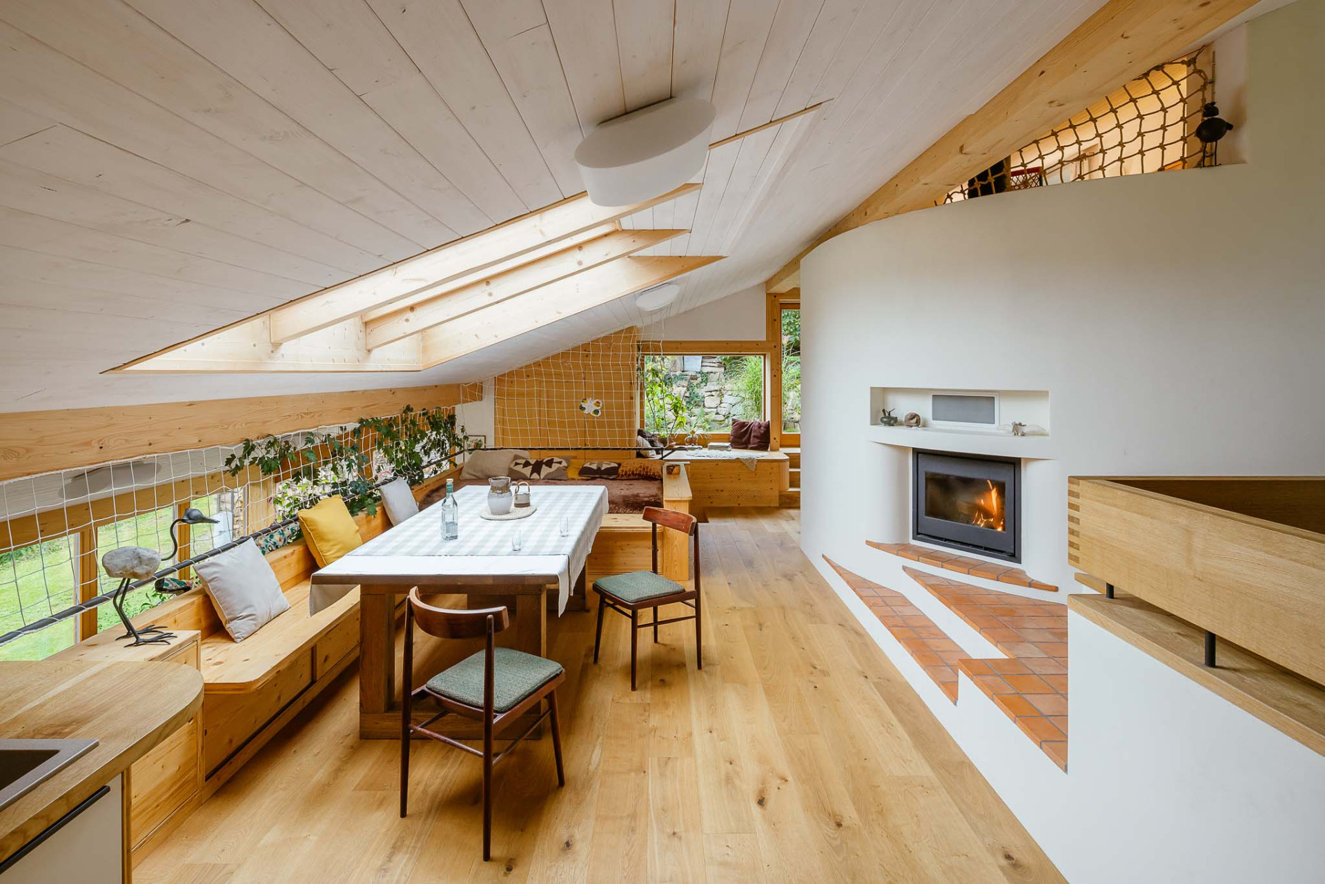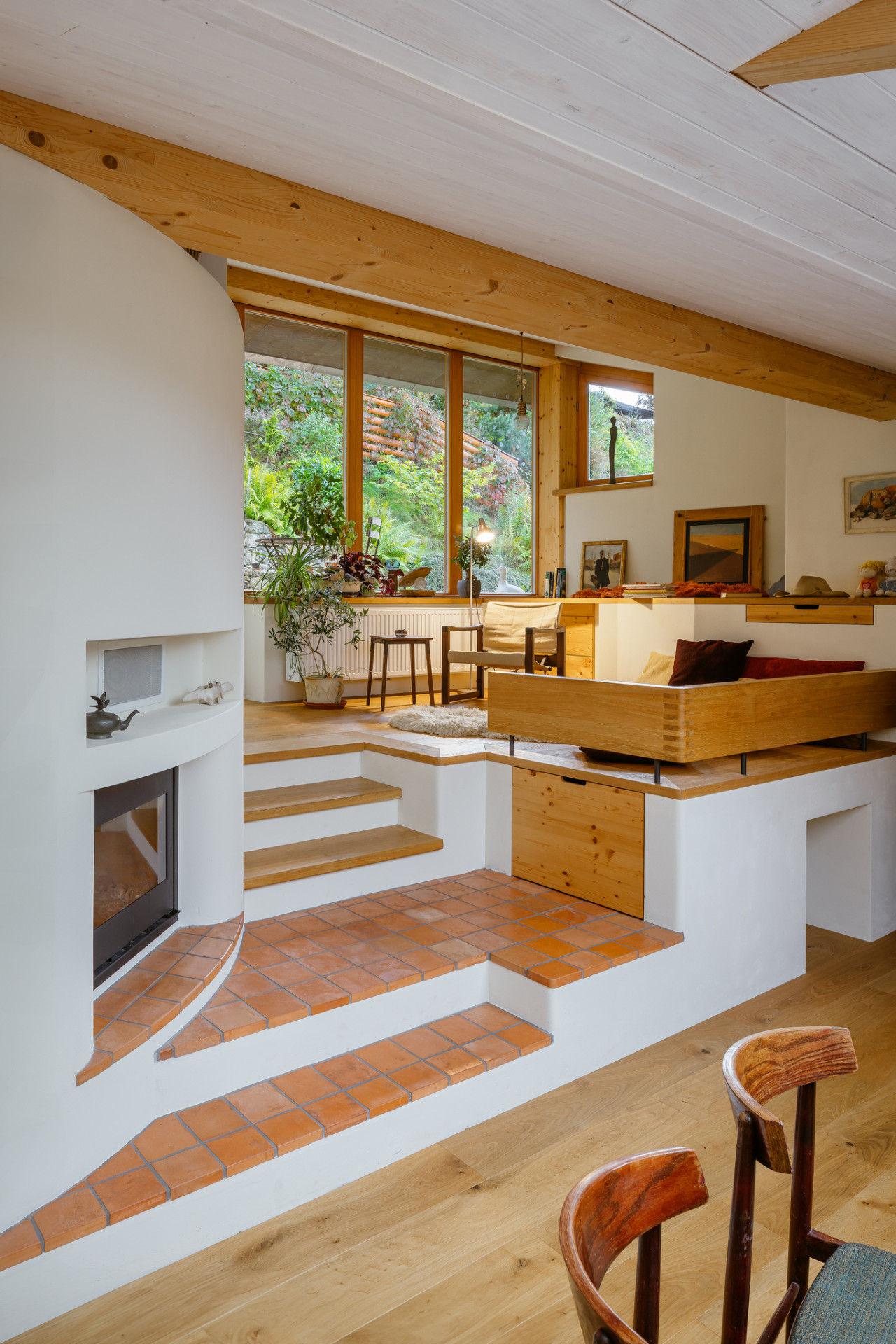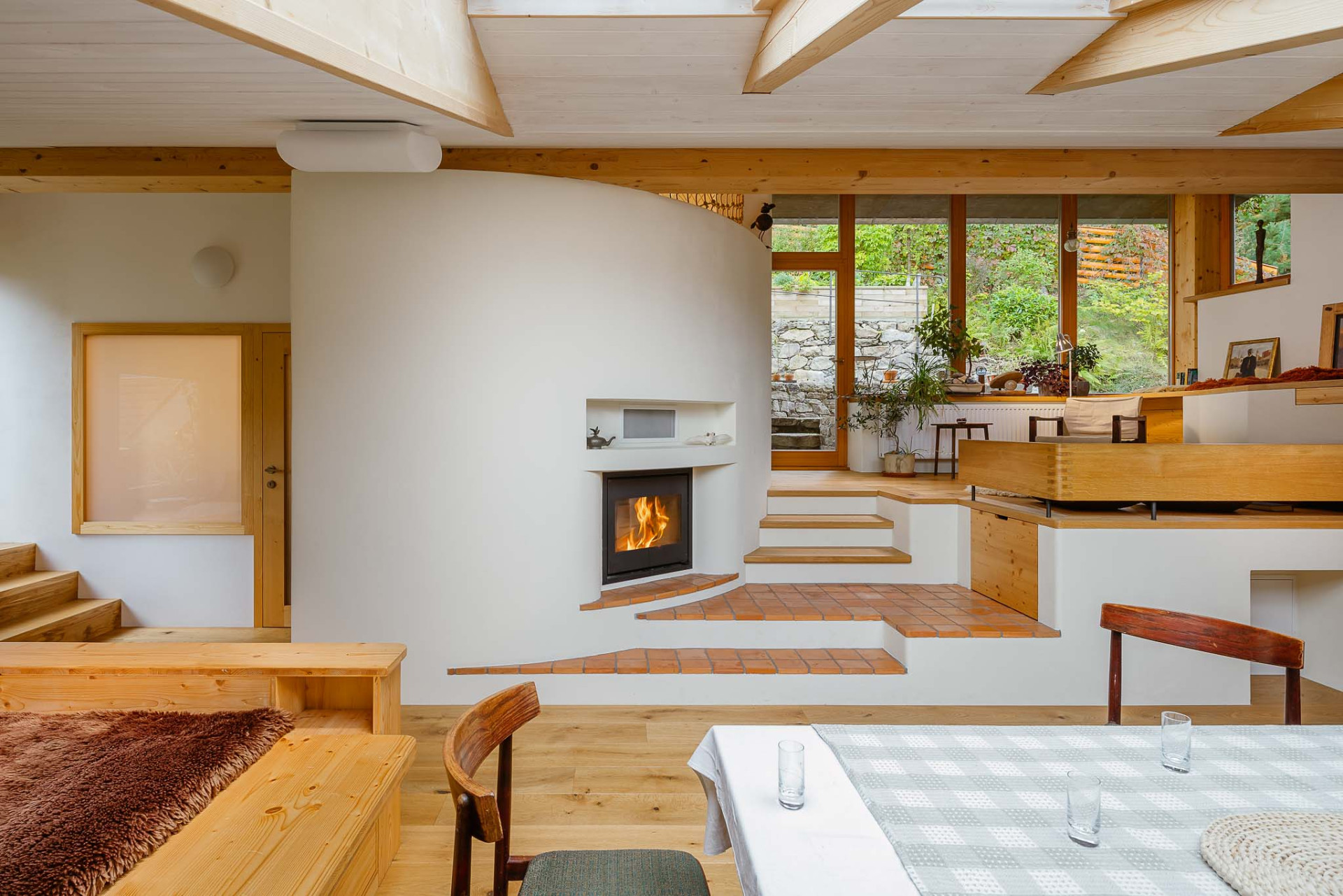 Pokračujeme dál a ocitneme se v hlavním otevřeném prostoru, kde se nachází kuchyň s jídelnou, dostatečně osvětlená sdruženým střešním oknem. Zajímavým na míru navrženým prvkem v této úrovni je lavice u jídelního stolu, která plynule přechází ve spací letiště částečně levitující nad zimní zahradou. Na hlavní obytnou část navazuje další úroveň, která je koncipována jako klidová a odpočinková. Vedou tam pobytové schůdky s malou mezipodestou, kterou lemuje oblá stěna se zabudovanou krbovou vložkou. Jednotlivé úrovně vrcholí výstupem na horní venkovní terasu.