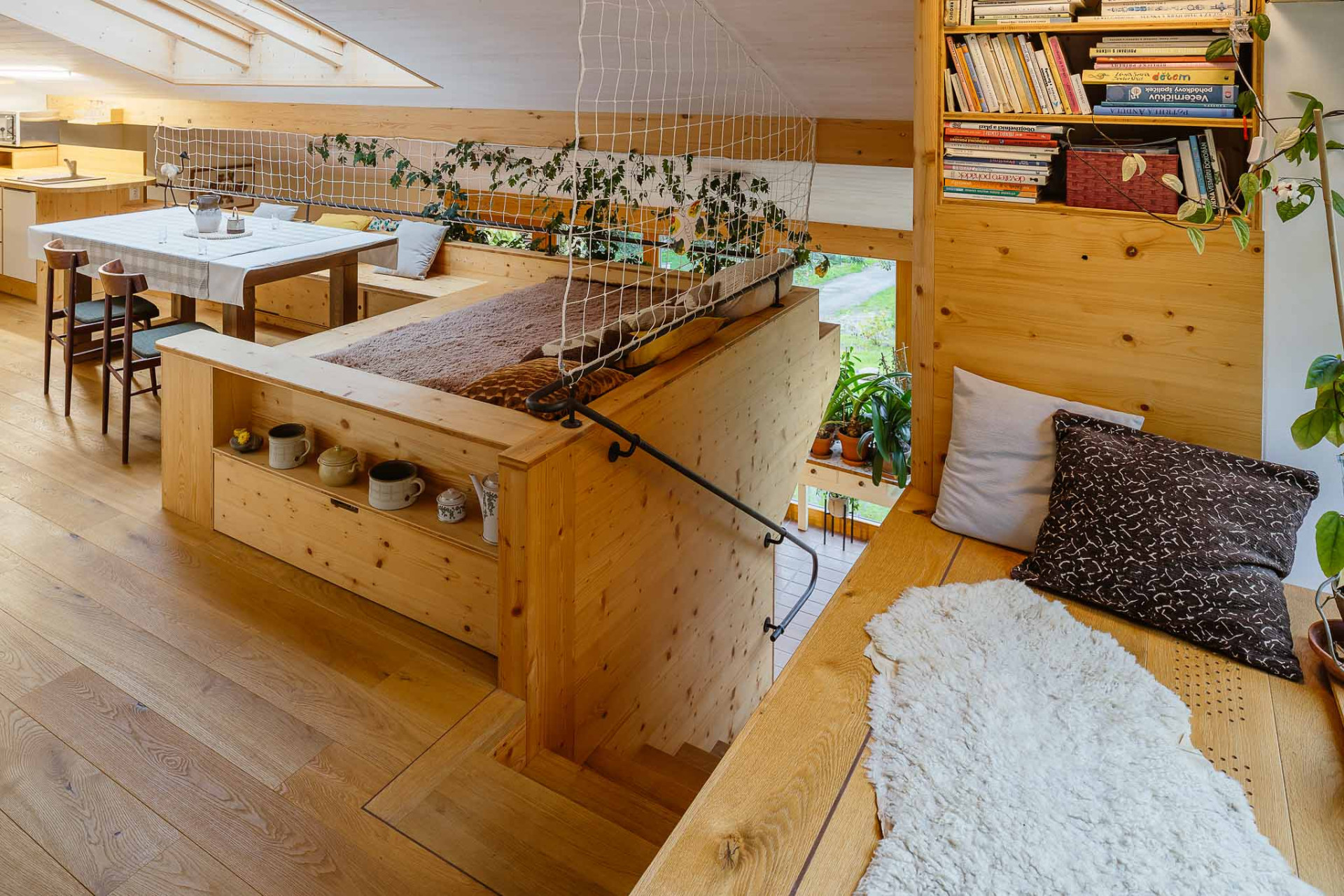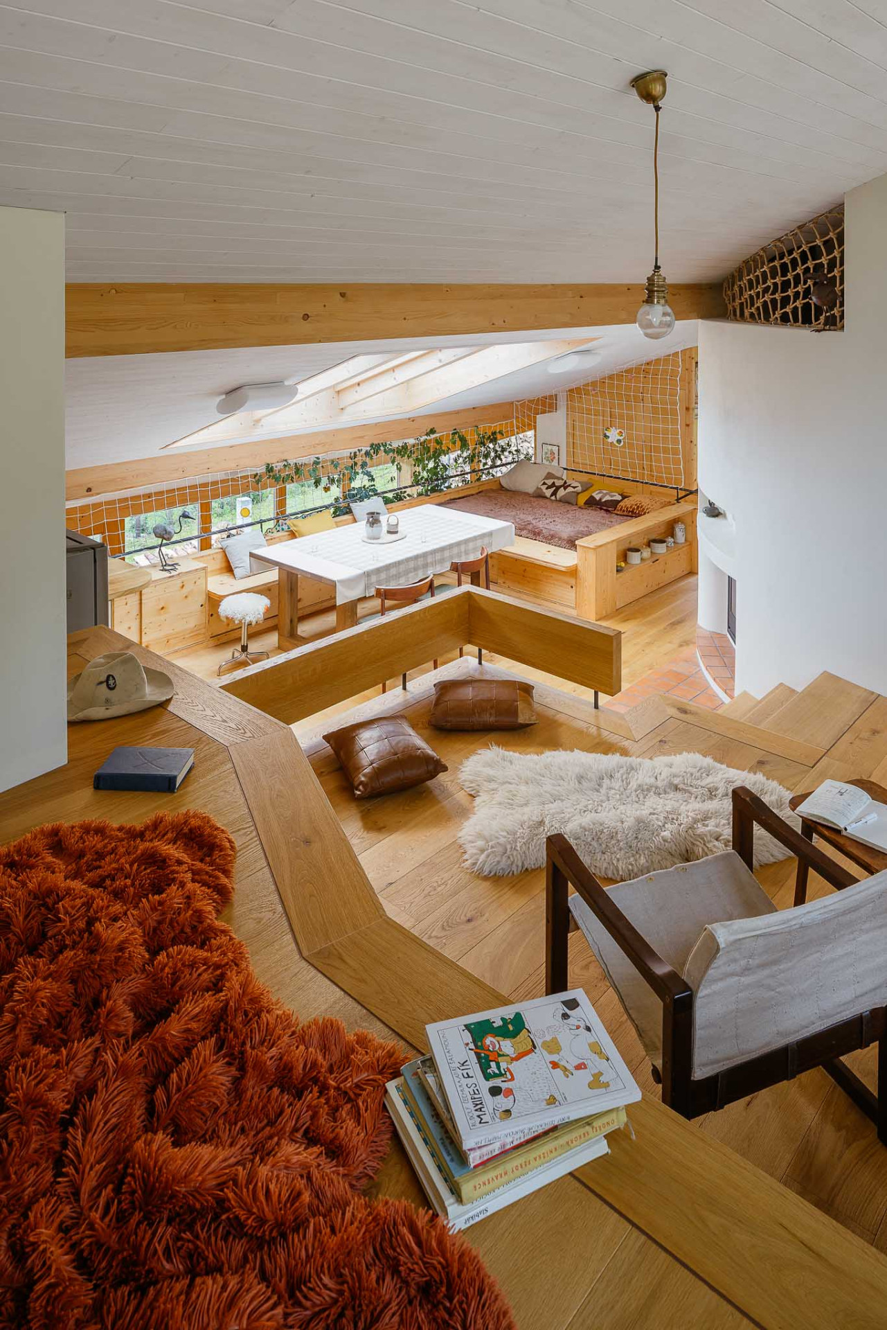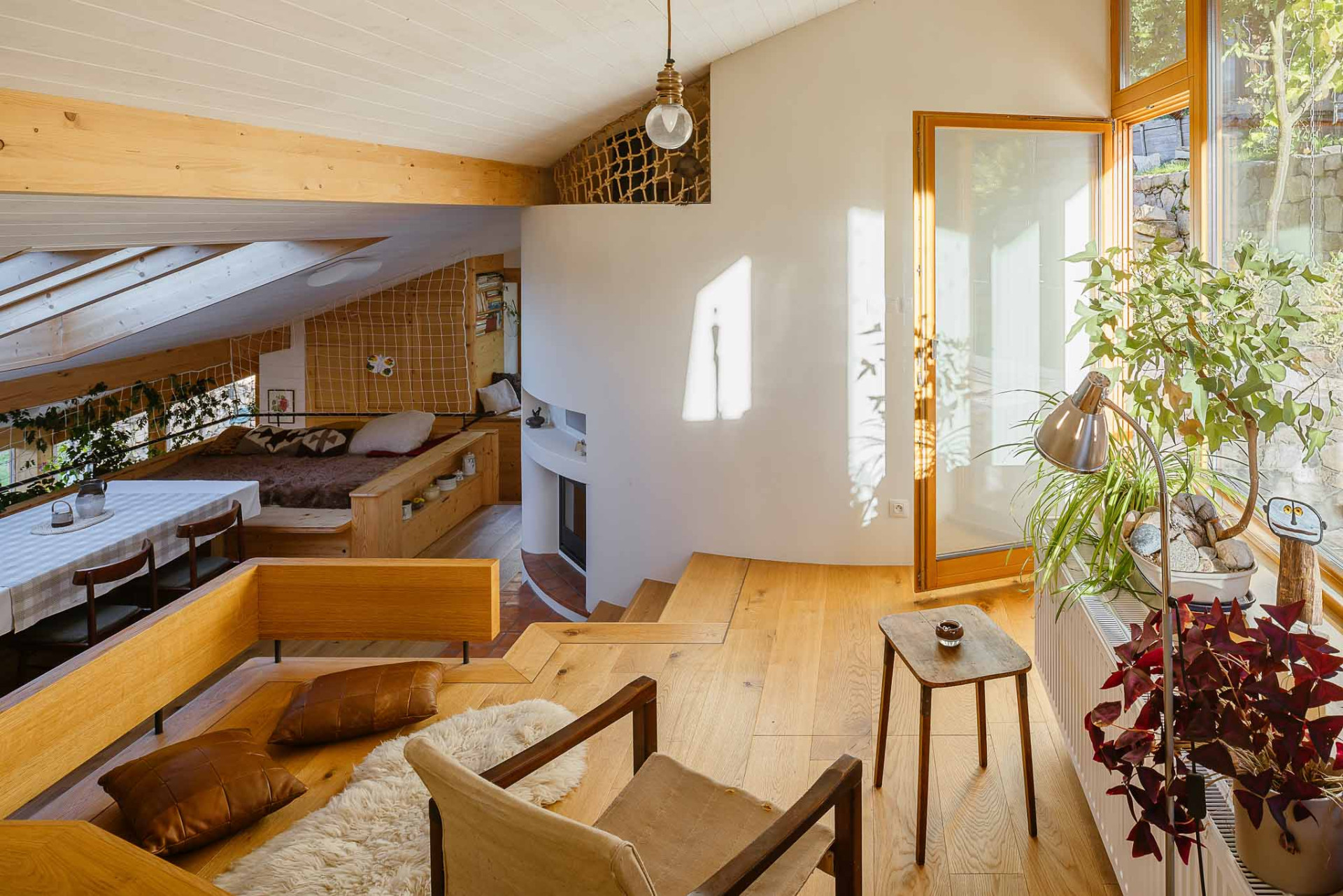 Pokračujeme dál a ocitneme se v hlavním otevřeném prostoru, kde se nachází kuchyň s jídelnou, dostatečně osvětlená sdruženým střešním oknem. Zajímavým na míru navrženým prvkem v této úrovni je lavice u jídelního stolu, která plynule přechází ve spací letiště částečně levitující nad zimní zahradou. Na hlavní obytnou část navazuje další úroveň, která je koncipována jako klidová a odpočinková. Vedou tam pobytové schůdky s malou mezipodestou, kterou lemuje oblá stěna se zabudovanou krbovou vložkou. Jednotlivé úrovně vrcholí výstupem na horní venkovní terasu.