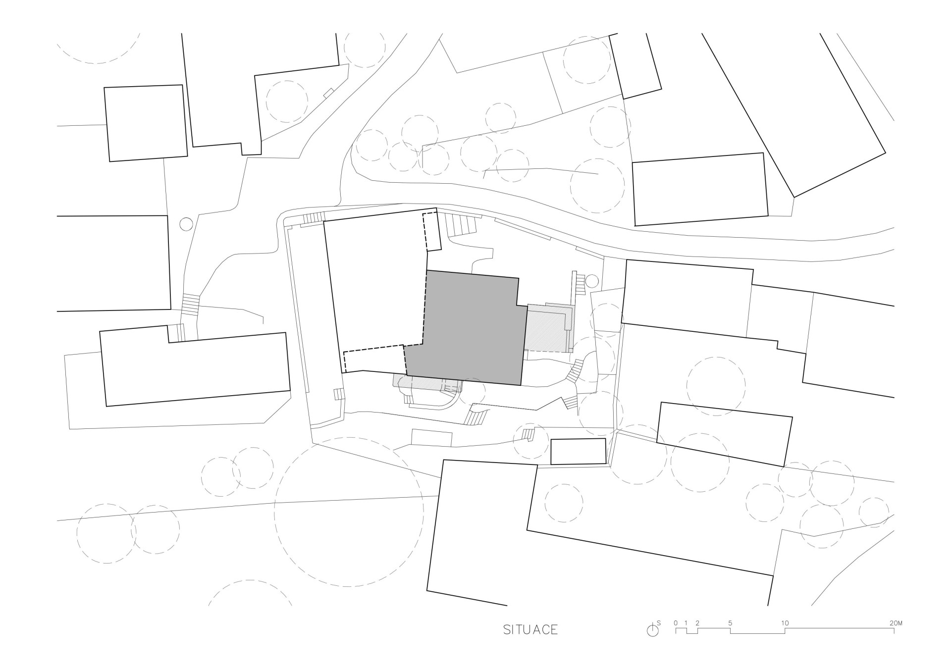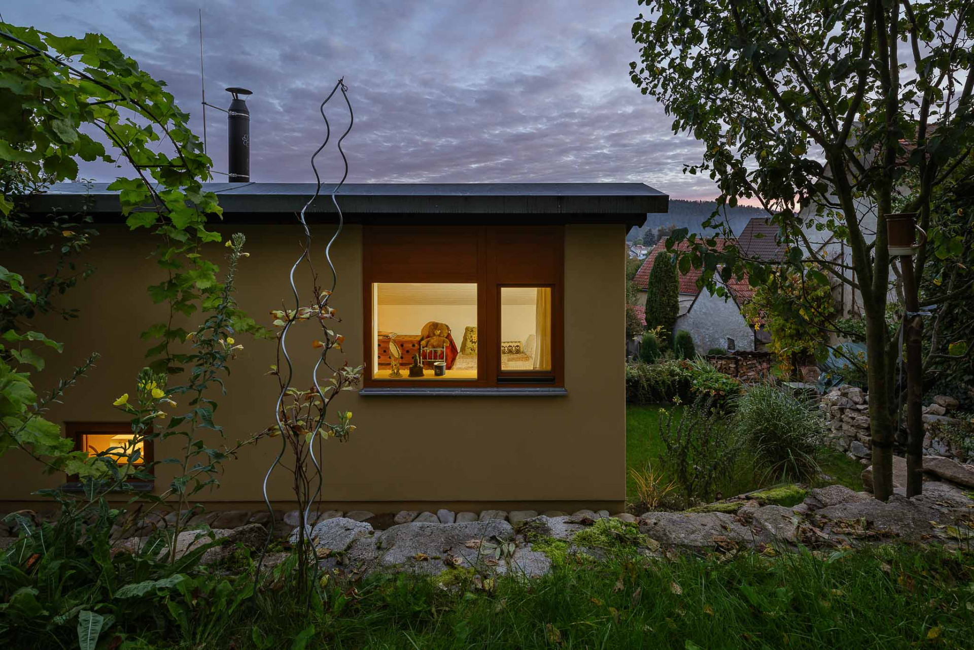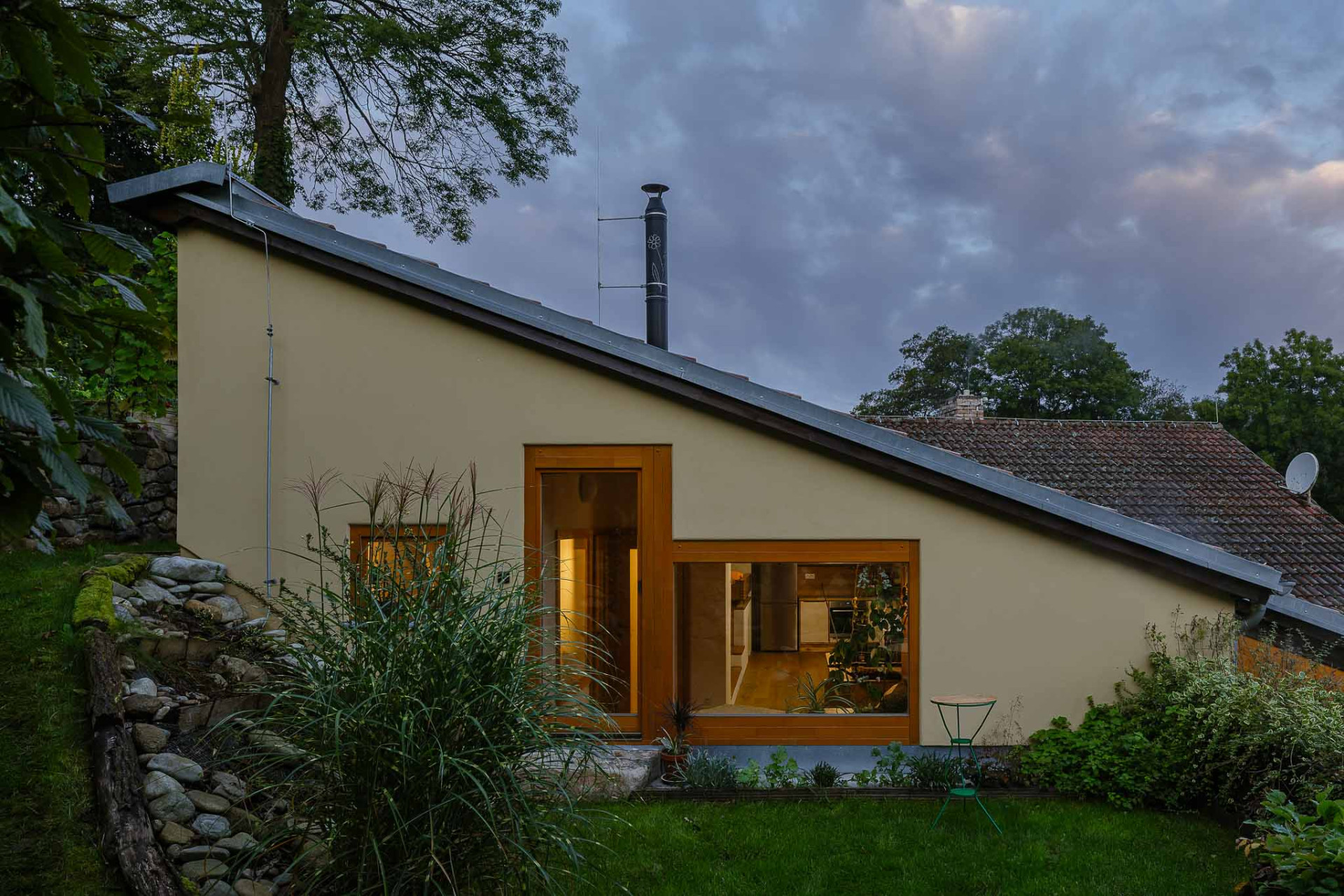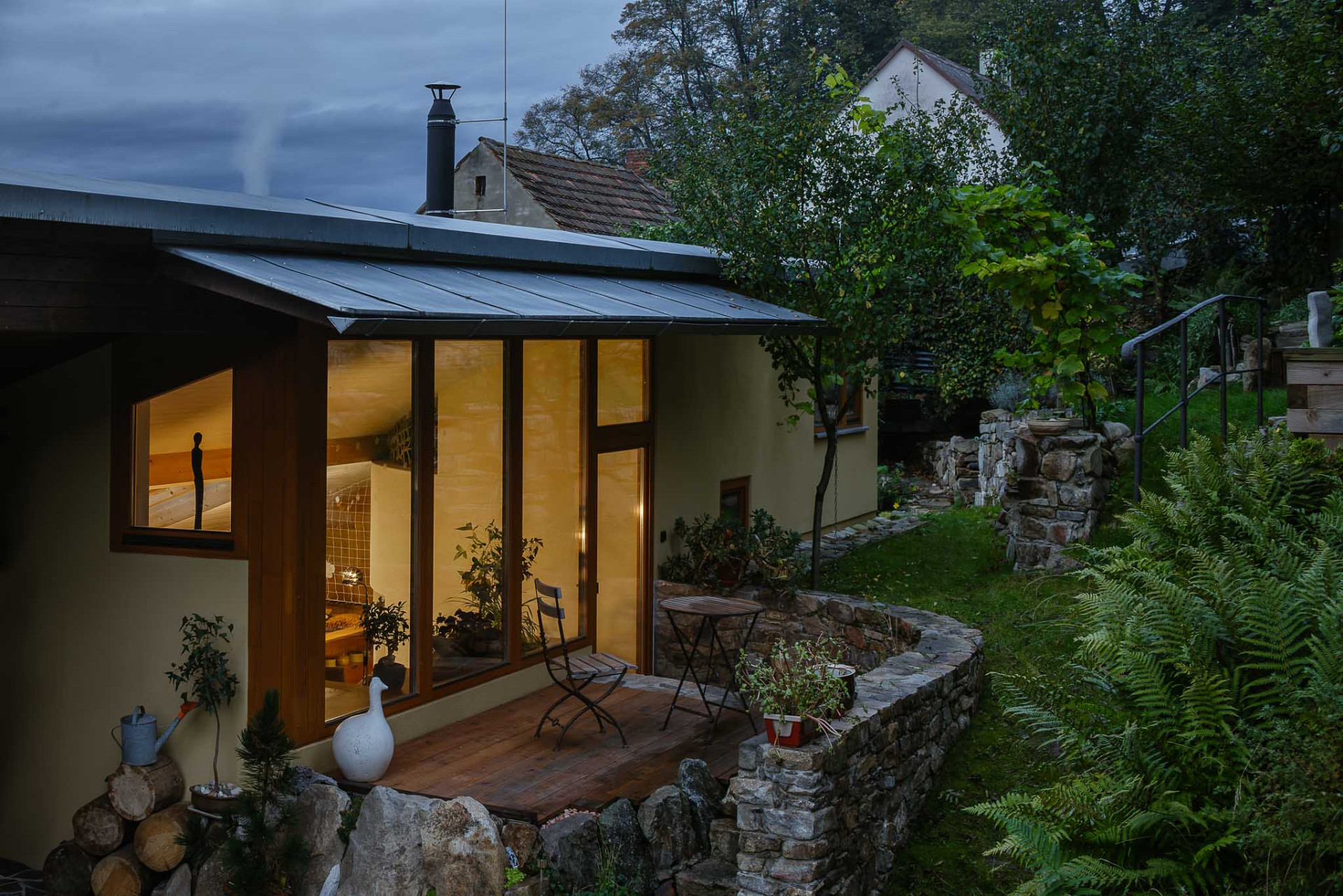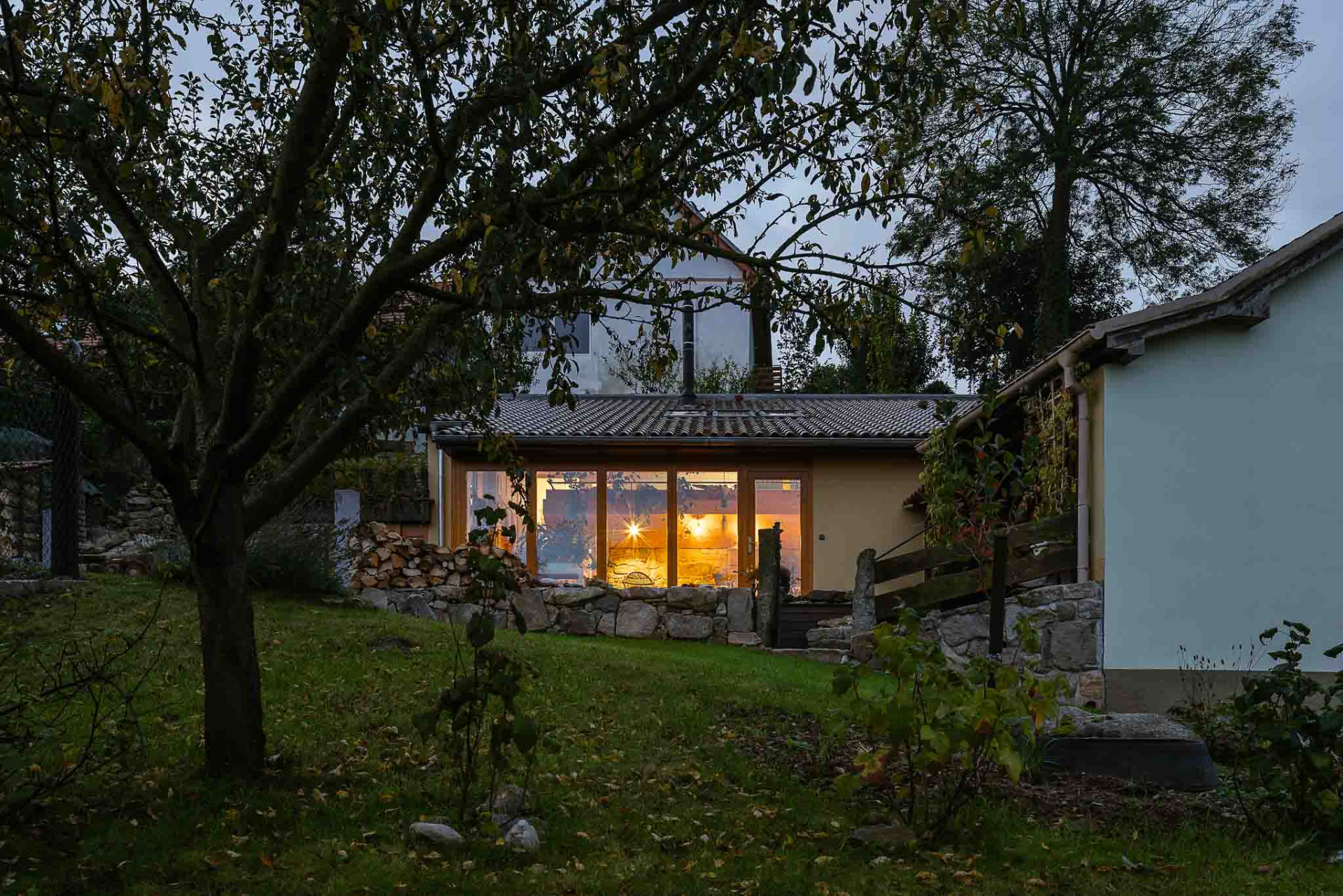 Architektům se podařilo vytvořit příjemné a nevšední zázemí pro život vícegenerační rodiny. Novostavba přirozeně sedí ve svahu v zahradě a skoro se tváří, jakoby tam byla odjakživa. Vnitřní uspořádání bytu je překvapivé a vnoučata se tam nejspíš nikdy nenudí.