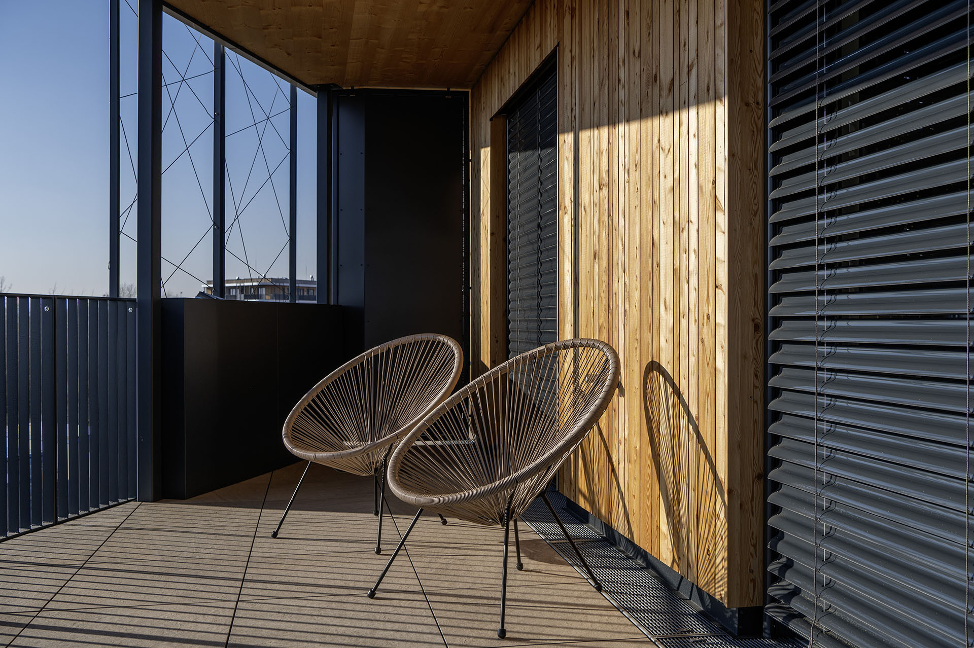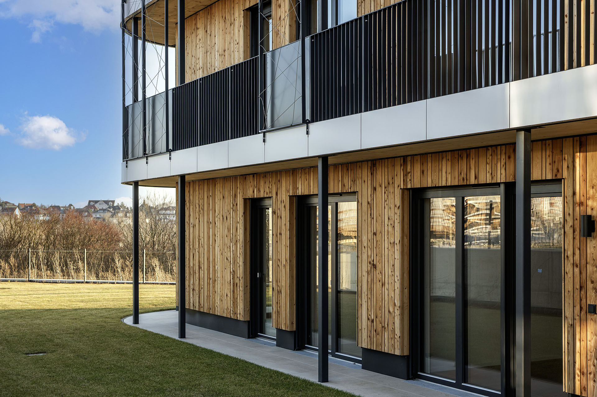 Fasáda je vyrobena ze sloupkové (KVH hranoly 60 x 200 mm) rámové konstrukce TBF (Two By Four) zaklopené z vnitřní strany protipožární sádrokartonovou deskou a z vnější strany sádrovláknitou deskou. Skladba je na vnitřní straně doplněna parozábranou, uprostřed je vložená izolace z minerální vlny. Stavební otvory vyplňují dřevěná okna s izolačním trojsklem (Uw = 0,76 W/m²K). Na straně balkonů je navržena provětrávaná fasáda s modřínovým obkladem. Ostatní části fasády jsou zatepleny kontaktním zateplovacím systémem, v kterém byla použita minerální vata jako izolant.