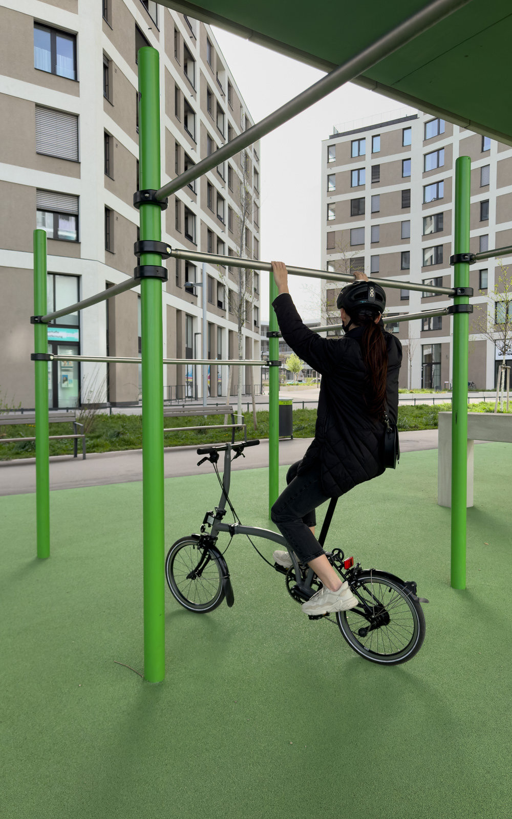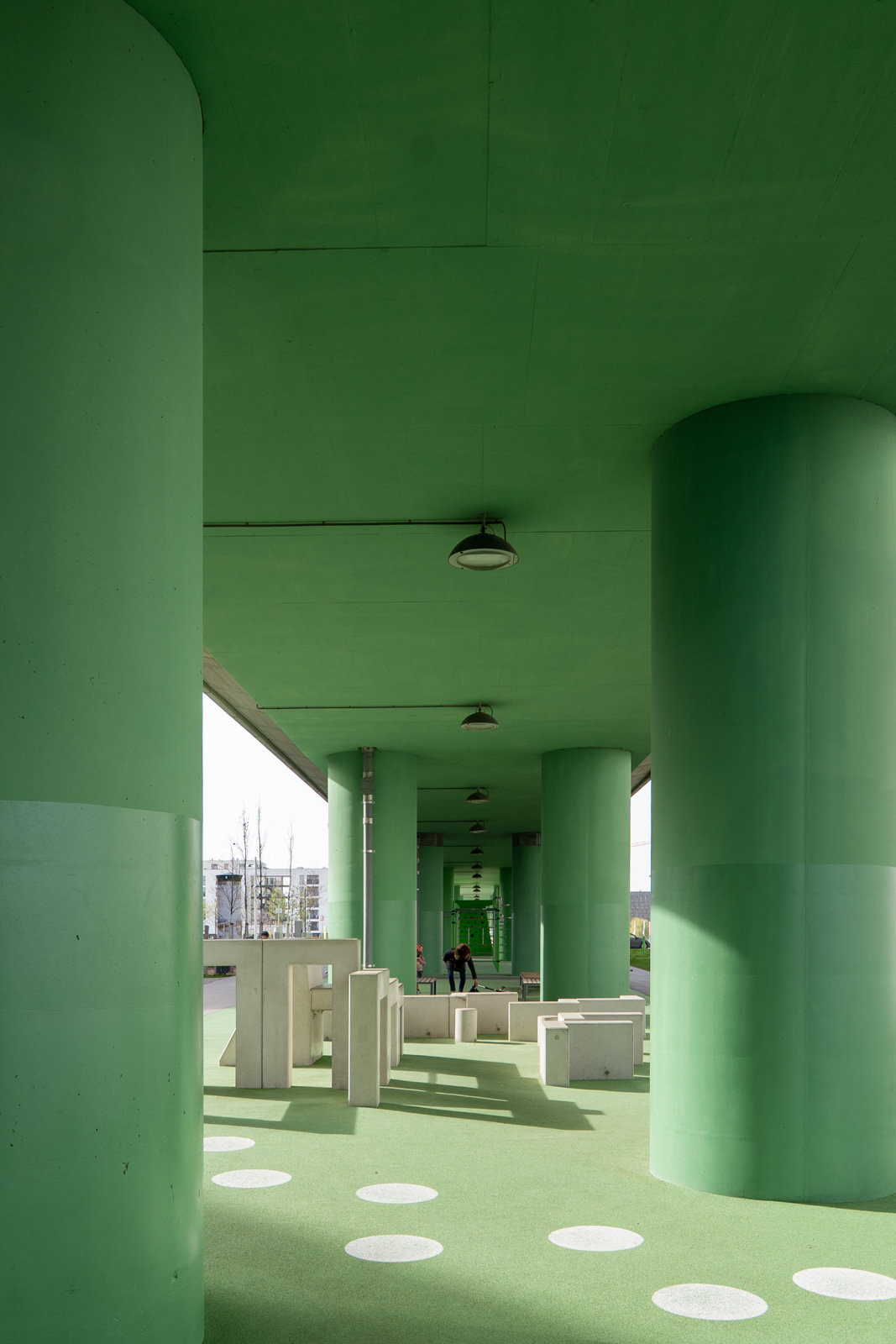 Právě tato platforma slouží jako přístřeší, pod kterým najdeme v délce mnoha stovek metrů sportoviště různých typů, ať už se bavíme o basketbalu, fotbalu, lezecké stěně, work-out hřištích nebo různých dalších prostorách s lavičkami a dalším mobiliářem. Sytý zelený jednolitý nátěr láká do těchto míst návštěvníky i vizuálně.