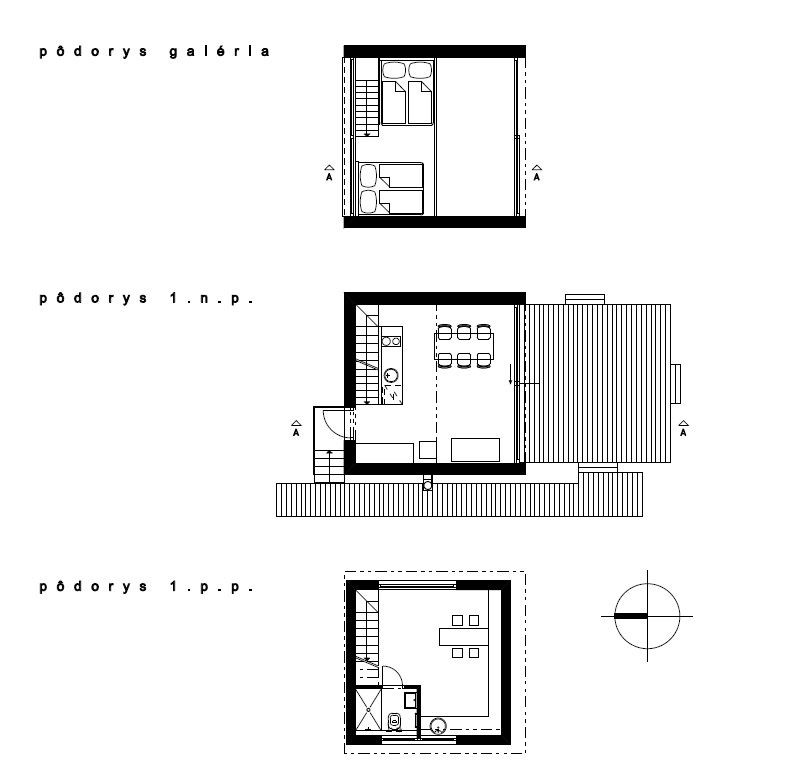 V přízemí stavby je umístěna kuchyň s jídelnou a vstupem na dřevěnou terasu. Nad ním najdeme i spací galerii se čtyřmi lůžky. Druhé patro je vybudováno ale jen nad polovinou půdorysu.