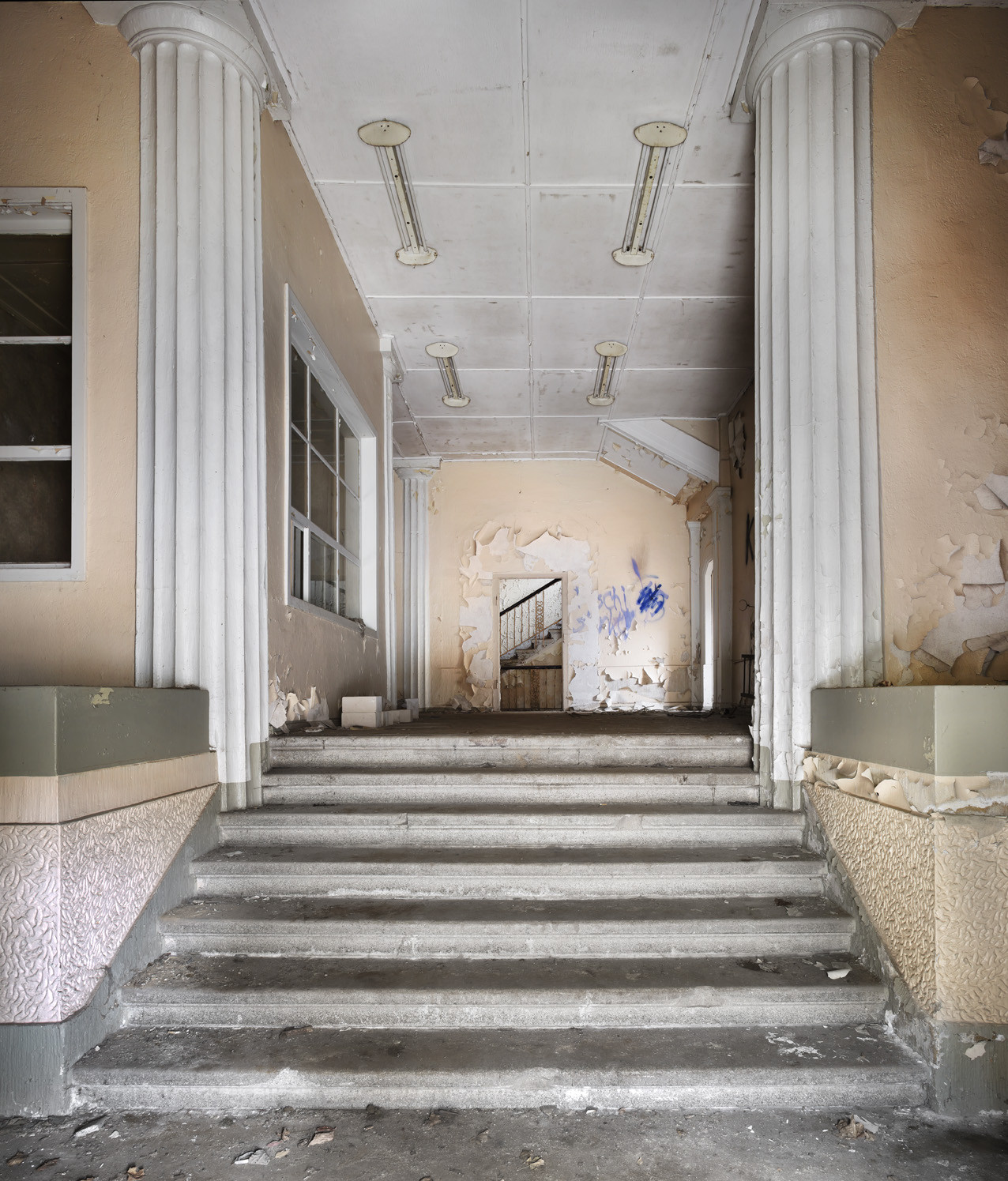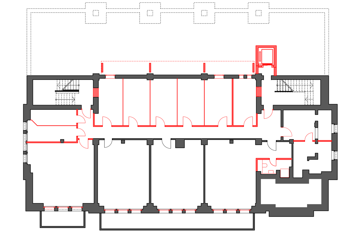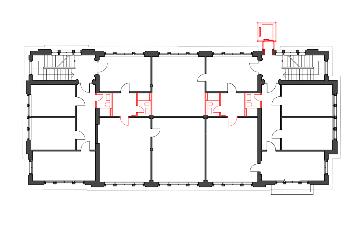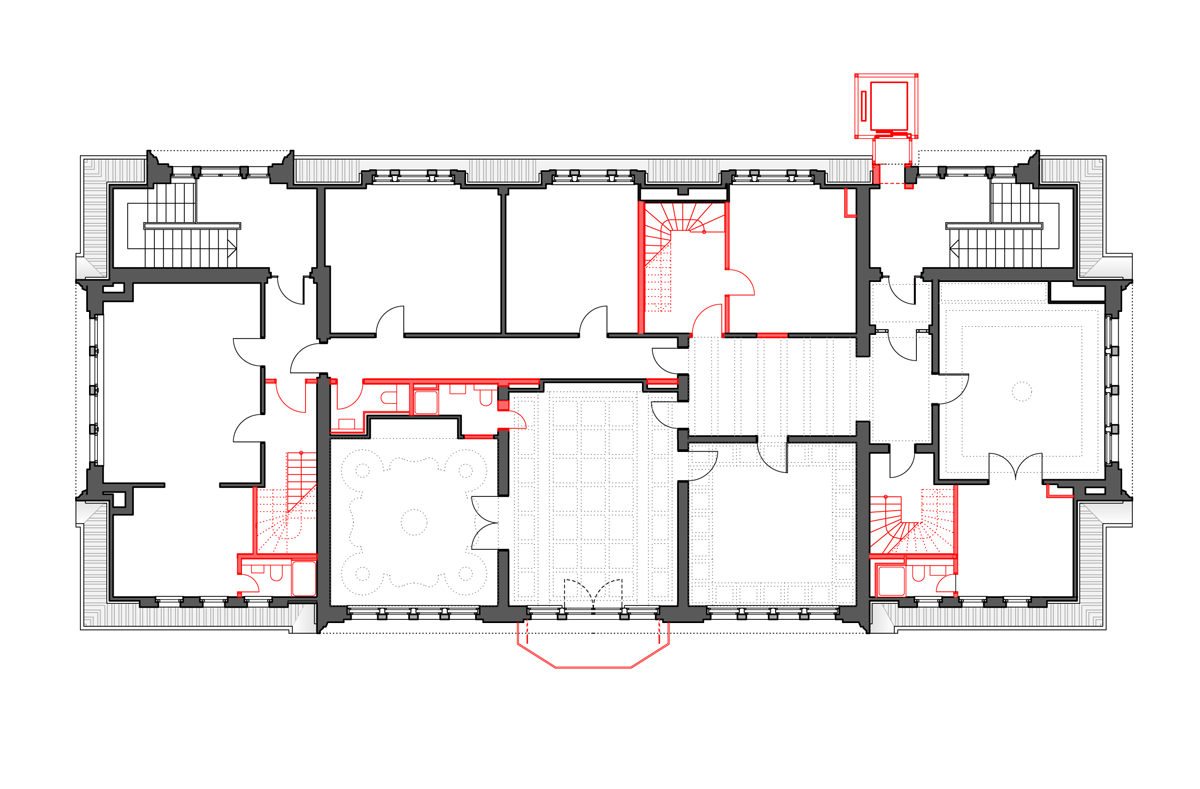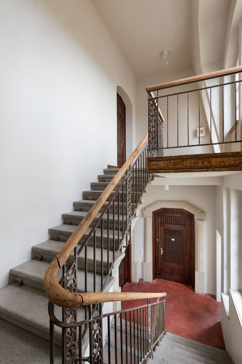 V prvním a druhém patře se nacházely kanceláře, a tak to také zůstalo. „Cílem bylo využít budovu tak, aby se nemusela příliš měnit,“ vysvětluje architekt. Kanceláře jsou oproti vestibulu strohé. Mají jednoduché bílé omítnuté stropy a zdi a zrenovovaná špaletová okna. Z budovy vyzařuje historie, která fasicnuje i Christofa Schuberta. Ve své kanceláři má řadu upomínek na staré časy vily – třeba fotografie rodiny Heike nebo originální katalog masokombinátu z 30. let.