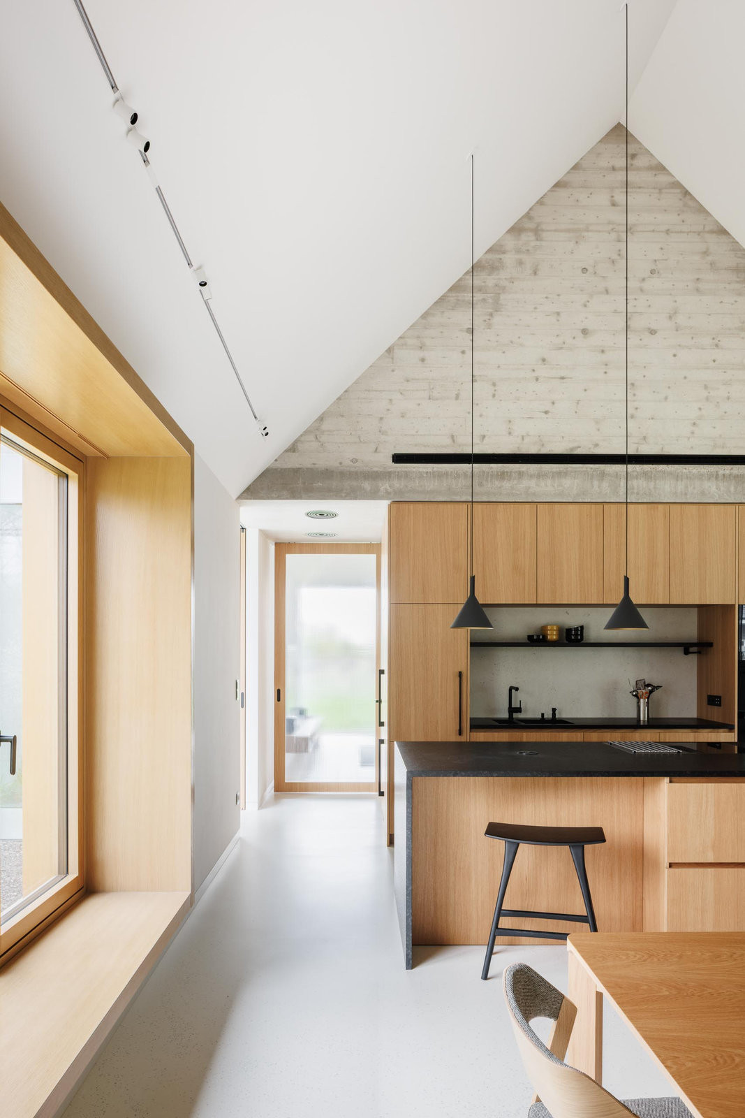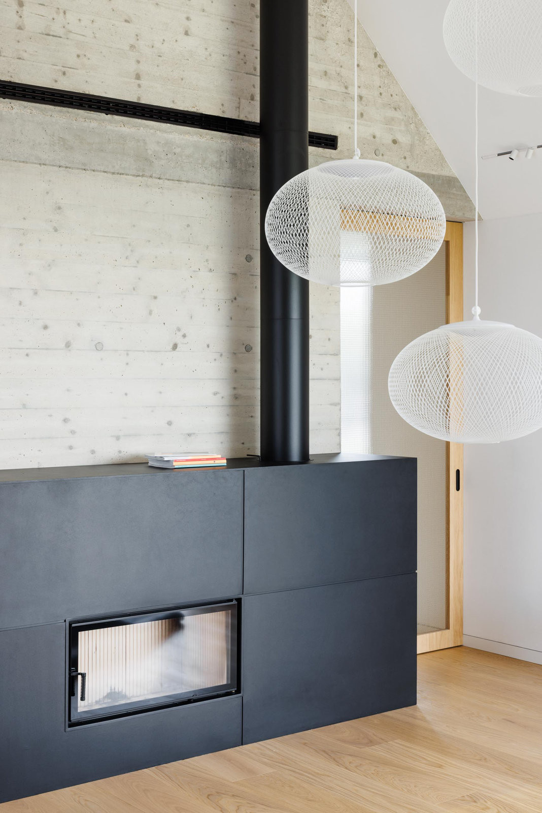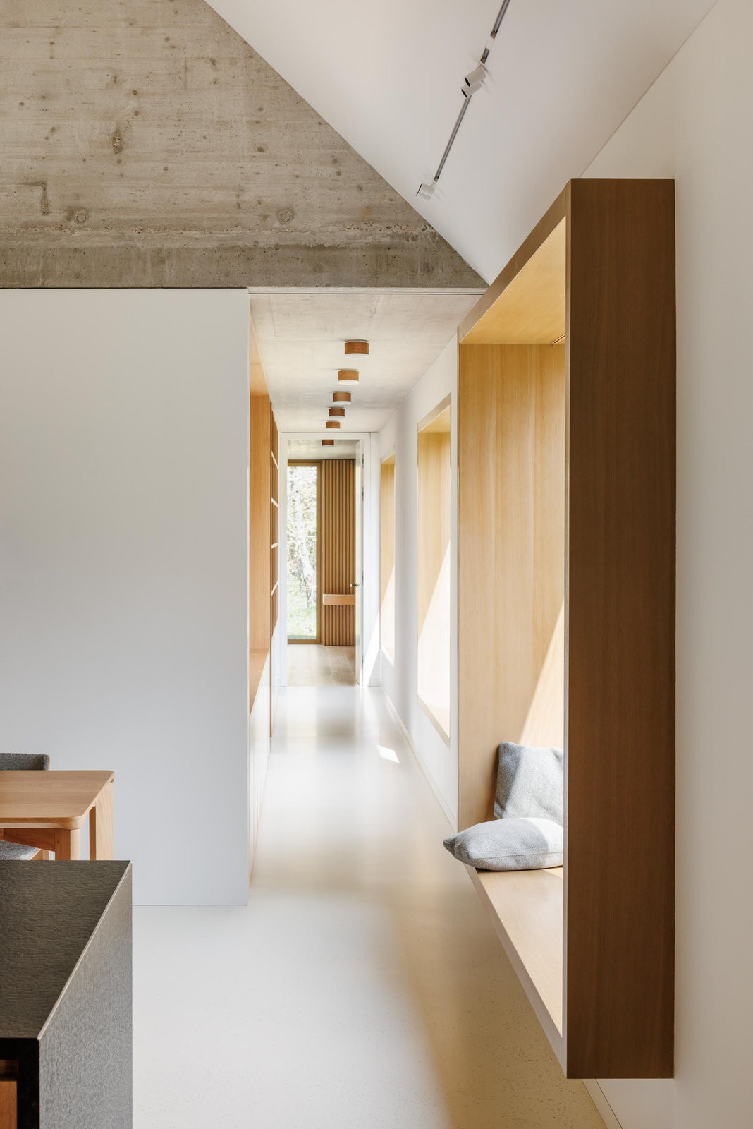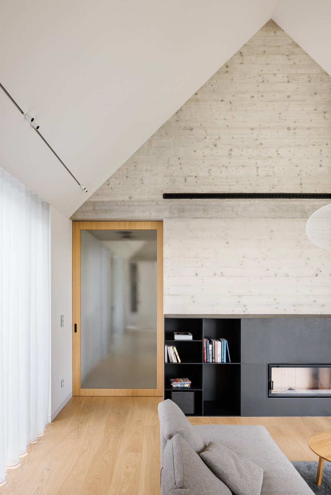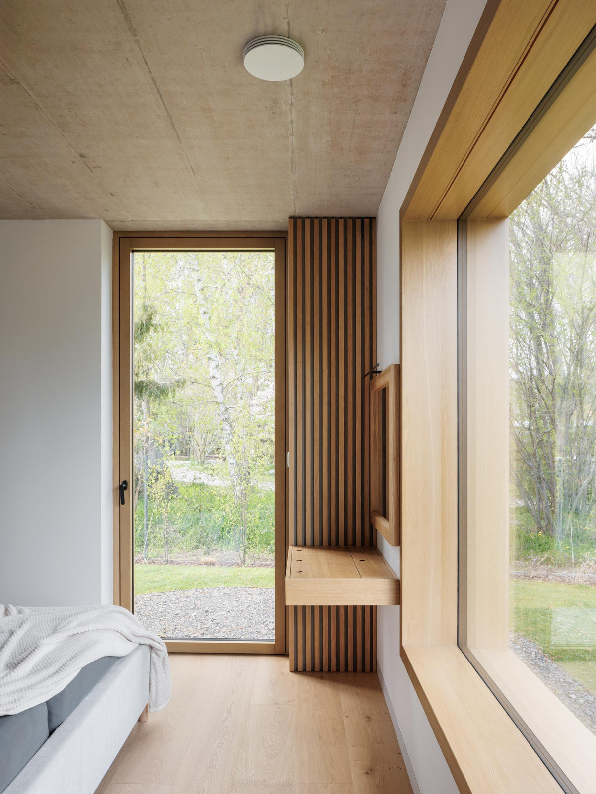 Terasa je propojená s velkým obývacím pokojem a jídelnou - srdcem celého domu. Na ni navazuje noční část rodičů, orientována do tišší části pozemku, směrem k lesu. Krčkem se prochází do domu dětí – je tu společný vstup s knihovnou a pak samostatné pokoje. Všechny místnosti mají okna přesně nasměrovaná na nejlepší výhledy. Vůbec je interiér plný promyšlených detailů: působivé je třeba rohové velkoformátové okno, anebo parapet, na němž je možné posedět jako na lavici.