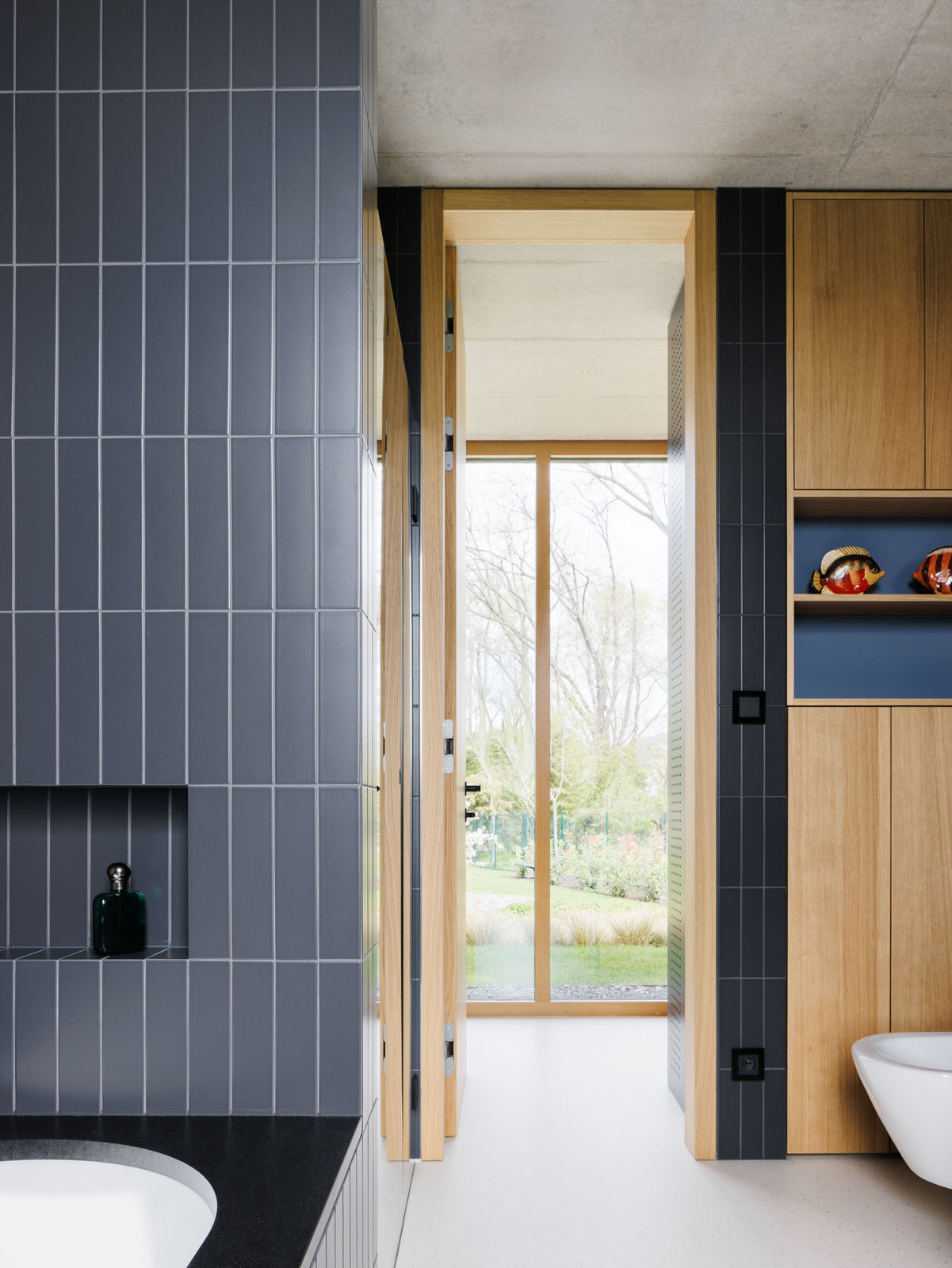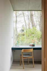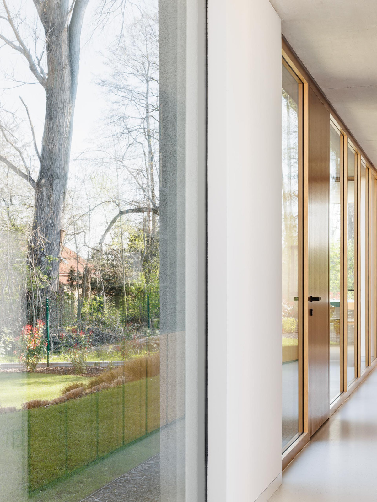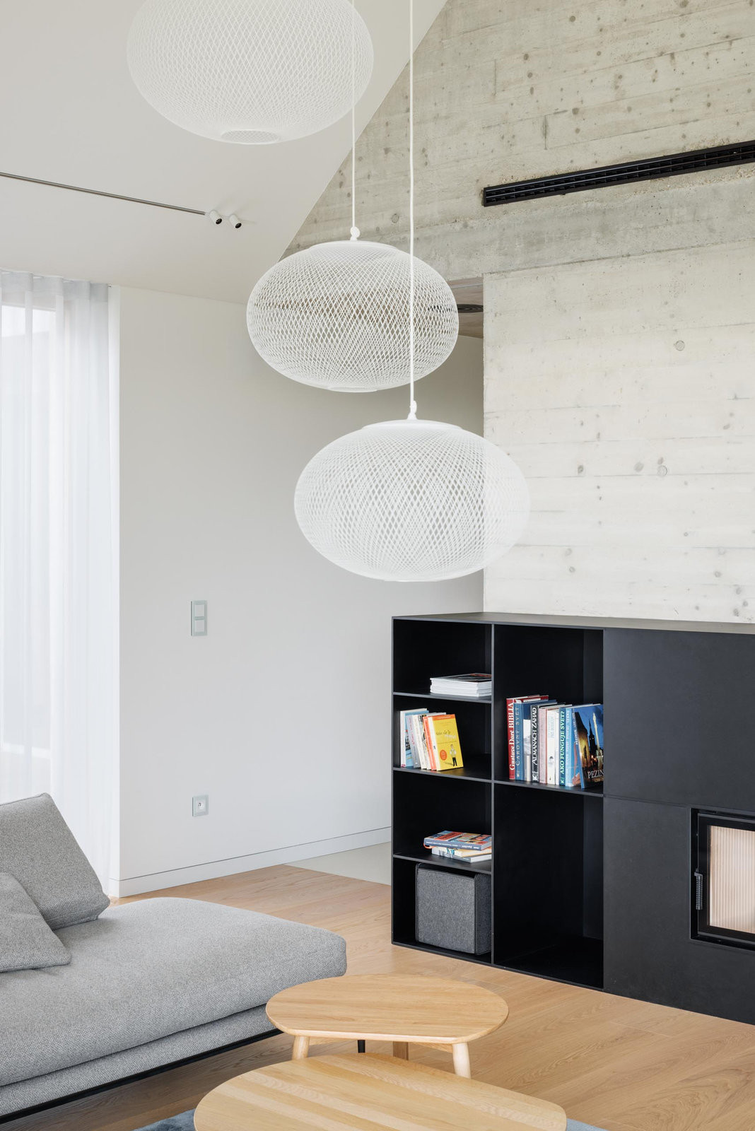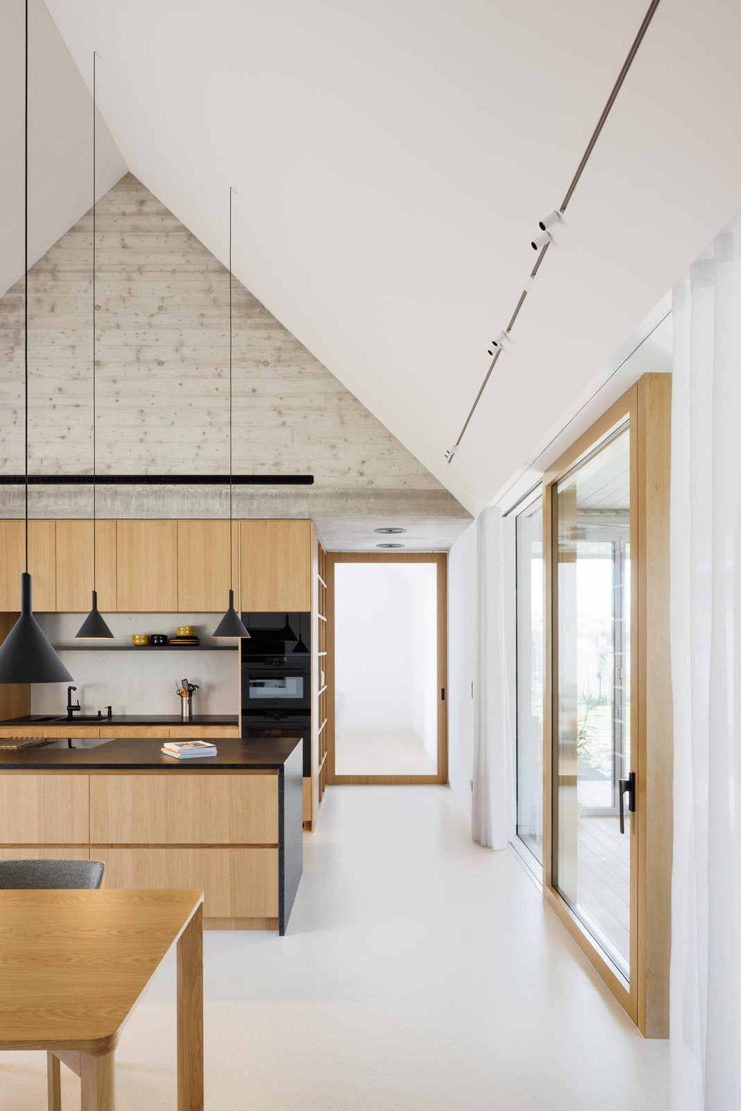 Terasa je propojená s velkým obývacím pokojem a jídelnou - srdcem celého domu. Na ni navazuje noční část rodičů, orientována do tišší části pozemku, směrem k lesu. Krčkem se prochází do domu dětí – je tu společný vstup s knihovnou a pak samostatné pokoje. Všechny místnosti mají okna přesně nasměrovaná na nejlepší výhledy. Vůbec je interiér plný promyšlených detailů: působivé je třeba rohové velkoformátové okno, anebo parapet, na němž je možné posedět jako na lavici.