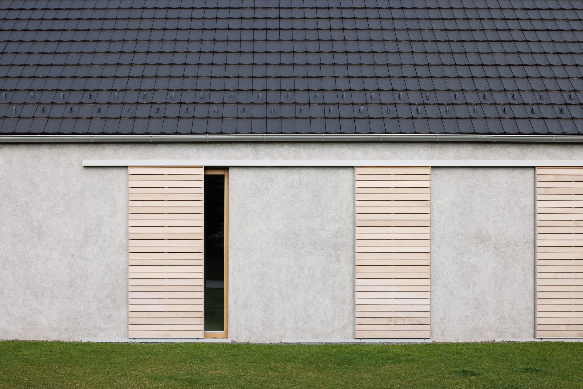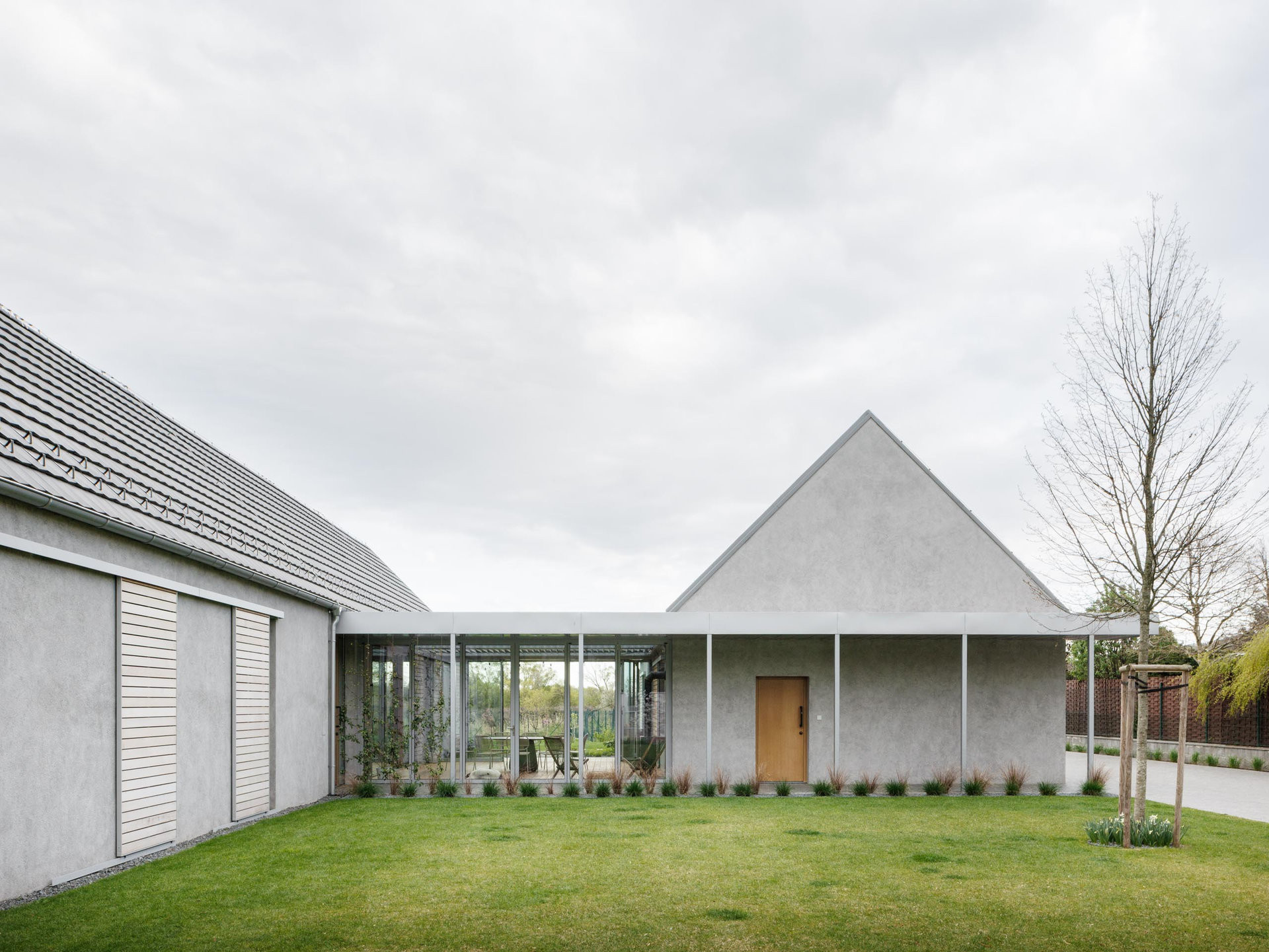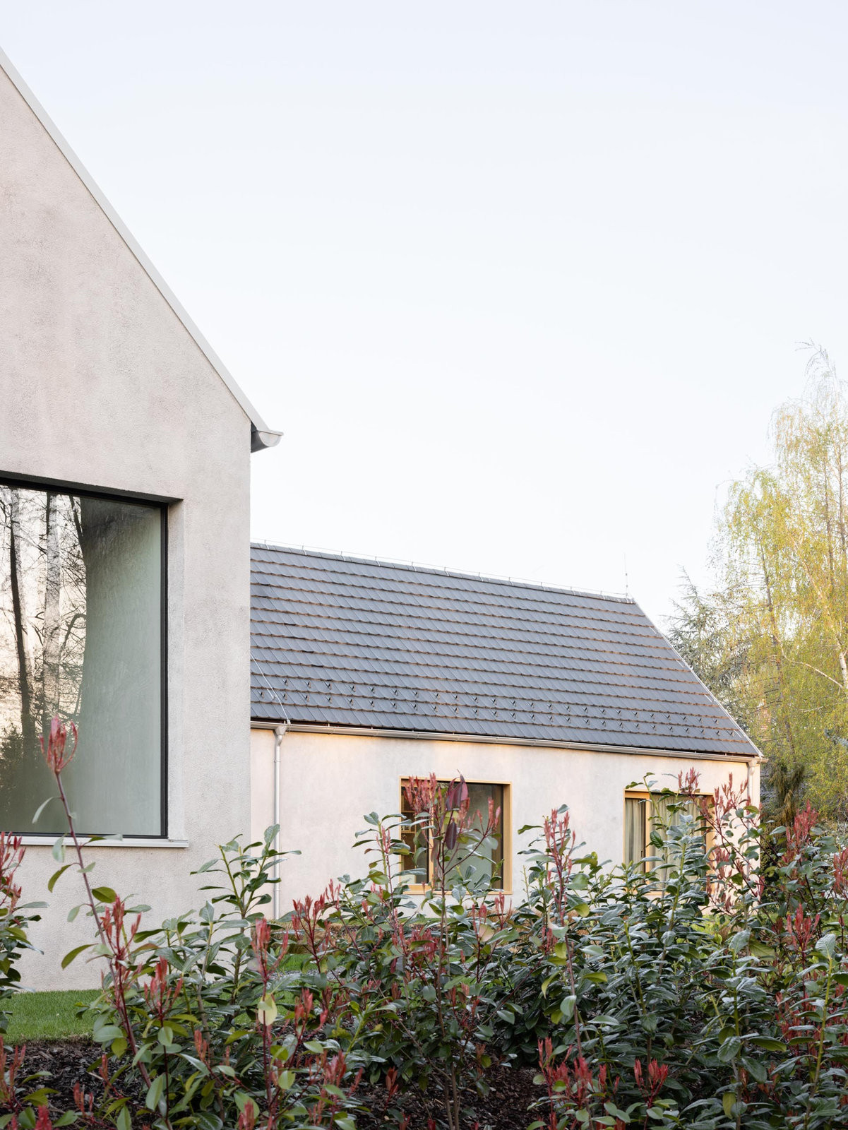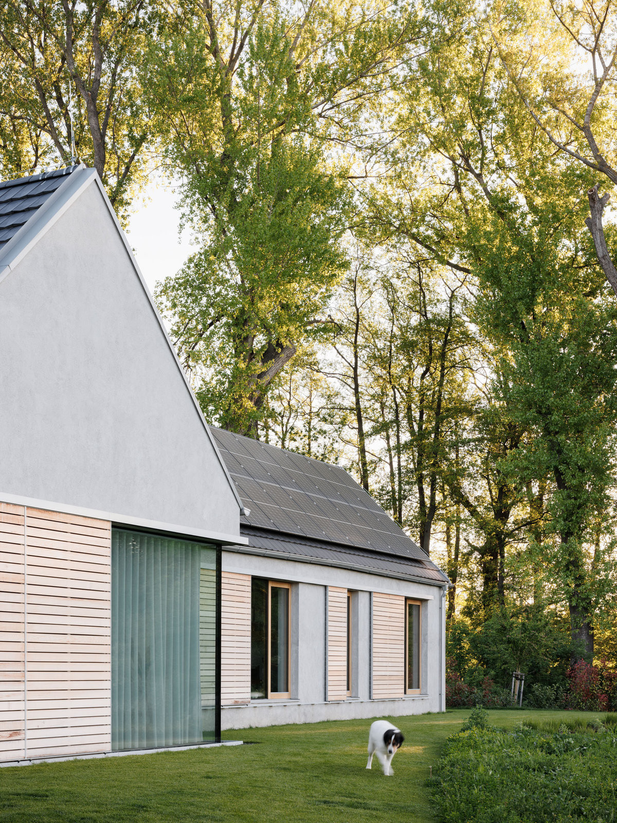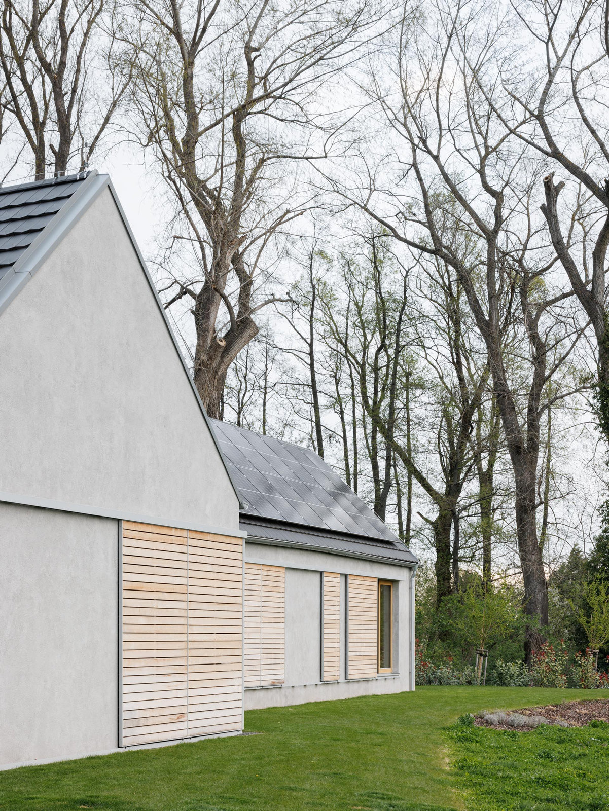 Co se týče materiálů, hledali architekti „přirozené řešení, které v tomto prostředí bude působit, jako by tu bylo odjakživa.“ Proto je použitá škrábaná hrubozrnná omítka, pálené tašky a dřevěné okenice. Objemy, tvar a materiály se zkrátka přizpůsobily kontextu a výsledná stavba je důkazem, že i rozlehlé a komfortní sídlo se dá vybudovat s respektem k místu.