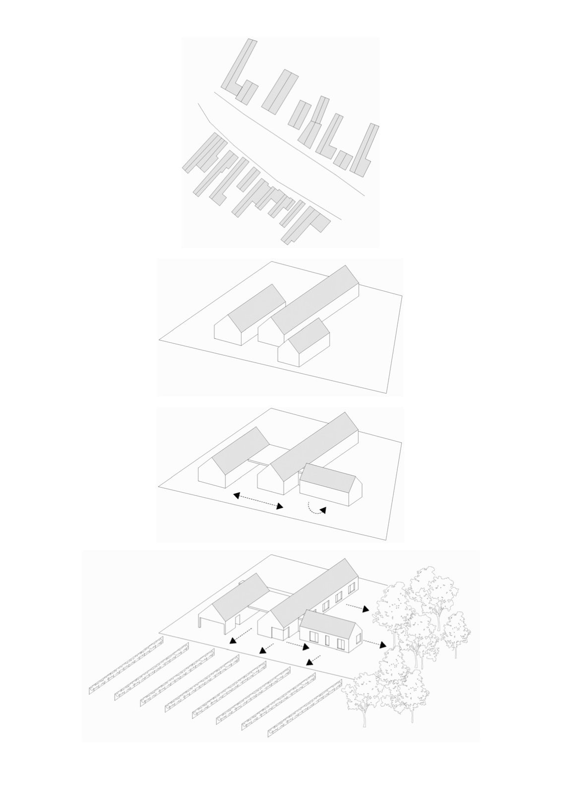 „Koncept vychází z původní sídelní struktury – jádro vesnice tvoří dlouhé domy se sedlovými střechami, řazené vedle sebe na úzkých parcelách,“ popisují architekti. Výhodou tohoto „miniurbanismu“, jak půdorysné řešení nazývají, je vznik tří zahrad s různou atmosférou: „Jižní zahrada je orientovaná do vinice, východní zahrada má výhled na les a vstupuje sem ranní slunce, a pak je tu ještě ozeleněný vstupní dvůr,“ popisují architekti.