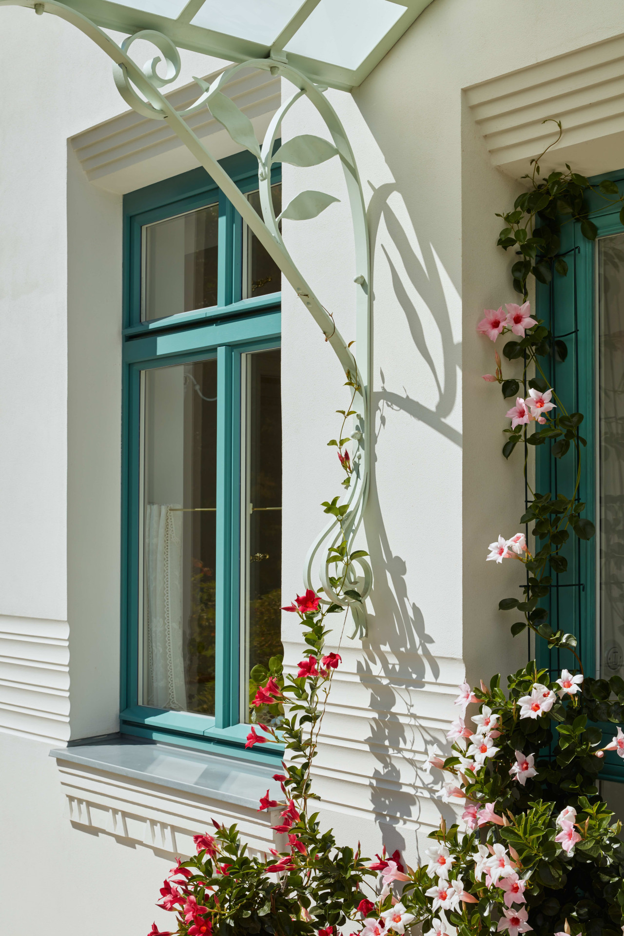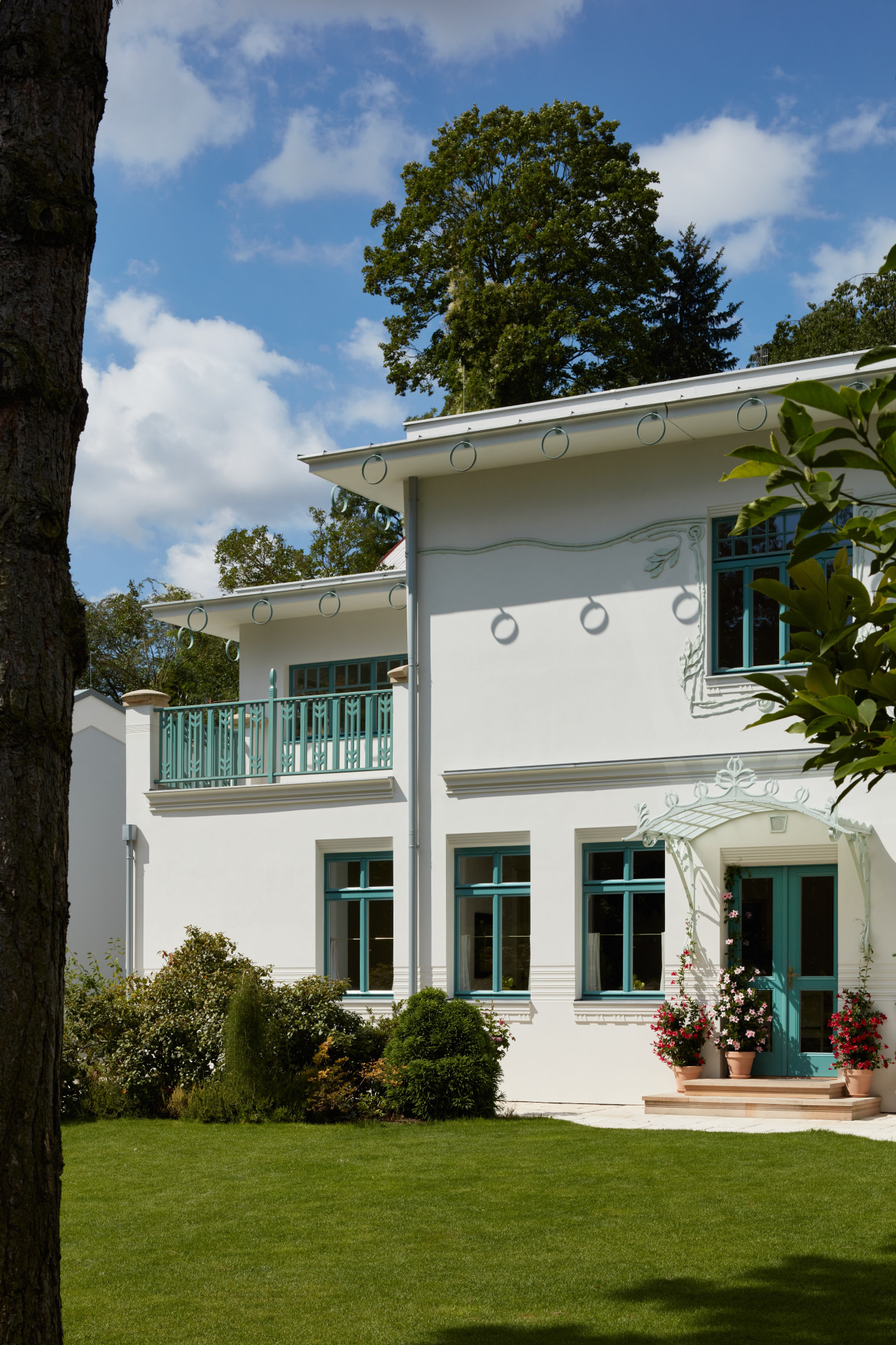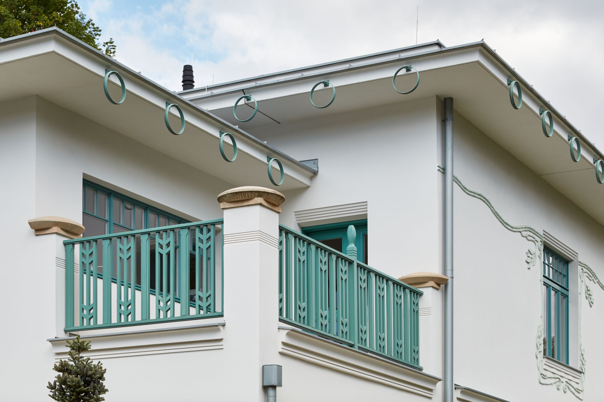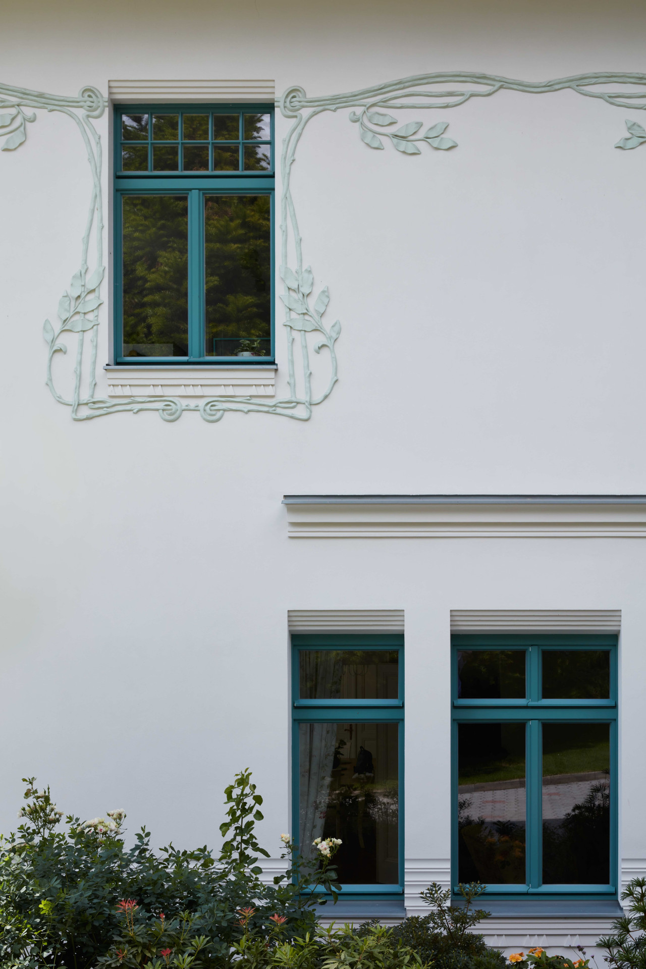 Nedochovanou fasádu do její původní podoby přivedla firma specializující se na obnovy historických staveb. K rekonstruování všech prvků se přistupovalo s maximální důsledností. Výrazný podíl na tom nese angažovanost investorů, kteří objížděli Kotěrovy stavby a hledali na nich příbuzné prvky, jaké znali z plánů ke své vile. Povedlo se jim najít například shody v rozměrech a členění oken, u štukových dekorací pak byly převzaty jejich rozměry, zkoumala se také barevnost. „K ozdobám pod okny jsem si třeba dělal polystyrenové modely, abych našel ty správné proporce a kompozici,“ říká Milan Kožíšek. Kromě Trmalovy, Fröhlichovy nebo Máchovy vily, které Kotěra vyprojektoval právě kolem roku 1902, se některé formálně příbuzné znaky podařilo najít také na průčelí Peterkova domu na Václavském náměstí, které Kotěra navrhl pro stejné investory jako v případě vily v Roztokách.
