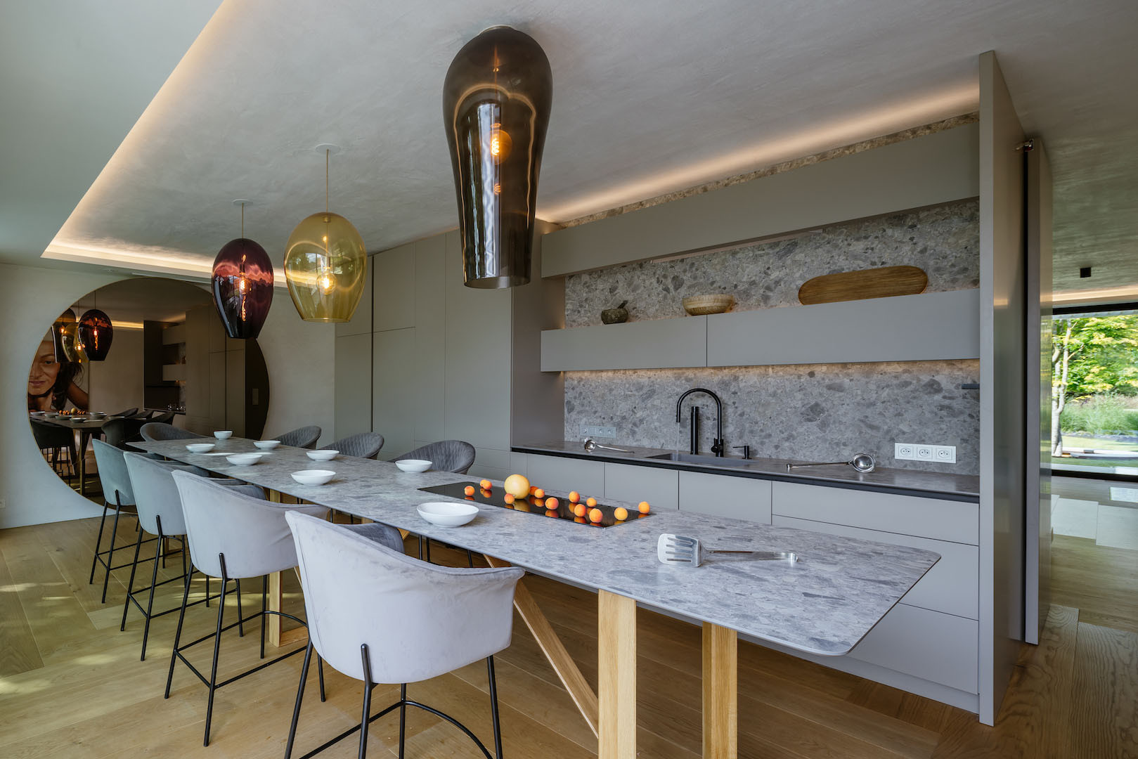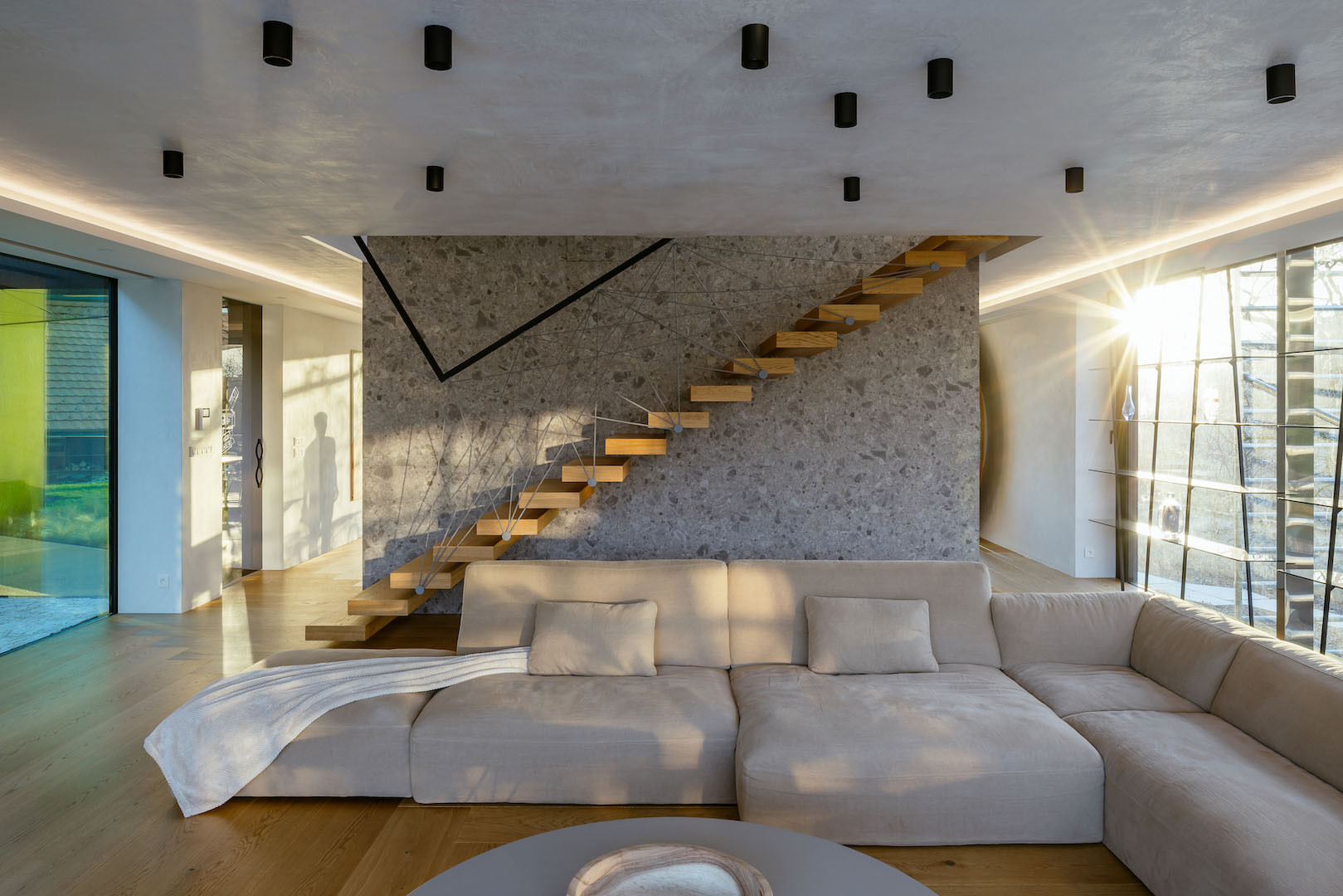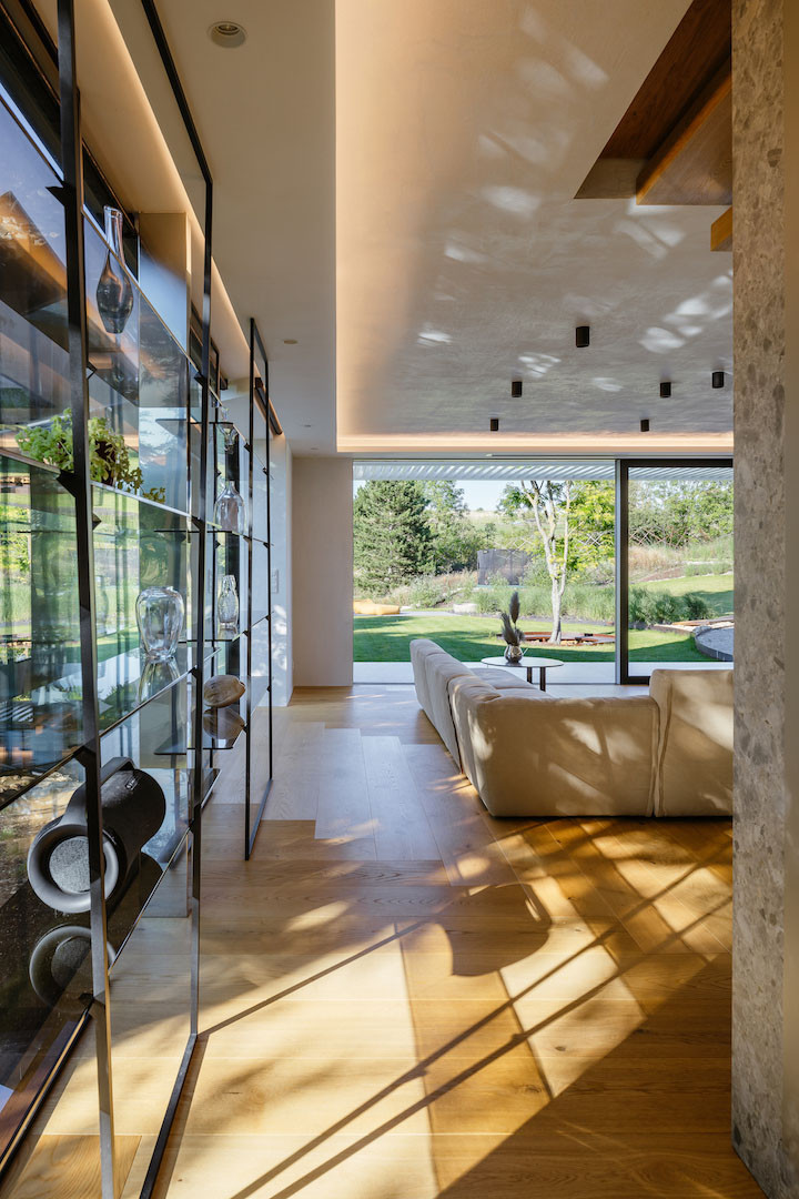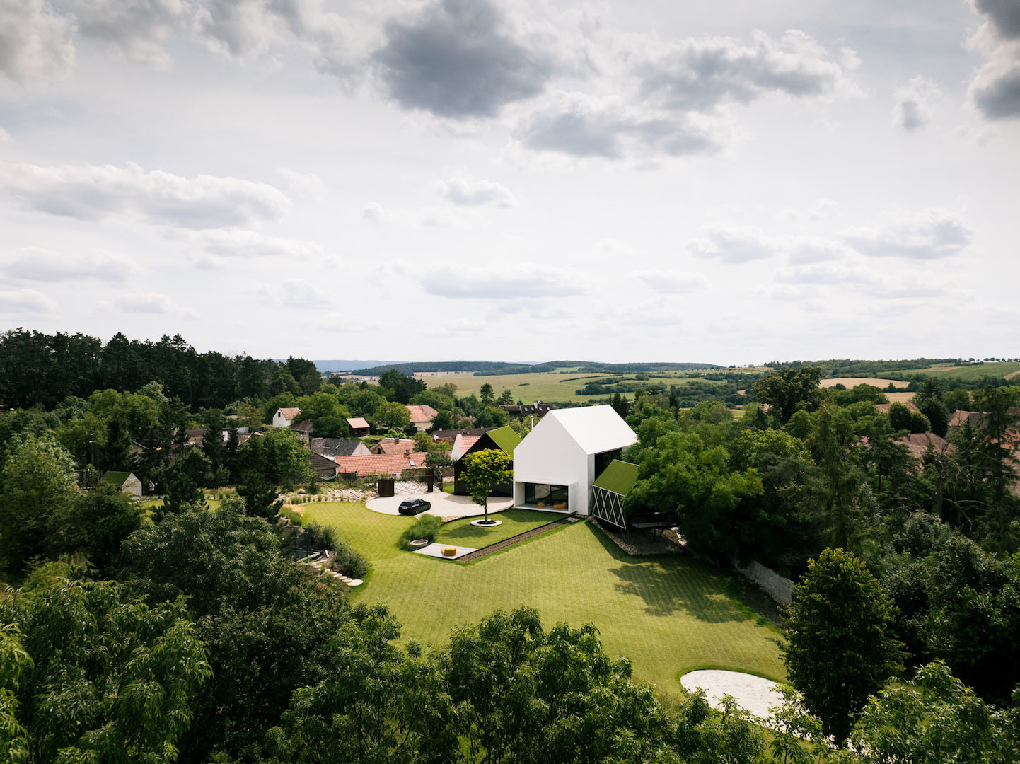 Kvůli řadě prvků by zapadla mezi luxusní stavby Los Angeles nebo třeba španělského pobřeží Costa del Sol. Ve zkratce jsou to třeba velkorysé převýšené prostory, masivní schodiště levitující v obývacím pokoji, nebo nestandardní nábytek na míru. Nikde v zahraničí ale vila nestojí, nachází se u nás v Česku, konkrétně v Trněném Újezdě v okrese Beroun. Lokalitě ostatně přizpůsobuje svou hmotovou kompozici. Architekt Martin Sladký konkrétně říká, že doplňuje jádro obce, které tvoří pět starých statků.
