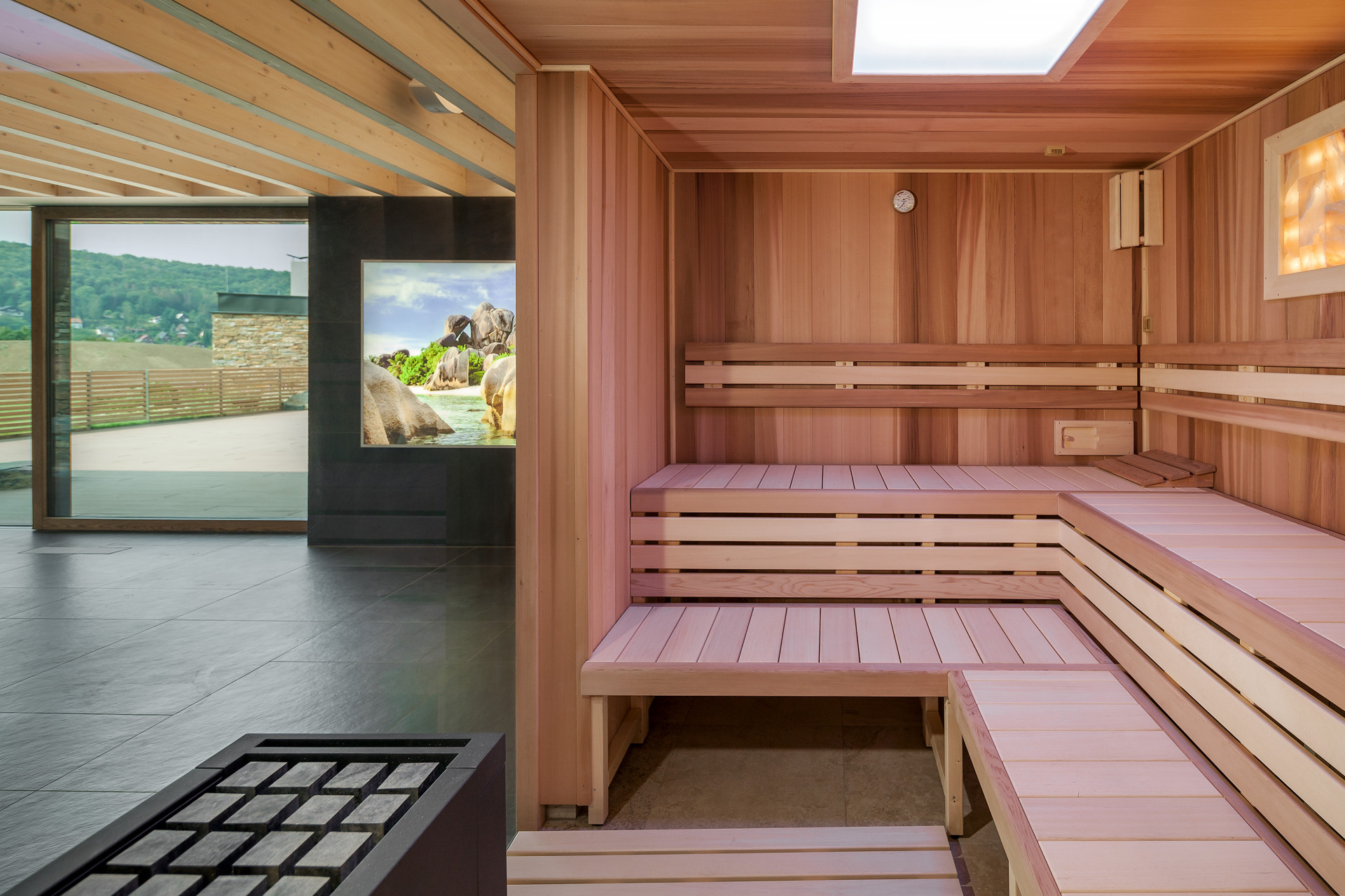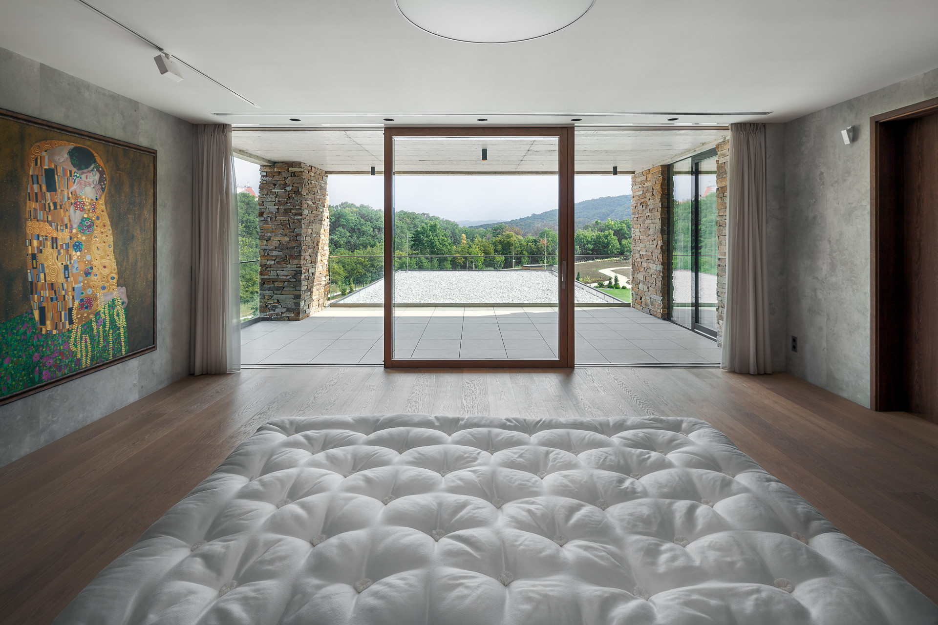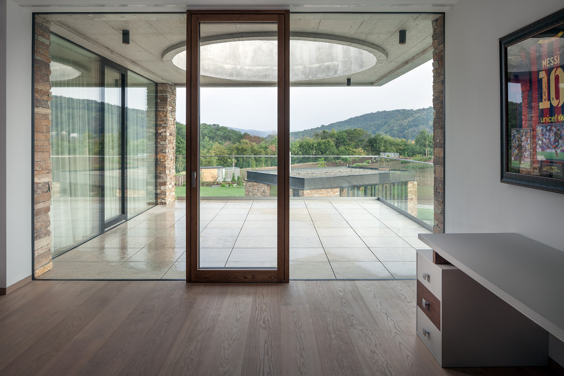 Tvrdá kamenná slupka je směrem do zahrady narušena velkými prosklenými plochami, která do jednotlivých pokojů přivádí světlo a zároveň interiér propojují s exteriérem. Obývací pokoj s kuchyní, jídelnou a barem je možné díky posuvným oknům otevřít venkovní palubě. Vlastní terasy pak mají i ložnice v prvním patře. Přírodní materiály nakonec pronikají i do ladění interiérů, hlavní roli v nich zastává masivní dřevo.