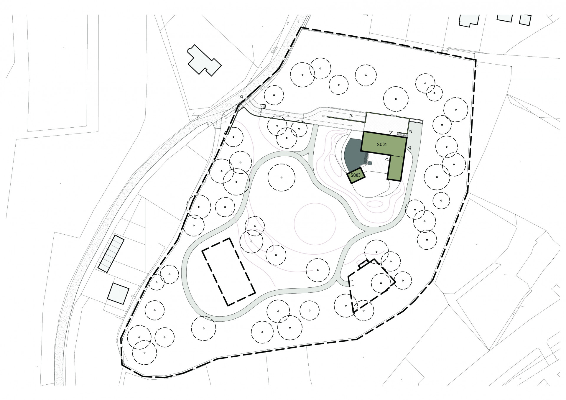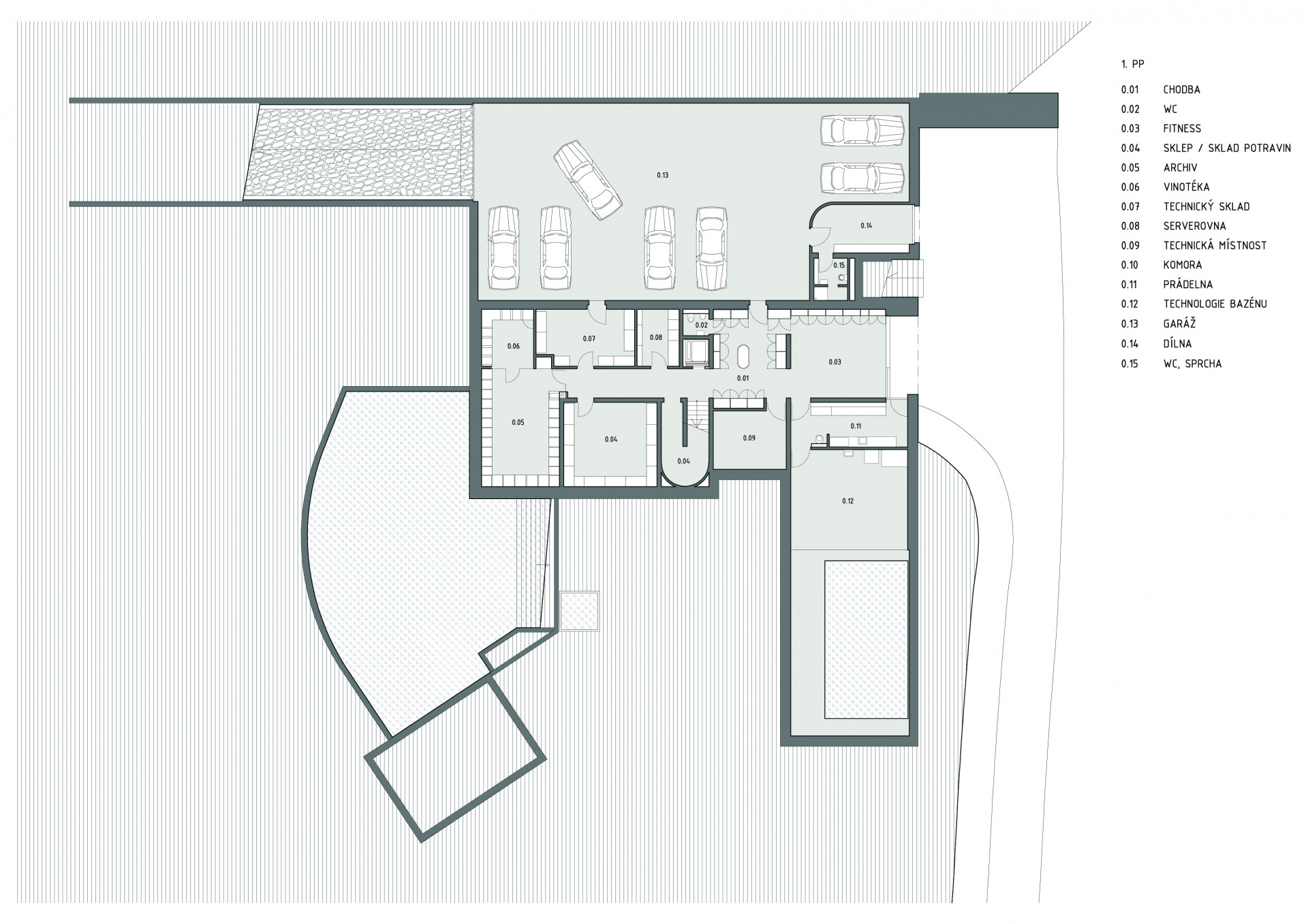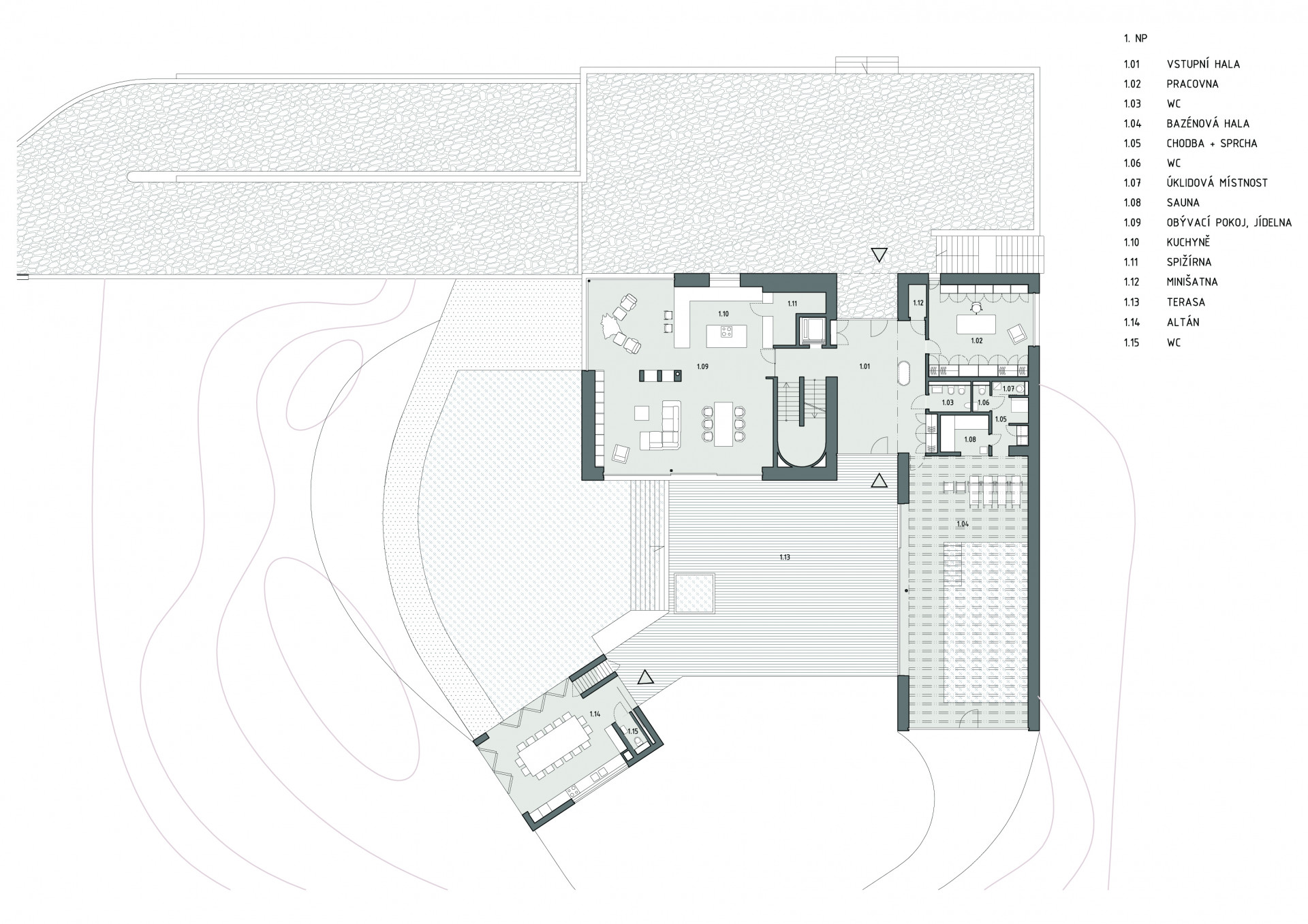 Rodinný dům se skládá ze dvou na sebe kolmých křídel. V tom hlavním se nacházejí všechny obytné místnosti. Křídlo směřující do zahrady pak patří krytému bazénu. Tato sestava ve výsledku umožnila vznik pobytové terasy, která je tak z pohledu z ulice ideálně ukryta.