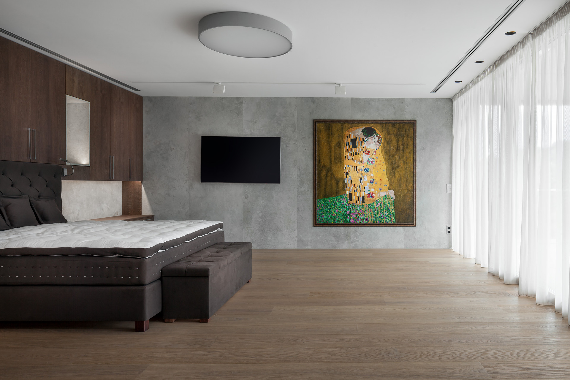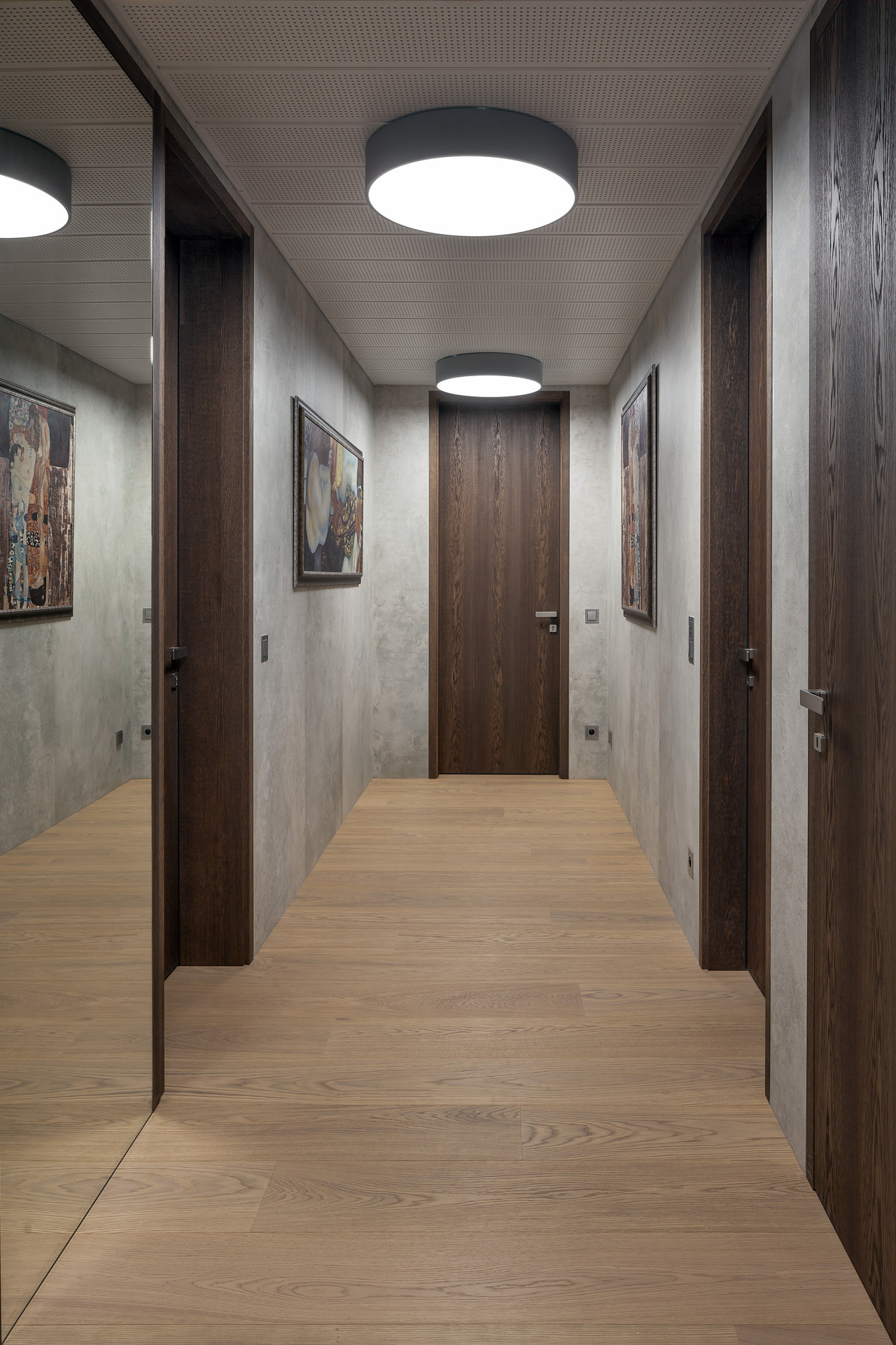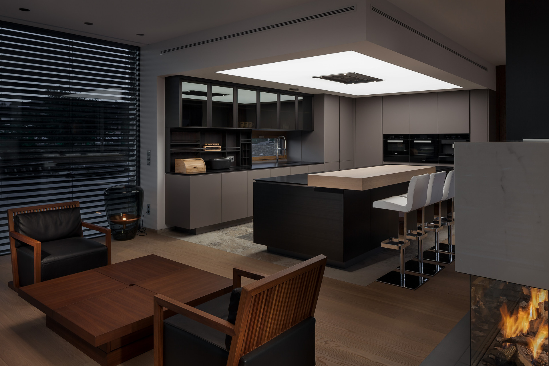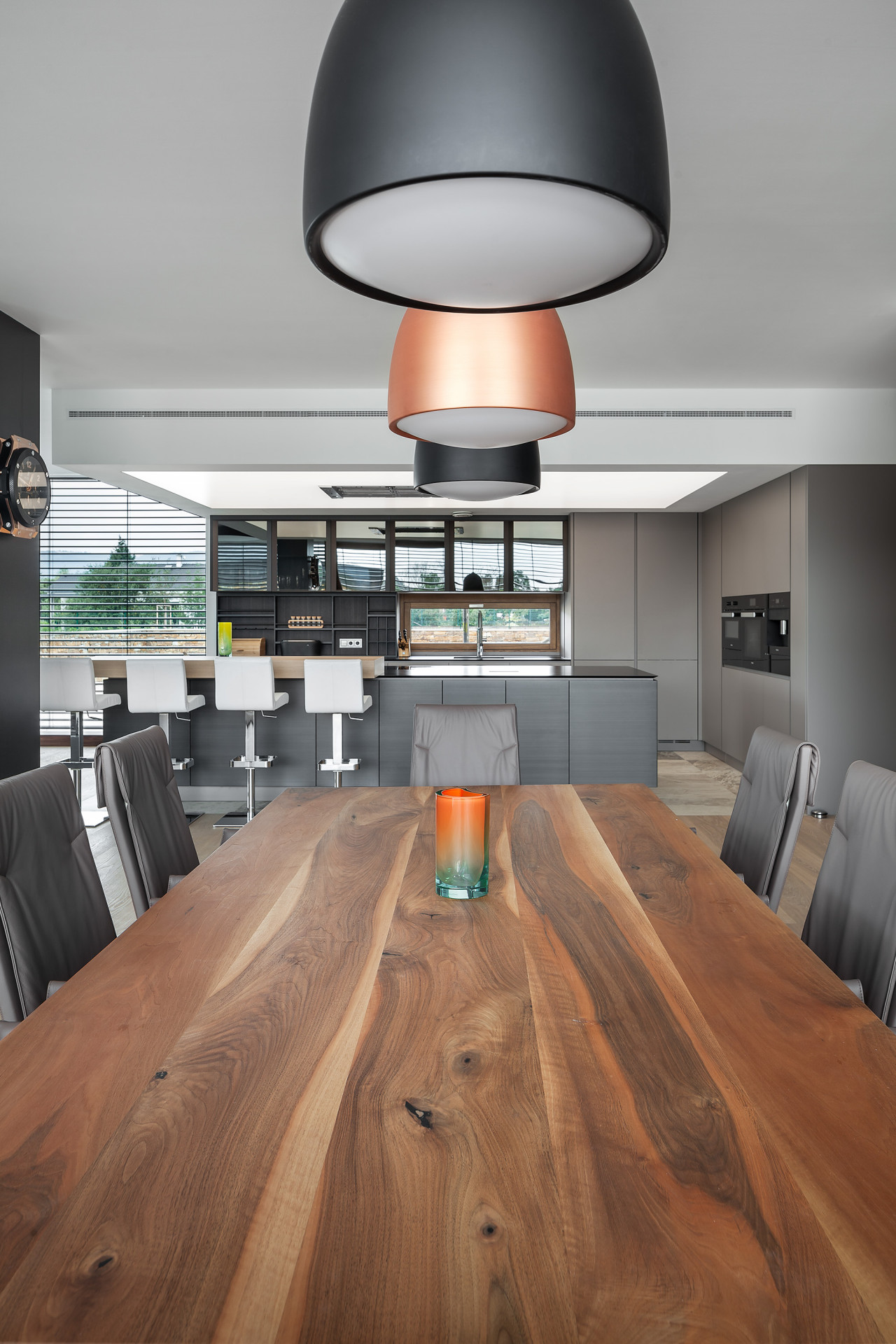 Obytné pokoje přísně působící vily se maximálně propojují se zahradou. Její tvrdé fasády totiž rozráží velkoformátová okna, která všechny místnosti bohatě prosvětlují. Obývací pokoj plynule přechází v pobytovou terasu, ze které je to už jen krůček k přírodnímu biotopu.