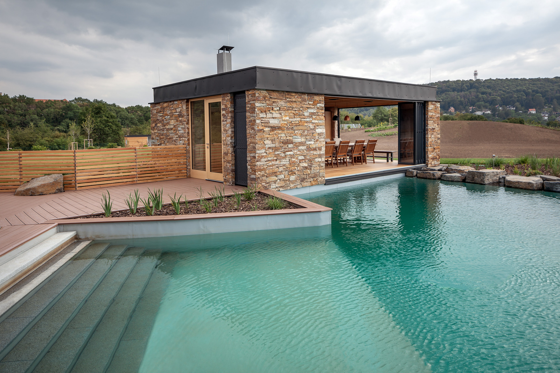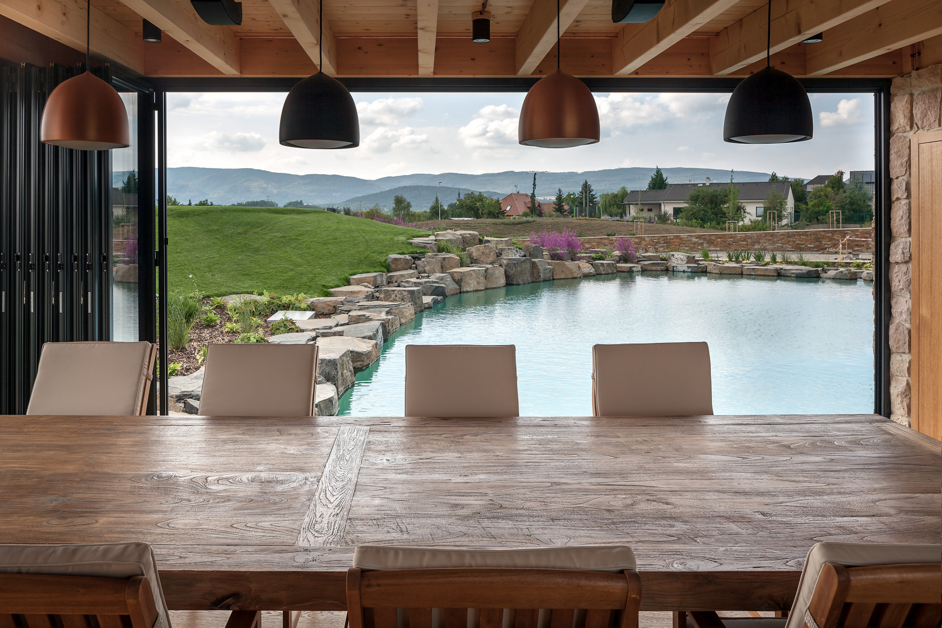 Skutečně velkorysou vilu obklopuje stejně pečlivě vytvořená zahrada. „Pozemek je vysvahován směrem od zastavěného návrší a pojednán ve stylu anglické zahrady s rozsáhlou květnatou loukou ve střední části a vzrostlou obvodovou zelení. V bezprostředním okolí domu byly navrženy květinové záhony, skalky a pobytové trávníky,“ popisuje Petr Dobrovolný. Za dřevěnou pobytovou terasou se navíc nachází i biotop pro letní koupání a altán navržený ve stejném stylu jako vila, konstrukčně se však jedná o dřevostavbu.