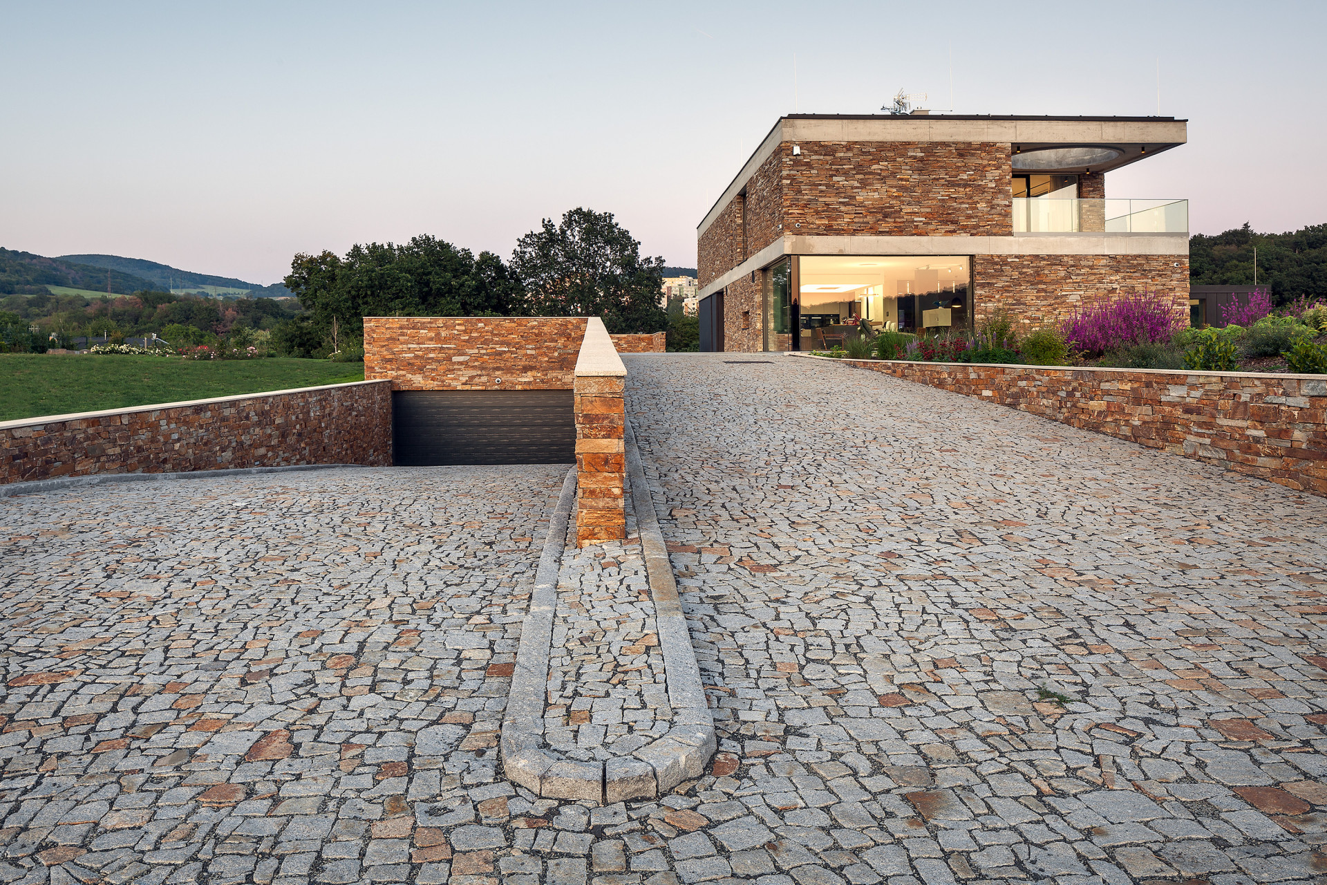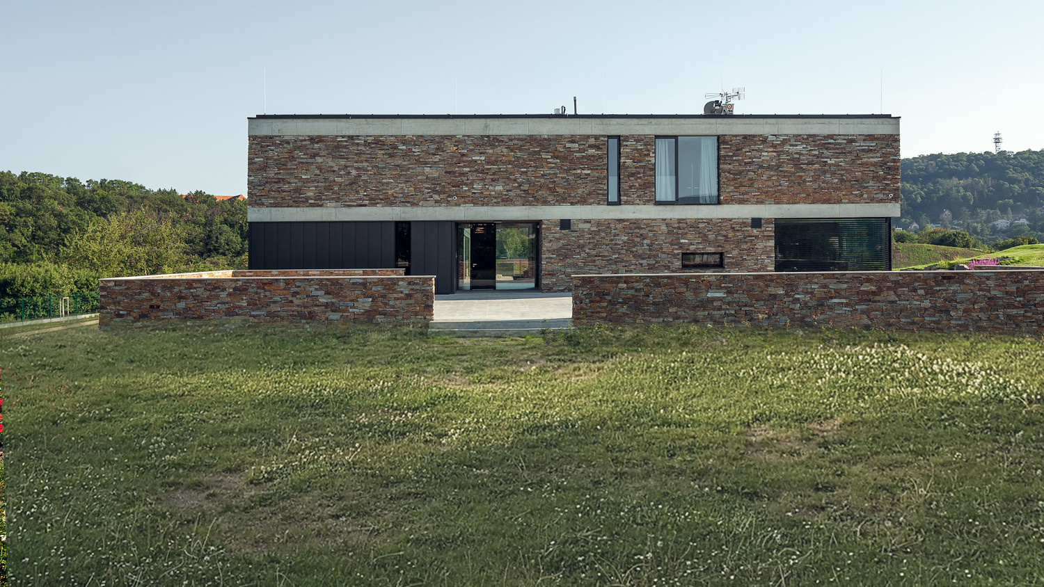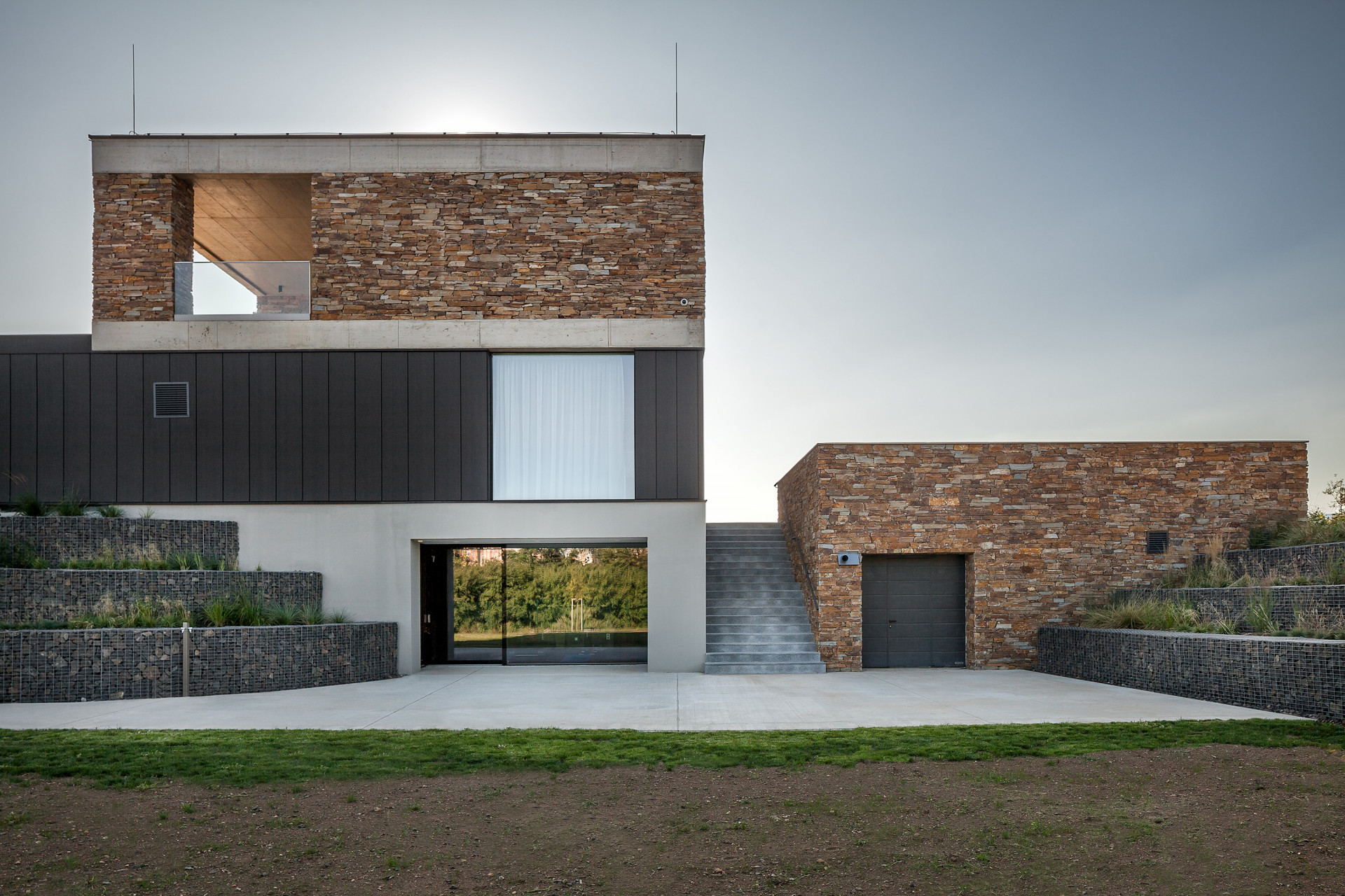 Vila od architekta Petra Dobrovolného navenek působí především svými fasádami obloženými kamenem. Střídmý objem, který vznikl vrstvením kubických hmot, reaguje na nerovný terén a vytváří množství venkovních ploch s různým využitím. Například velká garáž je při pohledu z příjezdové silnice zcela ukryta, po její střeše se prochází dál k hlavnímu vstupu do domu.