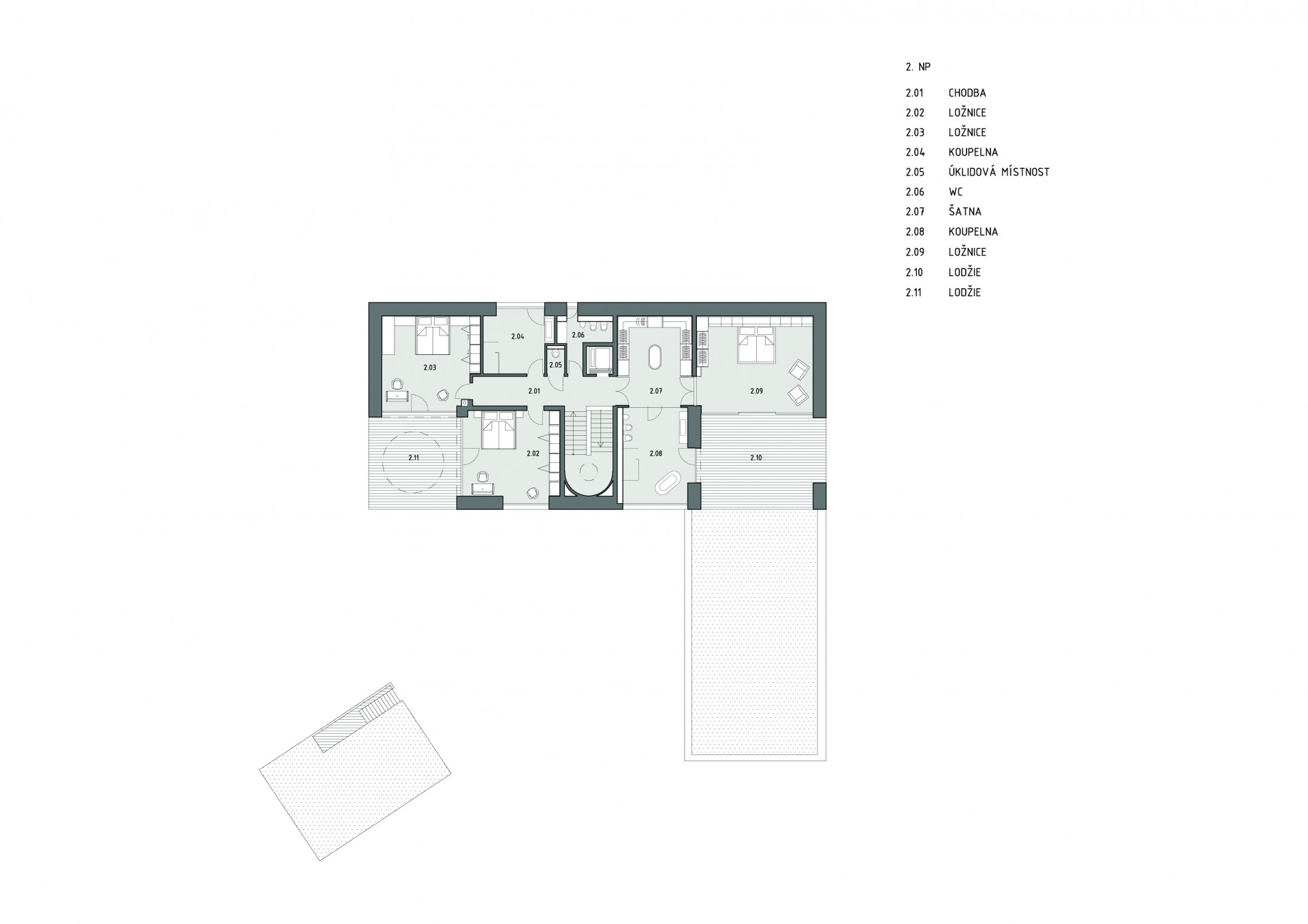 Dvojpodlažní křídlo rodinného domu pak dostalo obklad z rulových kamenů. Nižší hmota obsahující bazén je zase opláštěná tmavými plechovými deskami. Horizontální členění do stavby vnesly navenek propsané stropní desky. „Stropní desky jsou přes prvky s přerušeným tepelným mostem přetaženy na vnější líc fasád a ponechány jako pohledové,“ dodává Petr Dobrovolný.