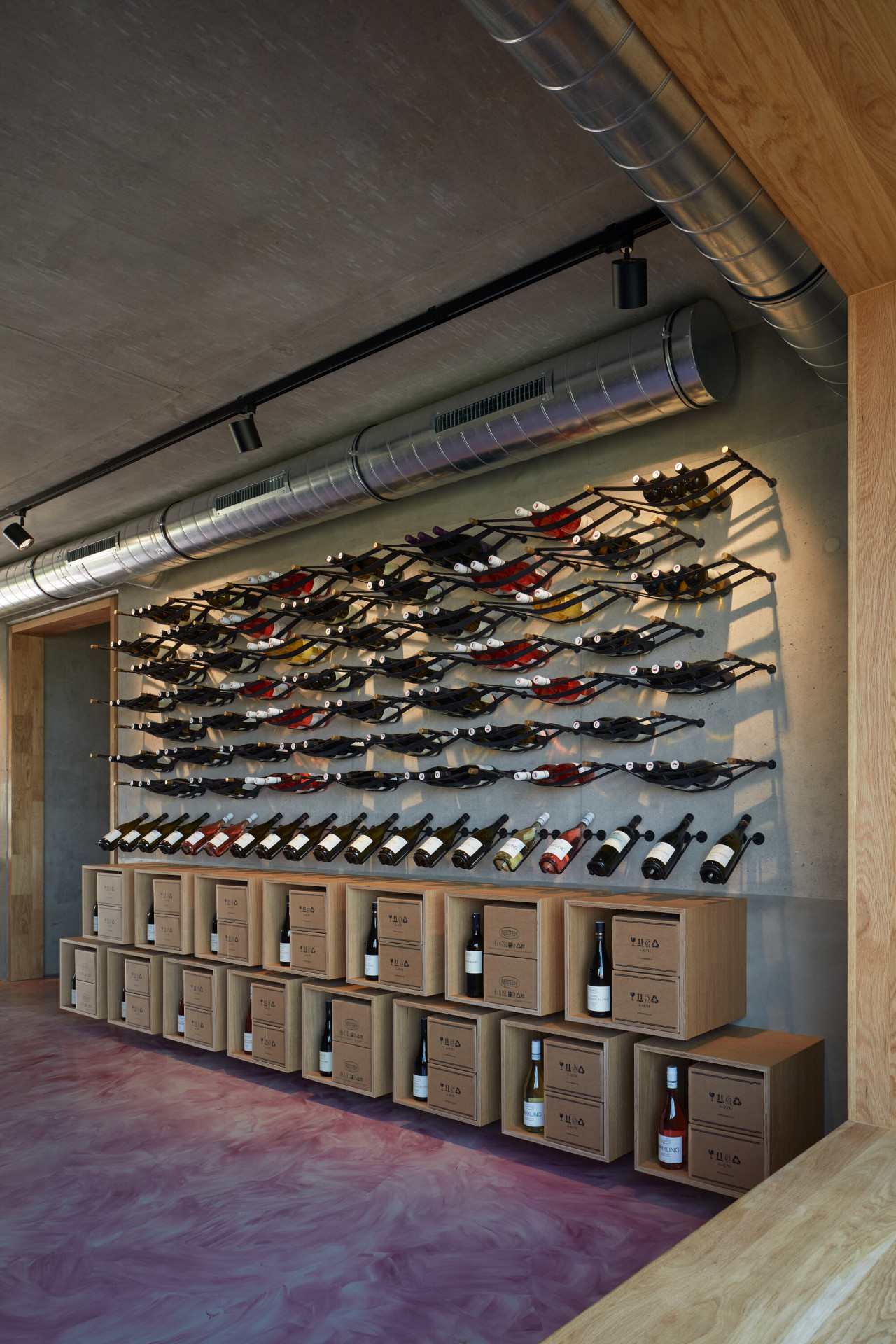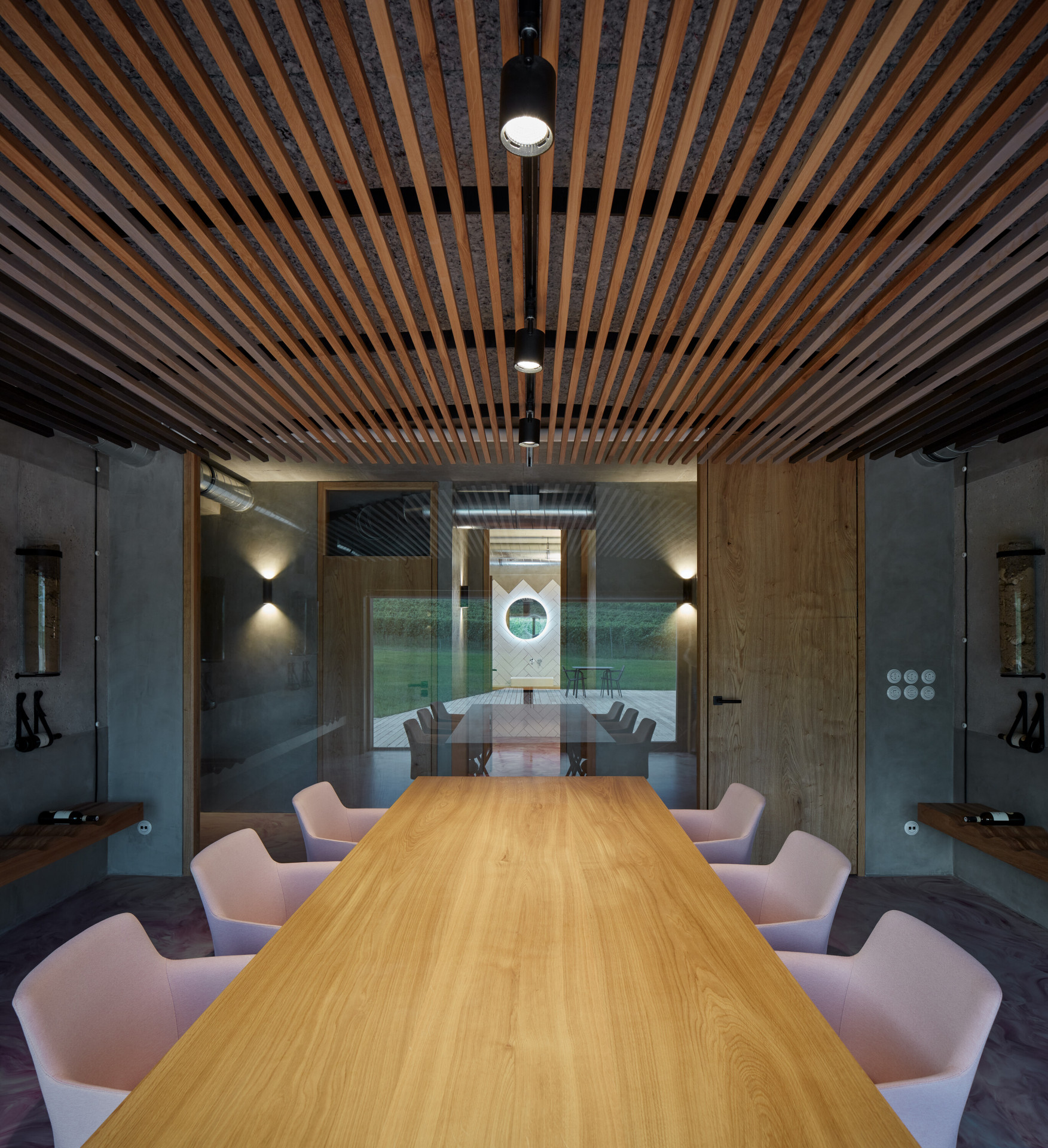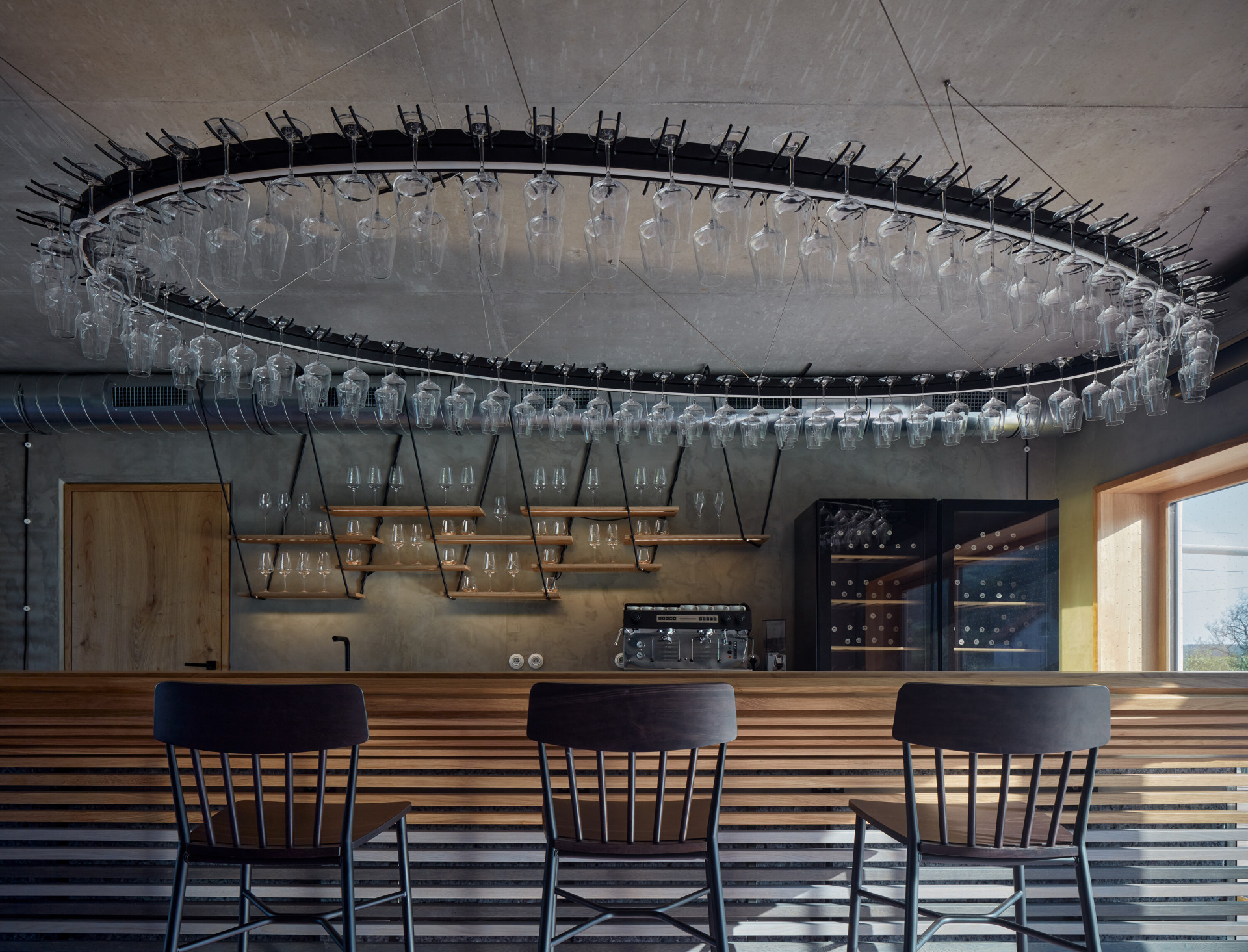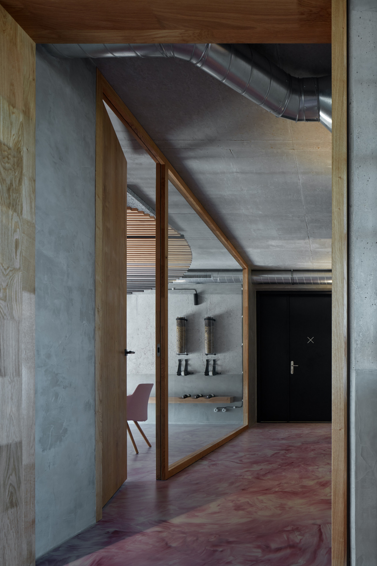Interiér se nese ve znamení přiznaných materiálů. Všechny povrchy byly očištěny tak, aby vynikl beton dříve skrytý pod různými nátěry. Prostory doplňuje autorsky navržený mobiliář z dubového dřeva a oceli, který hravě pracuje s různými vinařskými atributy. „Hosté se mohou usadit na rozměrné lavici, jež do sebe integruje na míru dělané lampy. Jejich stínidla tvarem volně odkazují na demižon,“ přibližují autoři. Výrazný vizuální efekt přináší také do červena zbarvená podlaha, která působí, jako by se interiérem valily proudy vína.