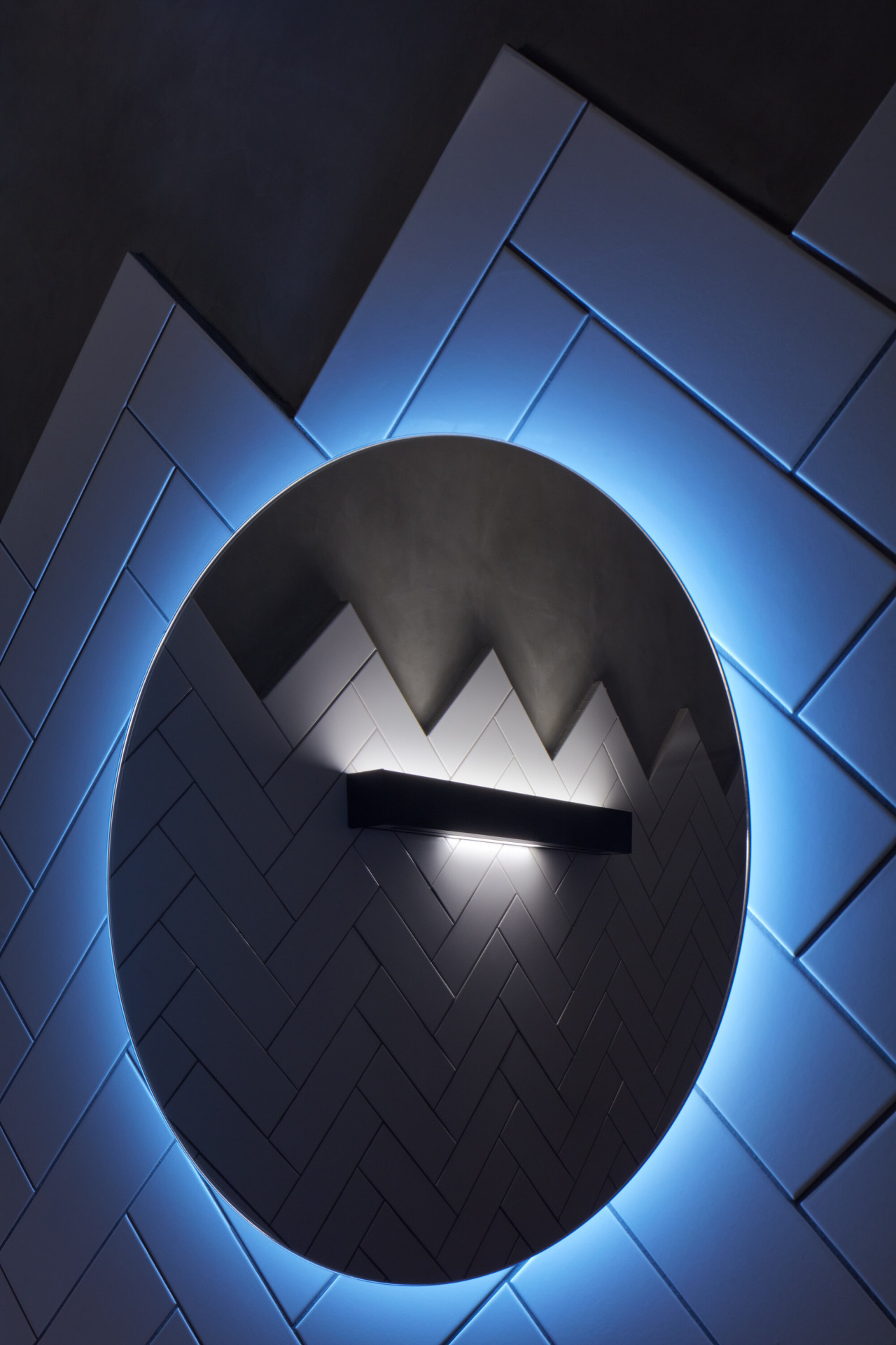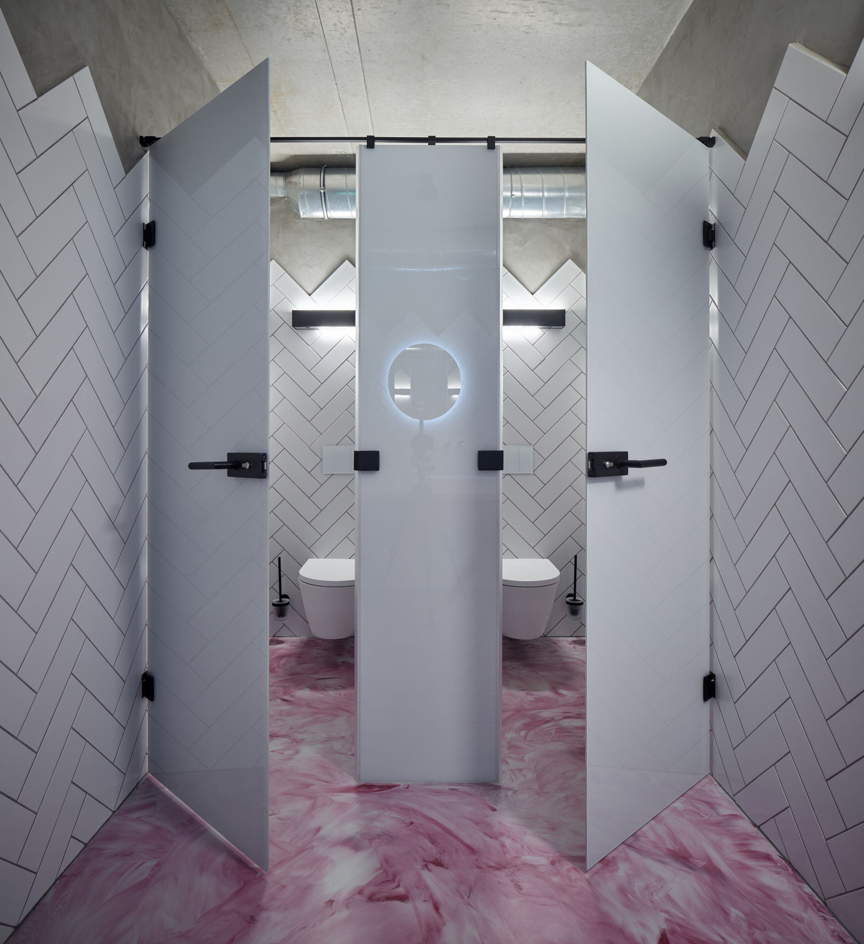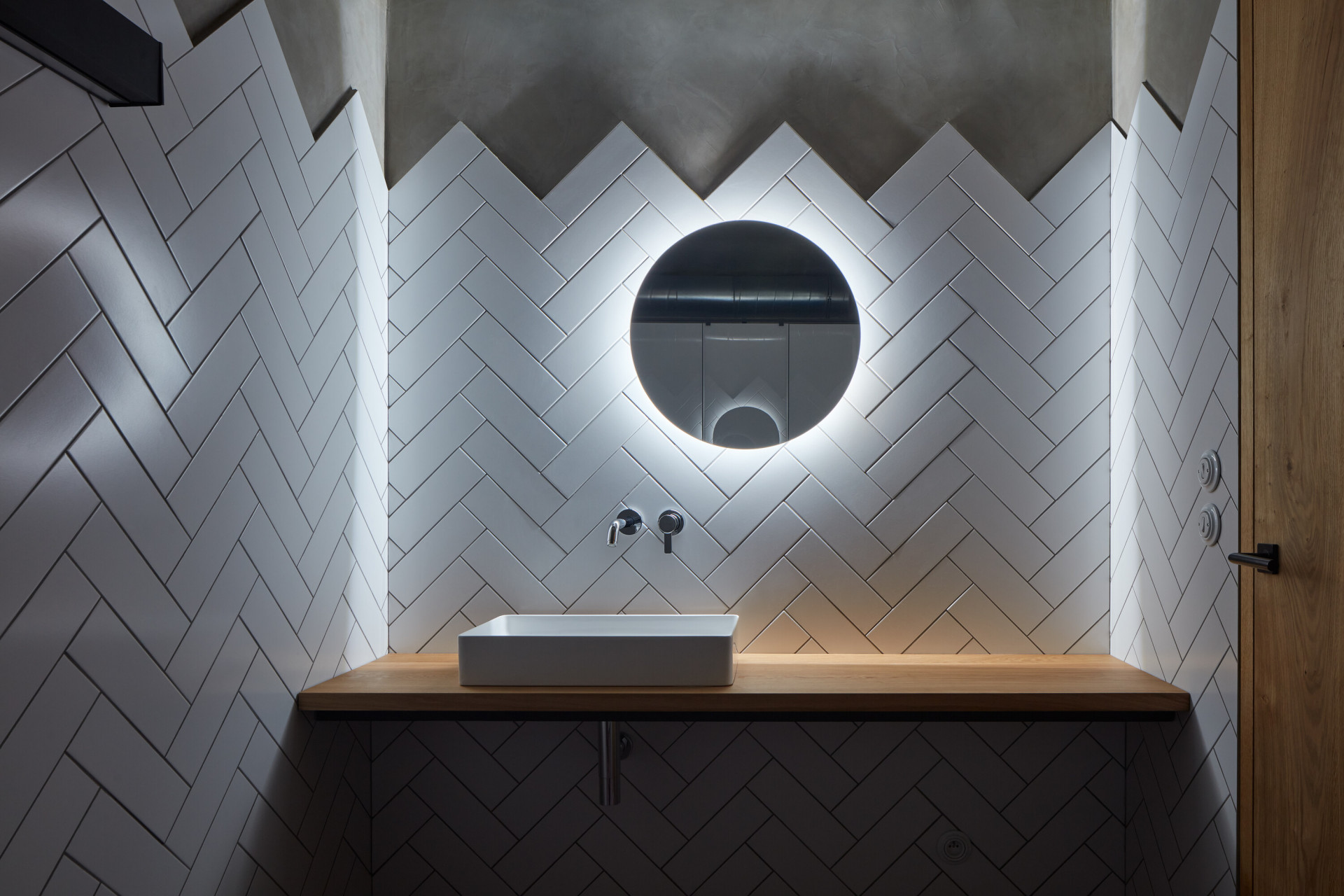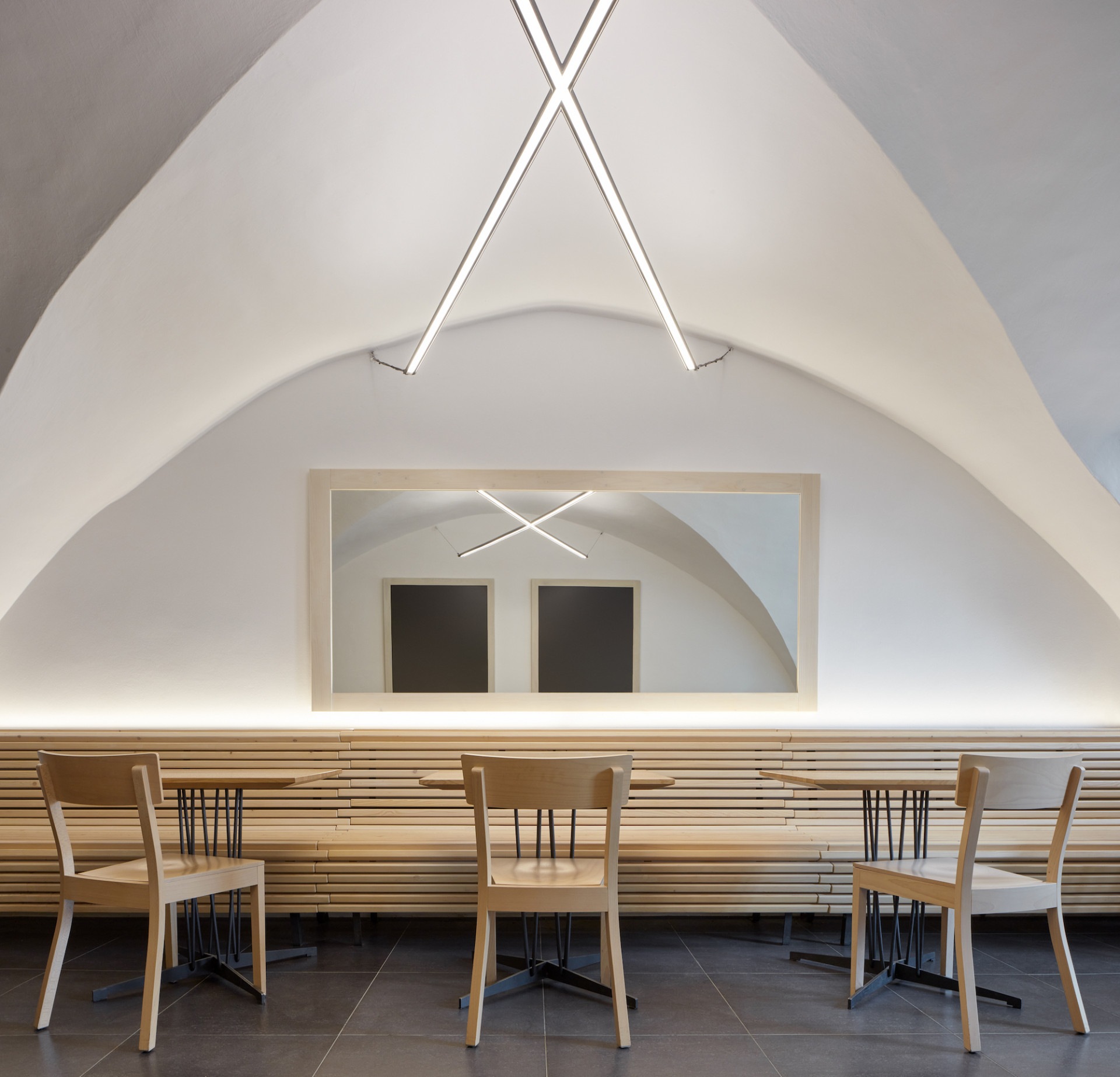Interiér se nese ve znamení přiznaných materiálů. Všechny povrchy byly očištěny tak, aby vynikl beton dříve skrytý pod různými nátěry. Prostory doplňuje autorsky navržený mobiliář z dubového dřeva a oceli, který hravě pracuje s různými vinařskými atributy. „Hosté se mohou usadit na rozměrné lavici, jež do sebe integruje na míru dělané lampy. Jejich stínidla tvarem volně odkazují na demižon,“ přibližují autoři. Výrazný vizuální efekt přináší také do červena zbarvená podlaha, která působí, jako by se interiérem valily proudy vína.