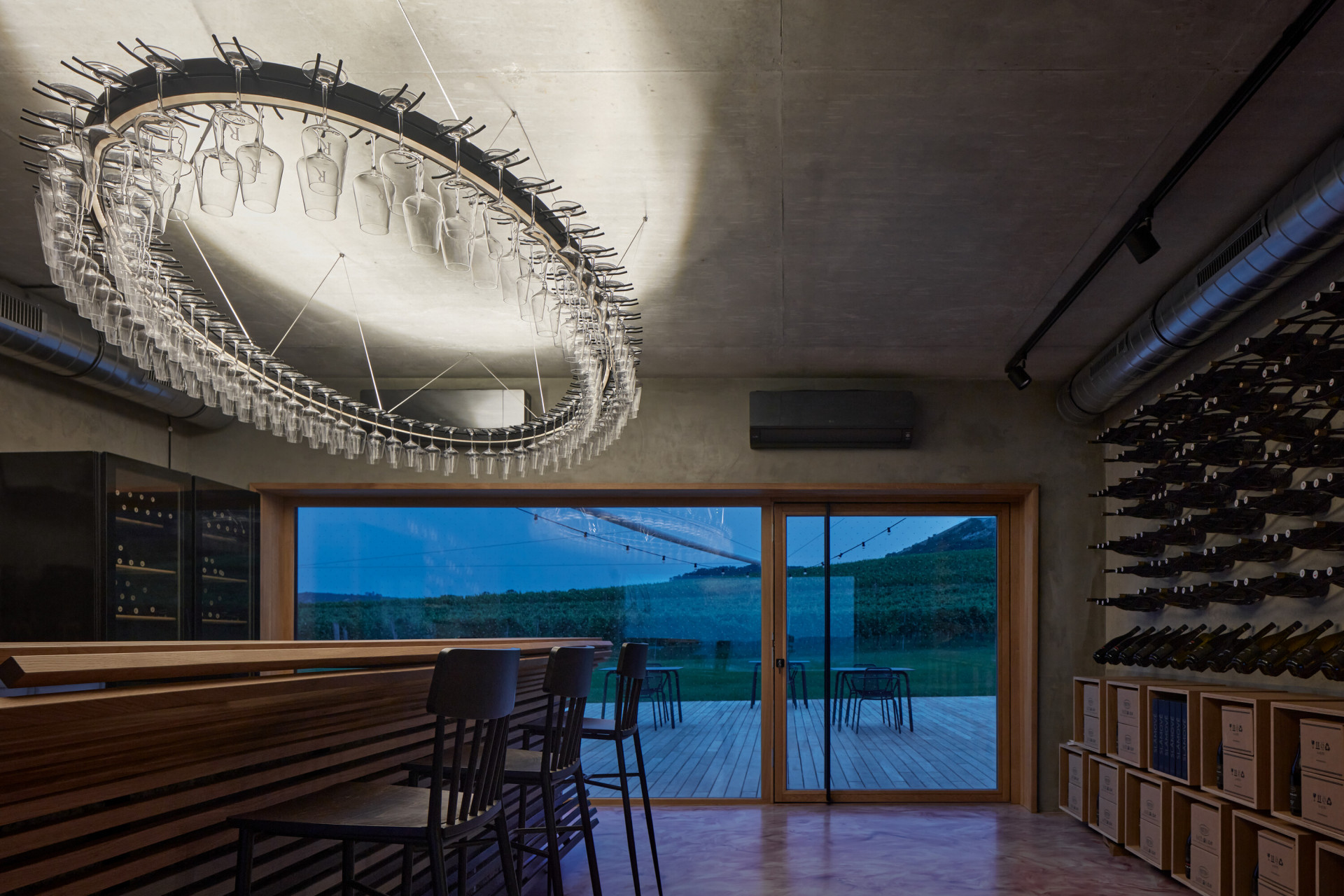 Wine bar nabízí několik zákoutí k pohodlnému posezení, kromě soukromých salónků je k dispozici centrální bar nebo skleněný arkýř vybízející k pozorování okolí se skleničkou v ruce. Pokud byste si chtěli vychutnat západ slunce přímo nad vinohradem, usaďte se na venkovní terase.