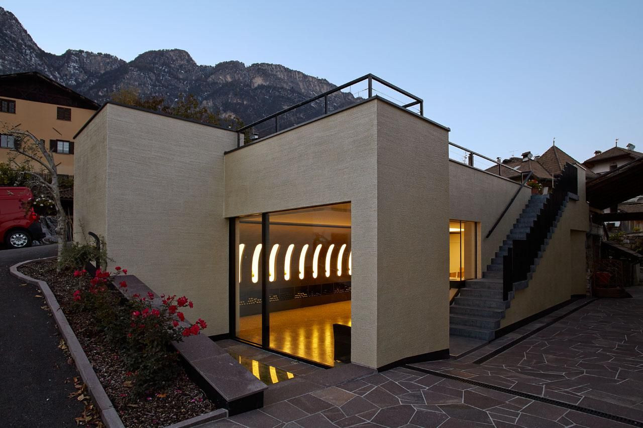Tvůrčím zadáním architektů Willeita a Niederstättera z Bolzana bylo vytvořit adekvátní místo pro degustaci vína. V nevelké části obce Kaltern v jižním Tyrolsku, zvané St. Nikolaus, začínaly být stávající prostory starého selského statku, přeměněné na vinný sklep, nedostačující. Tento krychlový dům sice jednoznačně promlouvá moderním architektonickým jazykem, zároveň ale respektuje historickou zástavbu. Přísně pravoúhlá, dvouposchoďová stavba záměrně vyčnívá nad povrch pouze svými nejdůležitějšími, tedy degustačními prostorami, aby co nejméně zastiňovala výhled na starou stavbu.