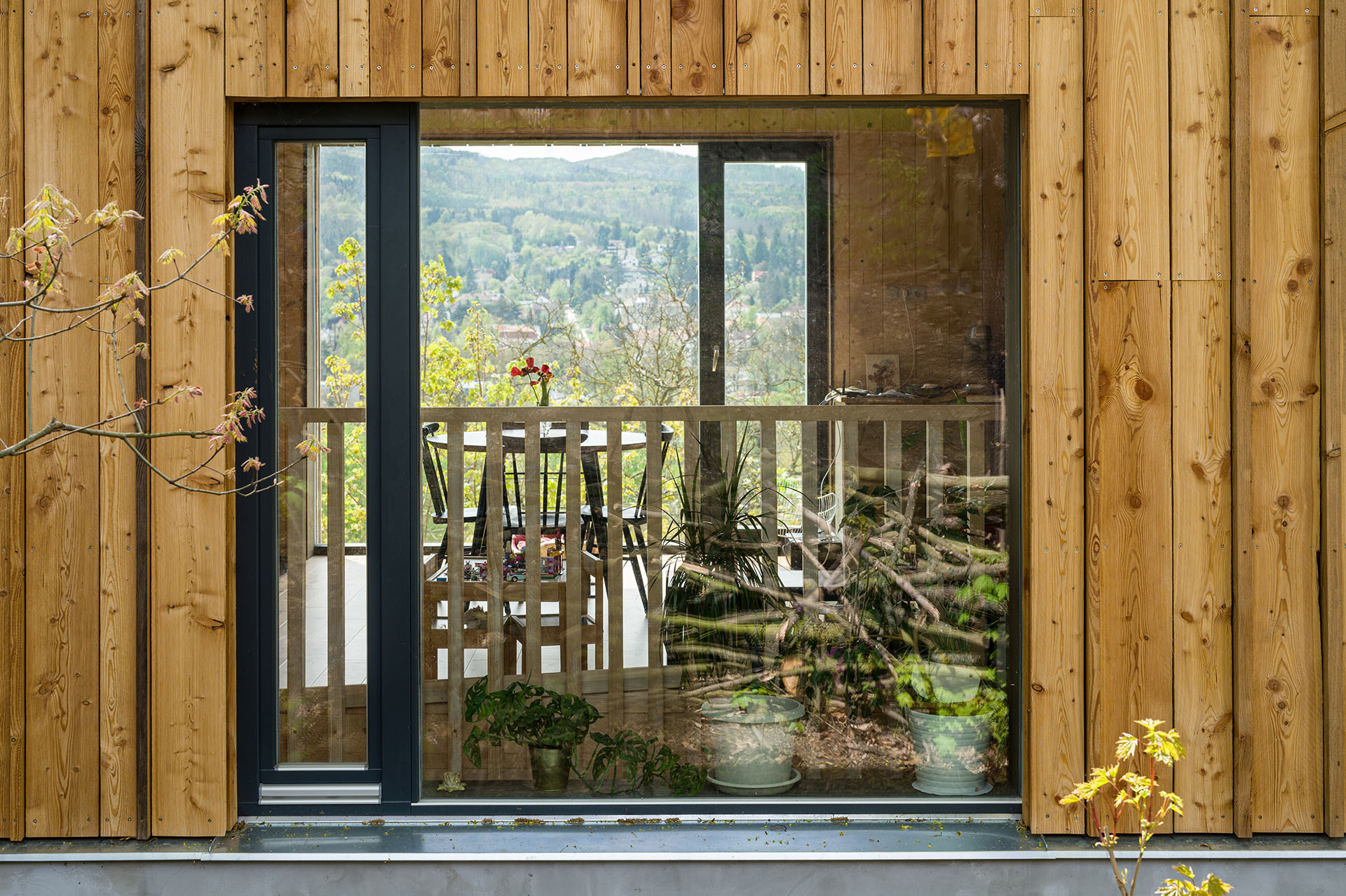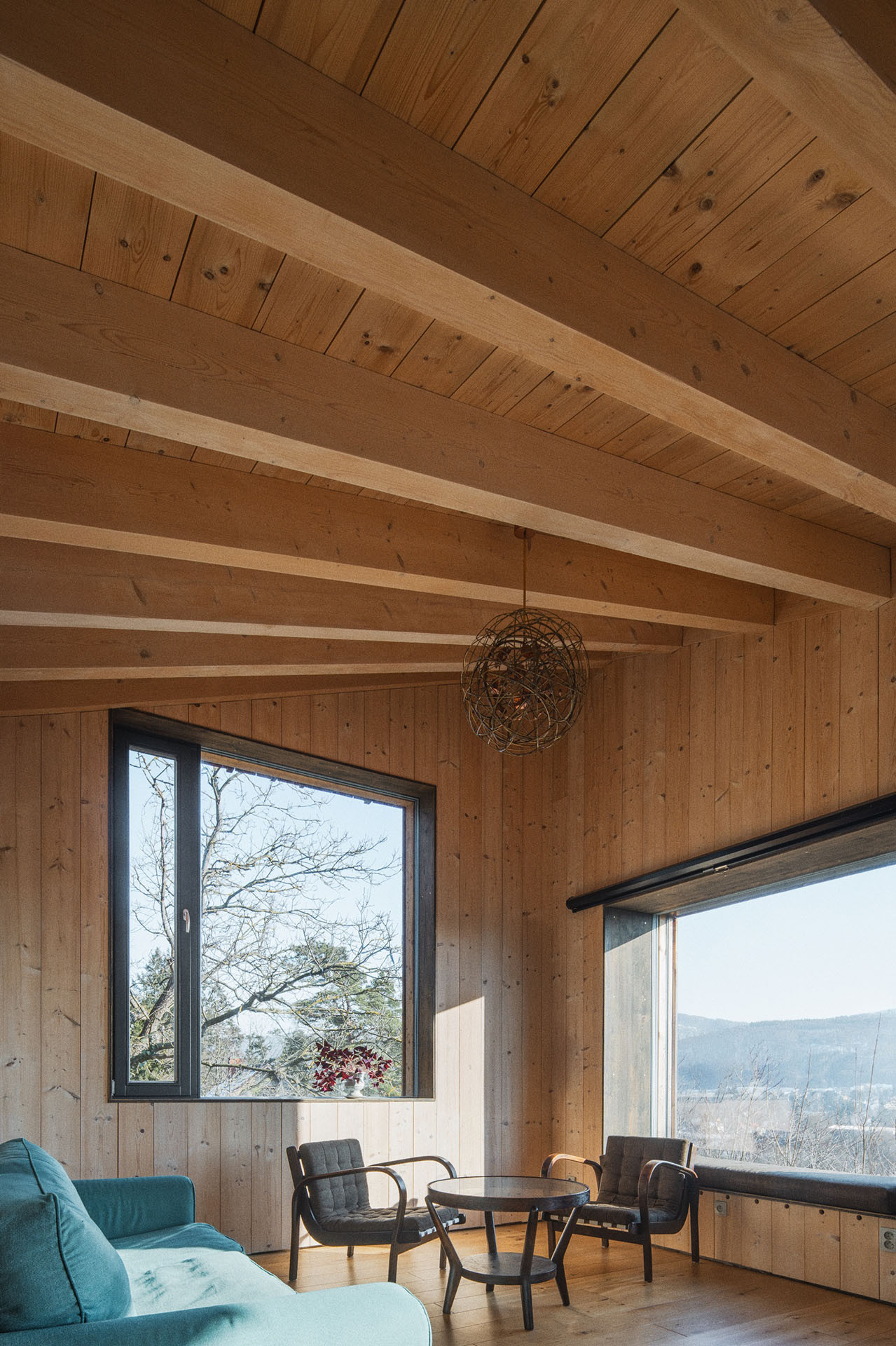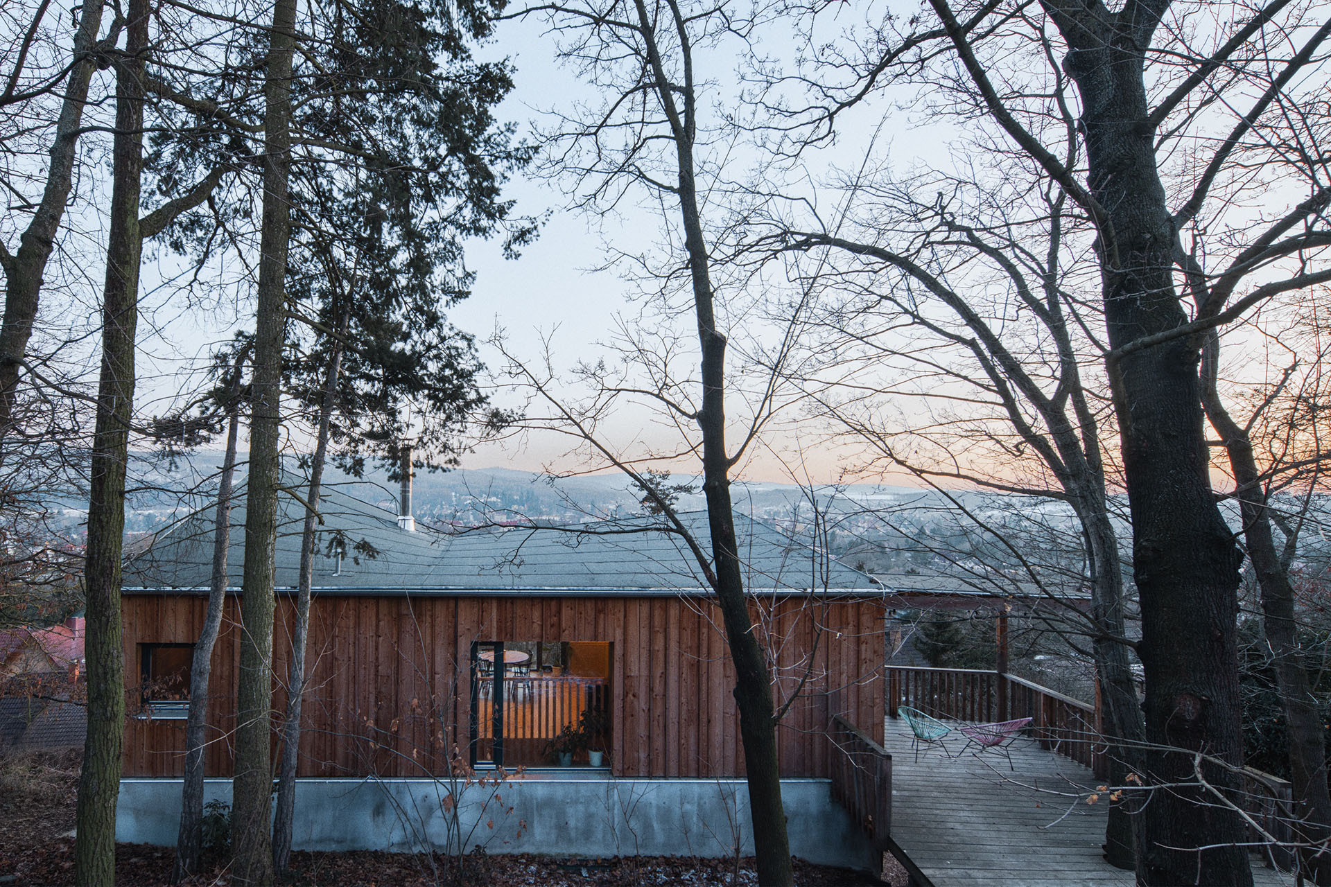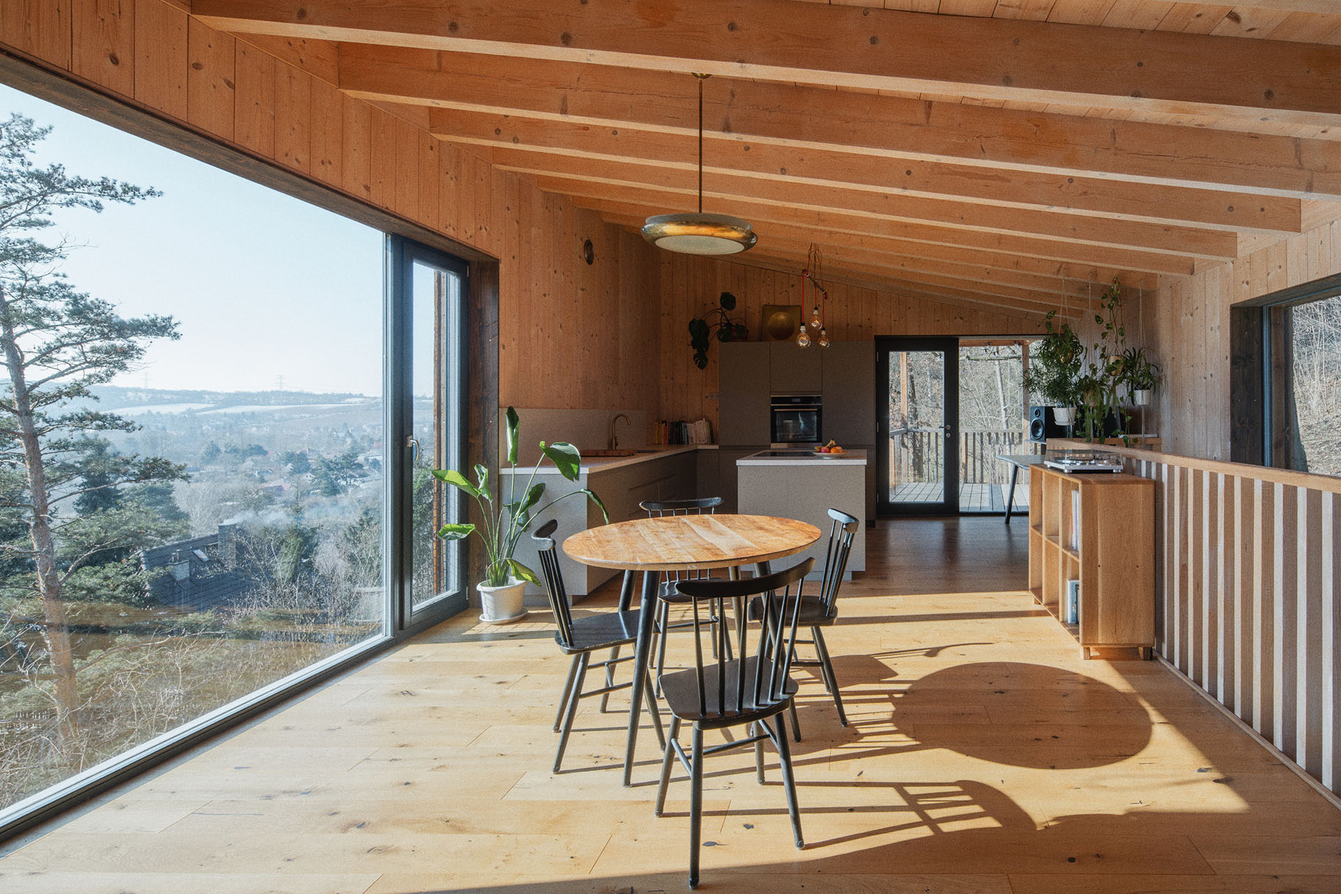 I tak lze ale z obývacího pokoje vyjít ven, na krytou terasu schovanou mezi stromy. Uvnitř je kuchyň, jídelna a sedací kout. Atraktivitu prostoru dodává otevření do nepravidelné pultové střechy a především výhledy. „Různé typy velkých oken do všech světových stran zajišťují pestrou škálu zážitků v průběhu roku a za měnícího se počasí. Sedací okno vystrčené z fasády zve k posezení „na hraně“, popisuje autorská zpráva.