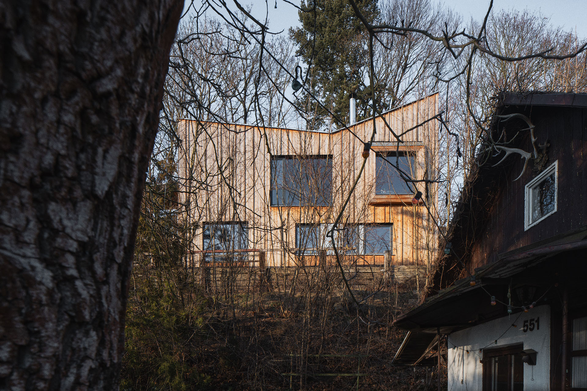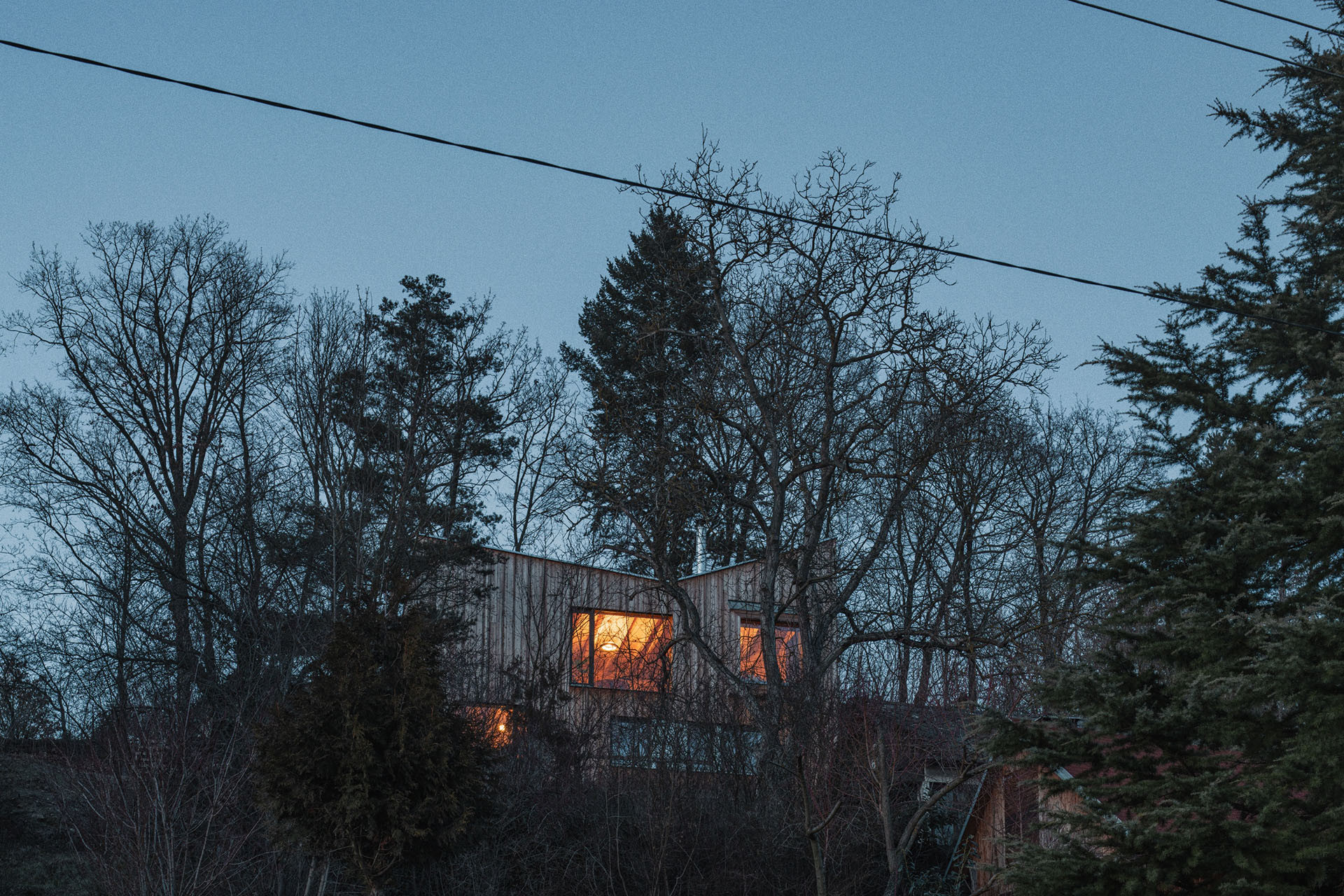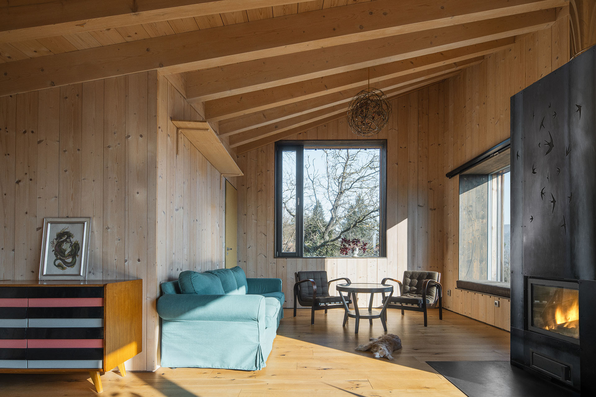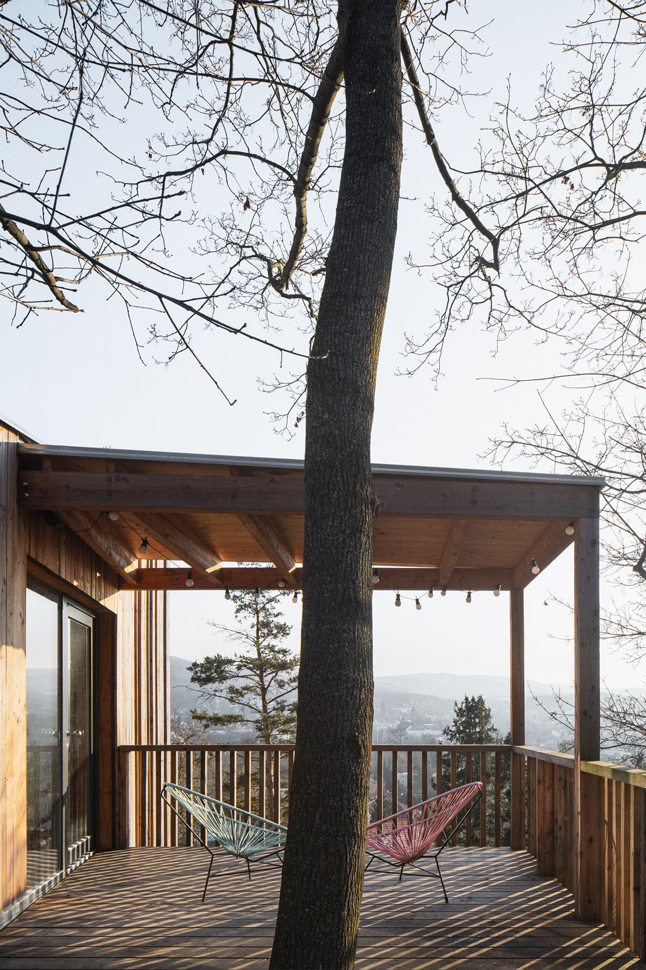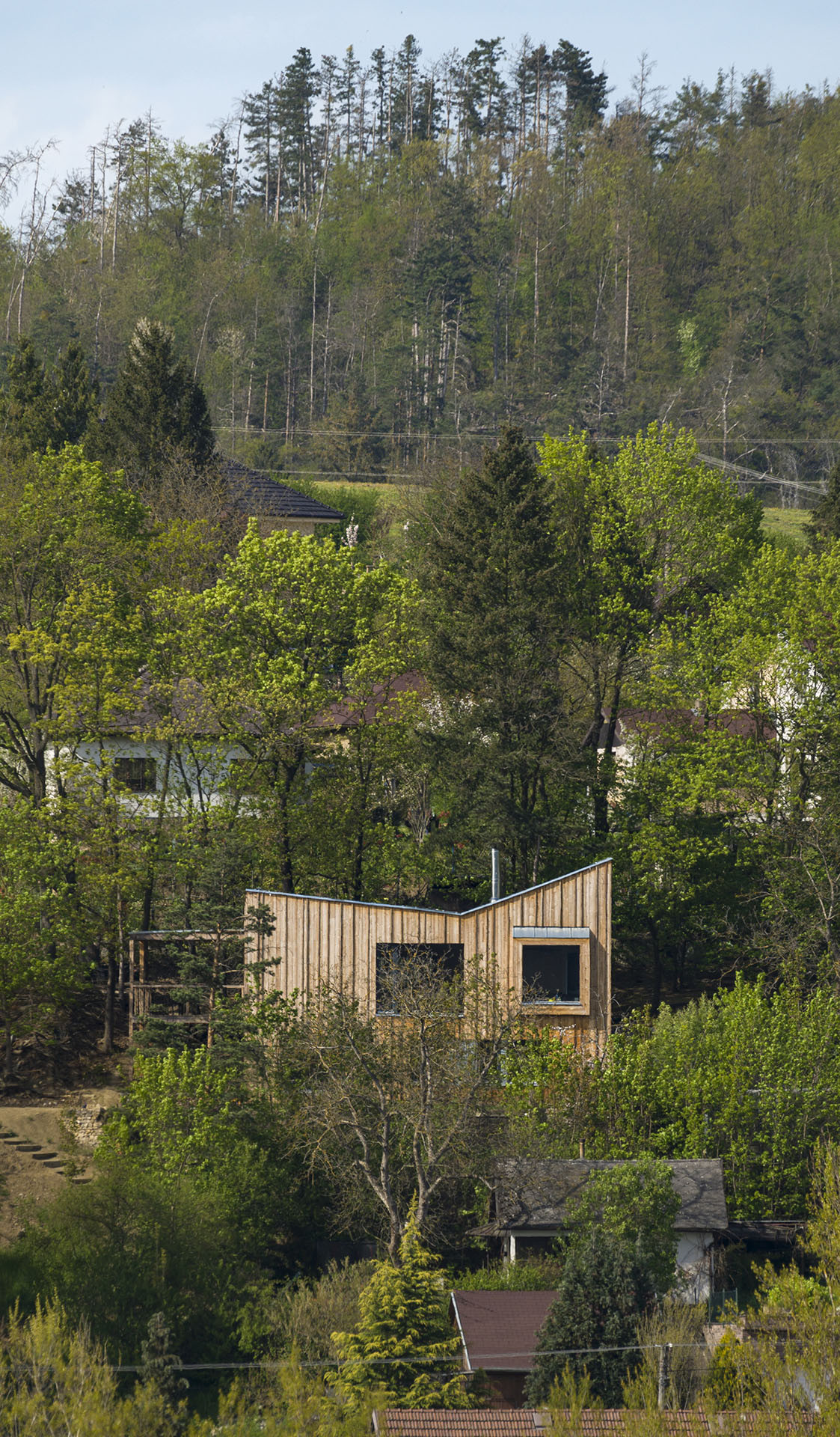 I tak lze ale z obývacího pokoje vyjít ven, na krytou terasu schovanou mezi stromy. Uvnitř je kuchyň, jídelna a sedací kout. Atraktivitu prostoru dodává otevření do nepravidelné pultové střechy a především výhledy. „Různé typy velkých oken do všech světových stran zajišťují pestrou škálu zážitků v průběhu roku a za měnícího se počasí. Sedací okno vystrčené z fasády zve k posezení „na hraně“, popisuje autorská zpráva.