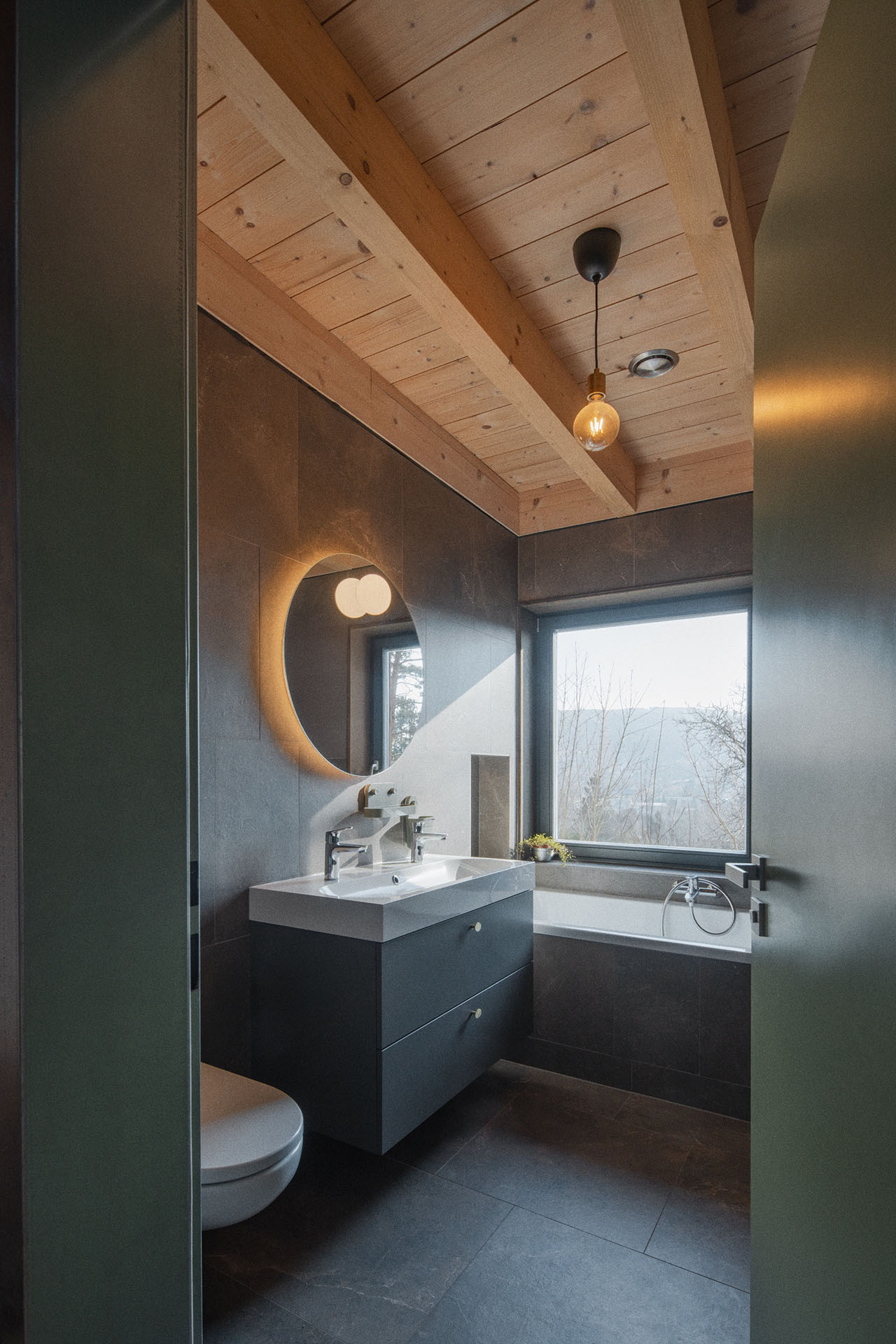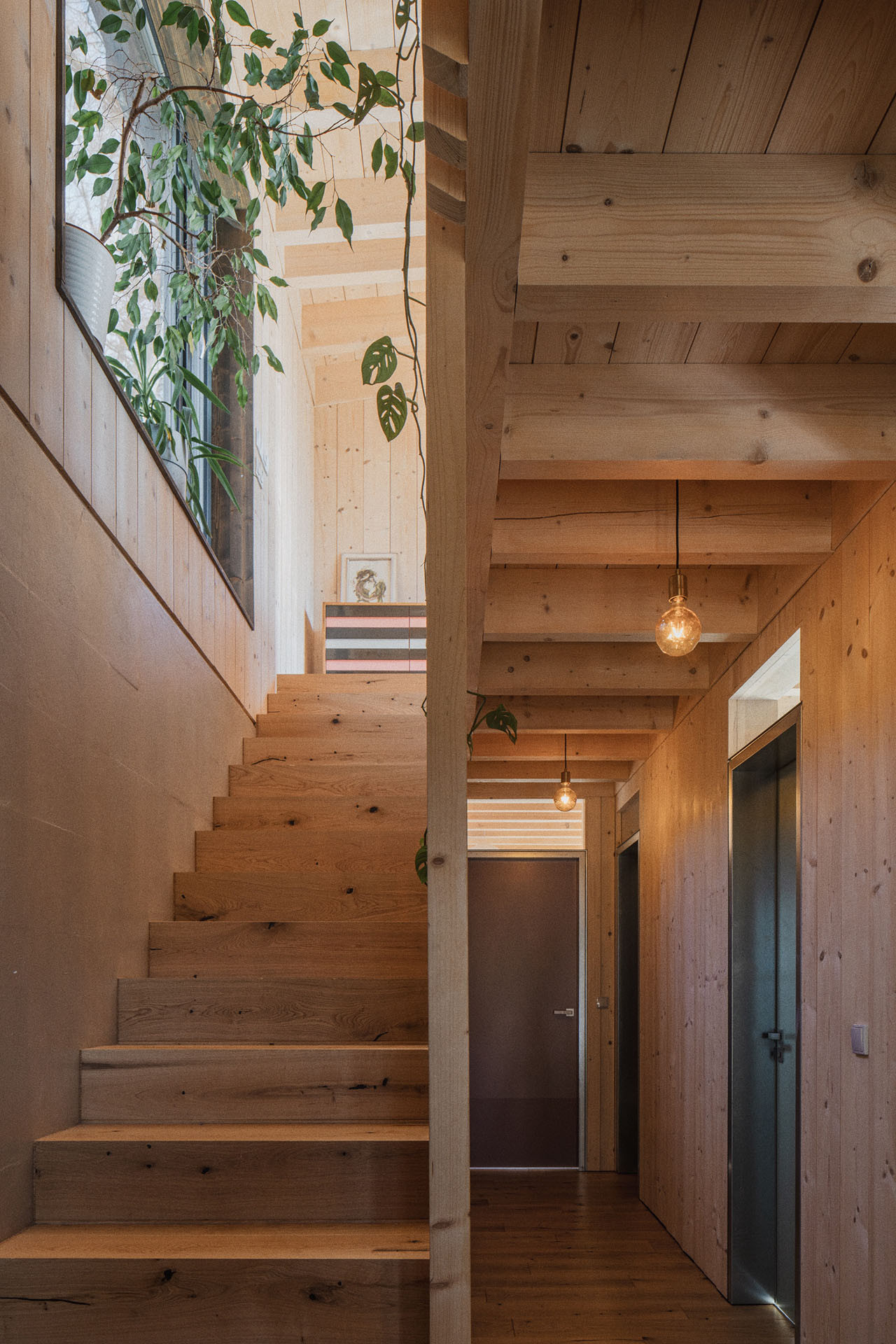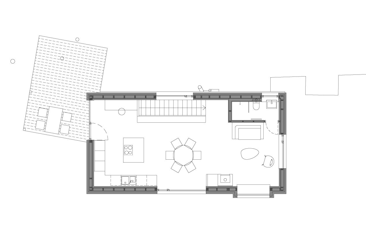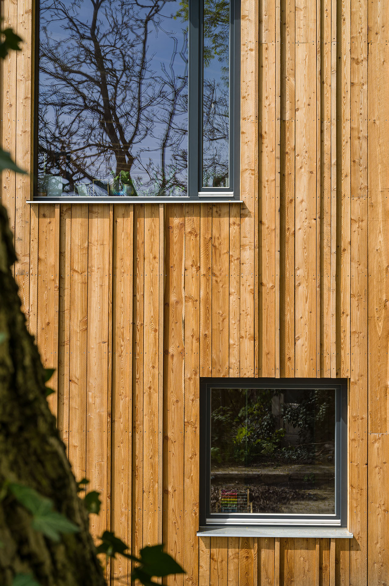 I tak lze ale z obývacího pokoje vyjít ven, na krytou terasu schovanou mezi stromy. Uvnitř je kuchyň, jídelna a sedací kout. Atraktivitu prostoru dodává otevření do nepravidelné pultové střechy a především výhledy. „Různé typy velkých oken do všech světových stran zajišťují pestrou škálu zážitků v průběhu roku a za měnícího se počasí. Sedací okno vystrčené z fasády zve k posezení „na hraně“, popisuje autorská zpráva.