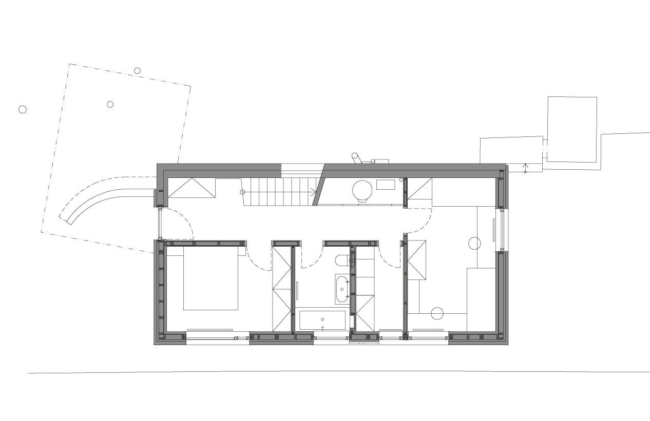 V přízemí, napůl zapuštěném do svahu, je koupelna, komora, a dva pokoje pro rodiče a dvě děti – dětský pokoj lze rozdělit i na dva menší. Úsporná chodba a schodiště jsou opticky zvětšeny nadsvětlíky dveří a prosvětleny velkým severním oknem.