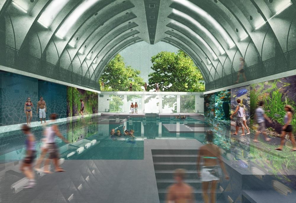 Koncept návrhu vychází z myšlenky – zastřešení bazénové haly, která je nosným elementem – páteří nové funkční výplně. Návrh spojuje dva světy – vodní svět lidí a vodní svět živočichů, které obrůstají hlavní loď objektu a jsou v bezprostředním fyzickém i optickém propojení s lidským světem.