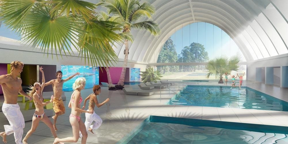 Za hlavné tažisko považujem bazénovú halu s novou sériou pobytových bazénov a víriviek, pútajúcu velkoplošným presklením lode z exteriéru kúpaliska i vstupnej haly objektu. Vytvorená je v podobe tropickej záhrady so skutocnými exotickými drevinami rastúcimi v obrovských zapustených kvetinácoch do výšky parabolickej haly. Atraktivita bazénovej haly sa nekoncí iba pri jej ohromnom priestorovom pôsobení, línie pôdorysu lemuje so stikovaný systém akvárií fungujúcich ako úžasné živé paravány. Zo severovýchodu sa hala prelína s jednopodlažnou prístavbou vyplnenou saunovým svetom, kam sa dostanete cez štrbiny medzi akváriami a kde nájdete svojich pät minút absolútneho kludu. Z juhozápadu halu lemujeme dvojpodlažnou prístavbou expozície, oddelená je kubusom dvojpodlažného akvária. Vizuálny kontakt medzi expozíciou a bazénovou halou považujeme za exkluzívne spestrenie dotyku inak nezlúcitelných funkcií.
