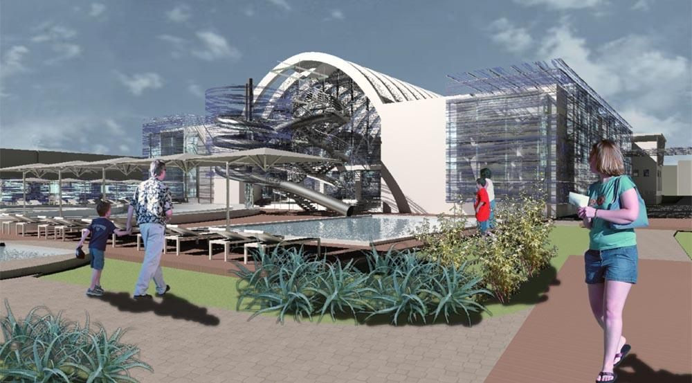 Základním motivem je zachovat v možné míře stávající konstrukce a hmoty objektu. Podle urbanistické koncepce je ponechaný vstup ze severní strany. V rámci řešení přestavby navrhujeme zvětšit prostor vstupu zasklenou konstrukcí vstupní haly přes dvě podlaží. Už v tomto prostoru se objeví prvky vodního světa. Architektura hlavní haly zůstane v původním konstrukčním řešení s tím, že plná střecha bude nahrazena zasklením. Boční přístavky budou přestavěné z jednopodlažních na dvojpodlažní. Ze západní strany je prostor živočišného světa zakomponovaný do botanické zahrady řešené přes dvě podlaží. Takto bude vodní svět lidí oddělen od obvodové komunikace. Zároveň při pohybu po komunikaci bude objekt plovárny víc čitelný a předpokládáme, že bude tvořit orientační bod v architektonickém systému města.