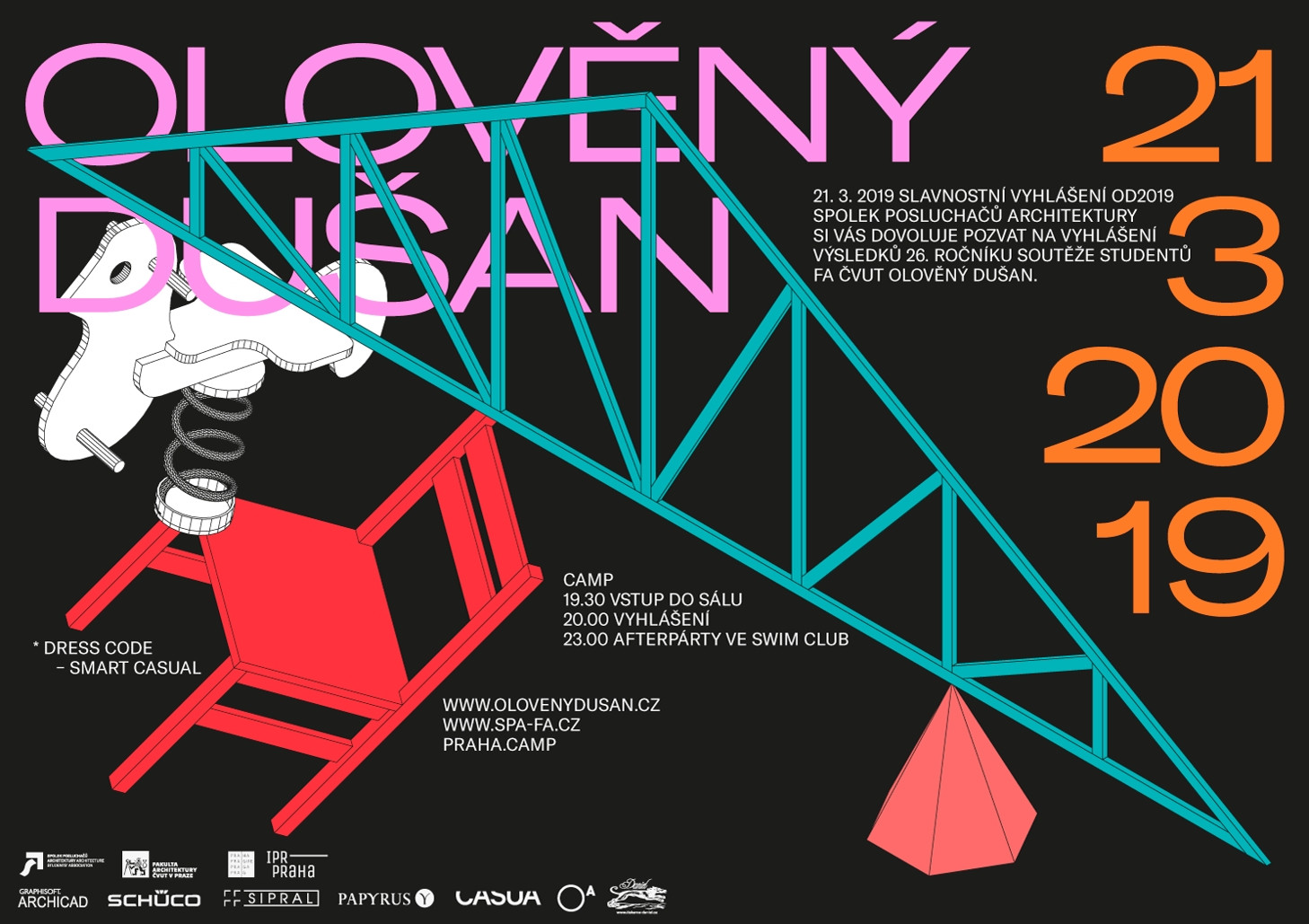Studentský Spolek posluchačů architektury při Fakultě architektury ČVUT Vás zve na vyhlášení výsledků 26. ročníku Olověného Dušana, kultovní soutěže o nejlepší studentské projekty a ateliéry. Sošku Olověného Dušana každoročně uděluje nezávislá porota složená z předních českých architektů, designérů a osobností spjatých s těmito obory. Galavečer proběhne 21. 3. 2019 od 20 hodin v hlavním sále Centra architektury a městského plánování C.A.M.P. Nominované a vítězné projekty a ateliéry budou představeny ve dvou oborech – Architektura a urbanismus a Design.