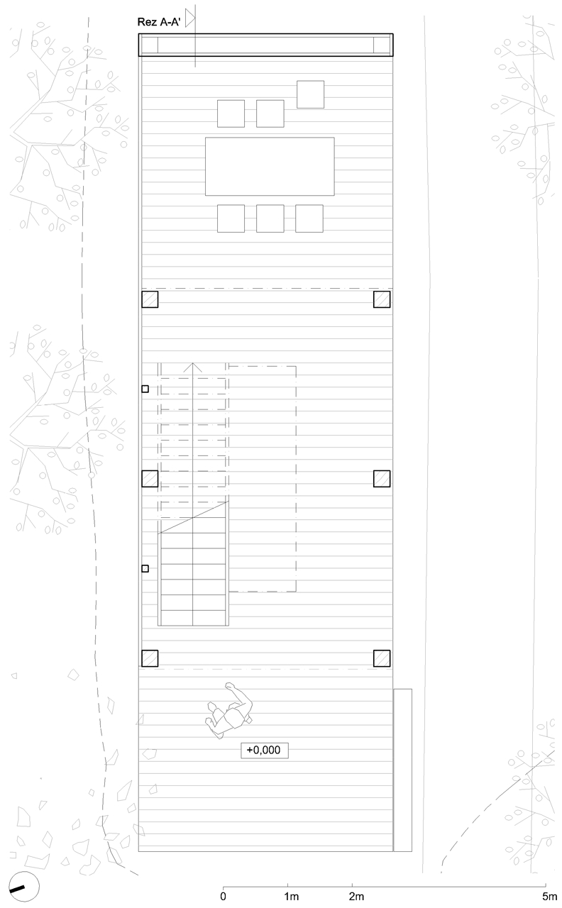 Horná časť rozhľadne ponúka návštevníkom výhľad počas celého vzostupu a zostupu a umožňuje tak pozorovať rôzne úrovne prírody a okolia. Konštrukcia z interiéru opätovne ponúka voľný pohľad späť do zeleného prostredia, na ktorého tak stavba odkazuje a ktorého sa stáva súčasťou. Z konštrukčného hladiska je riešená ako zváraná oceľová nosná sústava. Túto trojrozmernú mrežovú konštrukciú z bielych ocelových tyčí vytvárajú kocky o jednotnej hrane 1170 milimetrov. Jednotlivé steny kociek sú na určitých miestach vyplnené s mriežkovými roštmi, ktoré tak slúžia ako medzipodesty schodiskových ramien a podlaha vyhliadkovej plošiny.