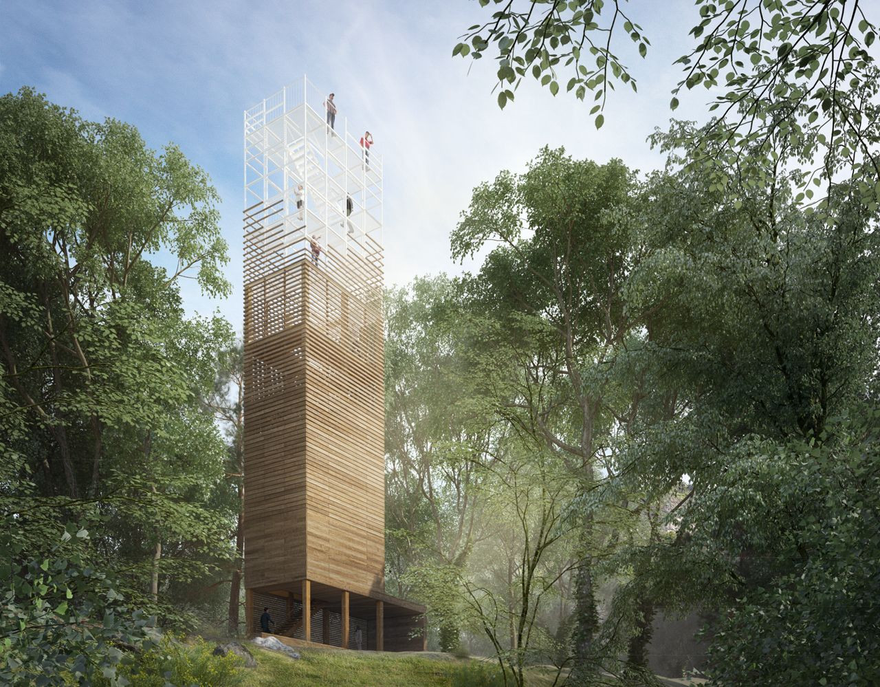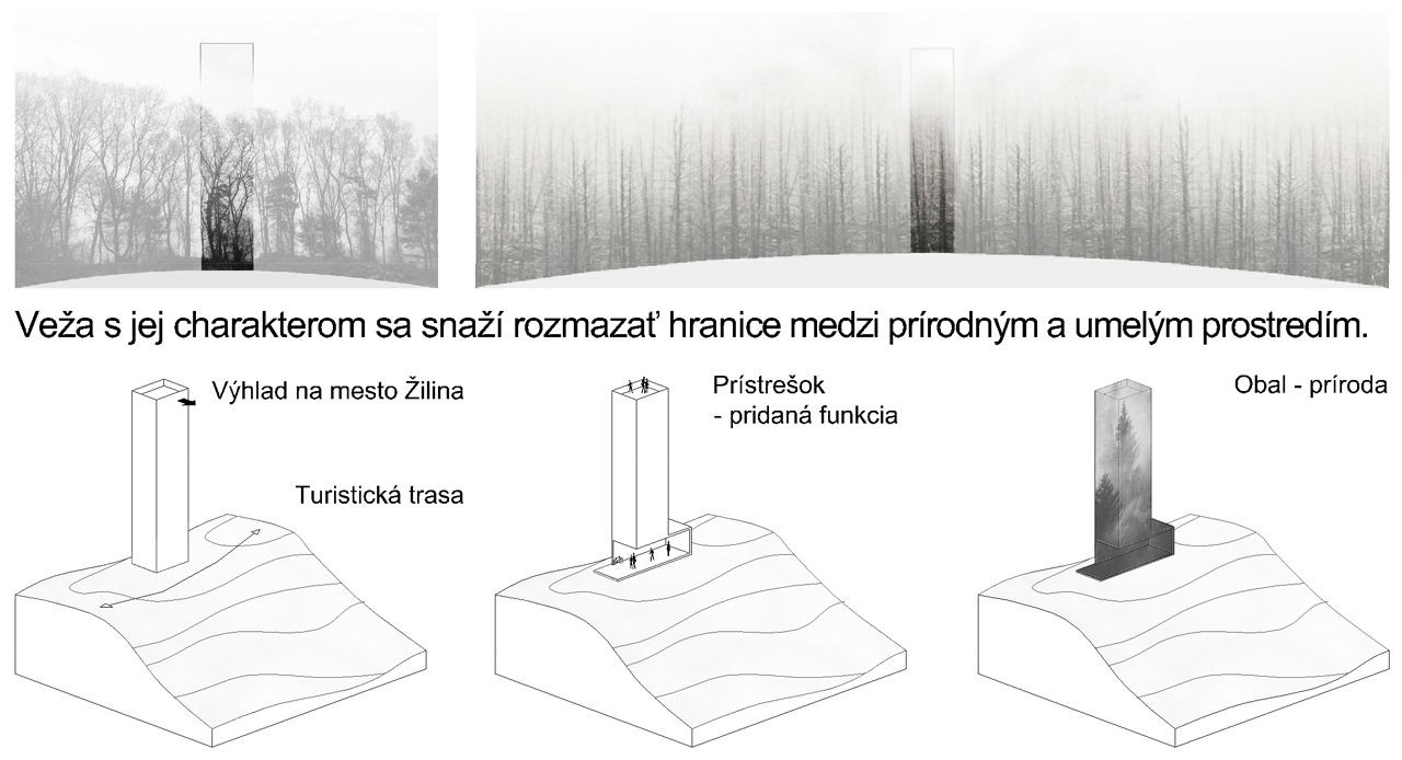 Veža s jej charakterom sa snaží stať súčasťou tohto systému a rozmazať hranice medzi prírodným a umelým prostredím.V návrhu sa vzťah medzi prírodou a architektúrou smerom nahor postupne rozvíja. Konštrukcia sa vizuálne rozpúsťa do okolia, čím sa veža stáva symbolickým putom medzi nebom a zemou.