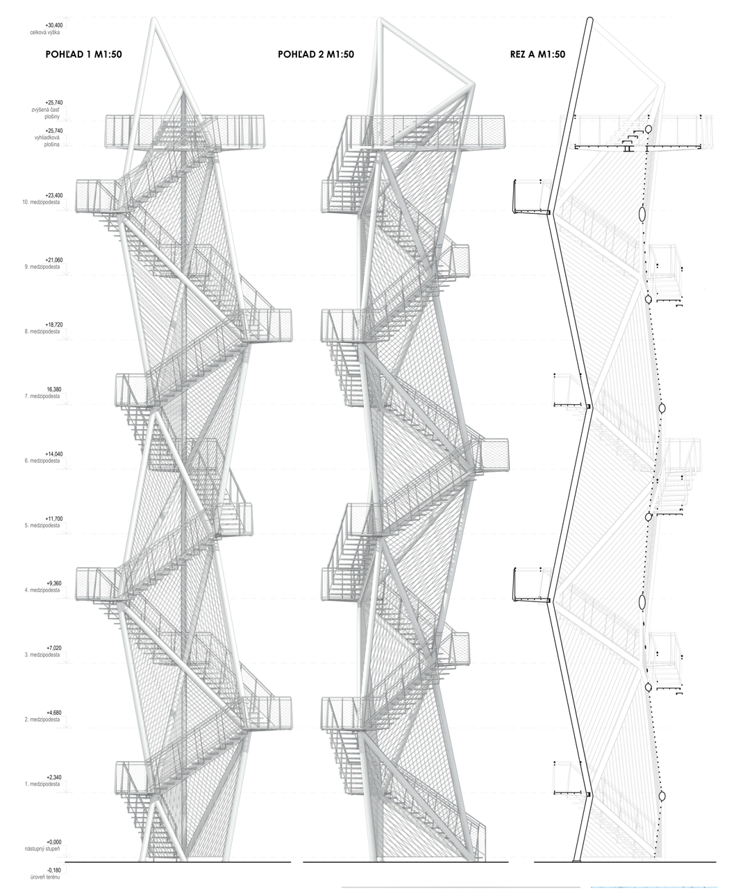 Vyhliadková veža je hravou kompozíciou oceľovej konštrukcie s vonkajším vejárovým schodiskom. Použitá je výplň plášťa, akási košieľka z oceľových laniek. Schodisko je priznané, konštrukčne oceľové s podlahou z pororoštu. Tento tvrdý materiál vytvára poetickú kompozíciu v prírodnom prostredí. Návrh je realizovateľný, spĺňa finančný limit na vyhotovenie. Nedostatkom sa javí neriešený priestor nástupu na vežu.