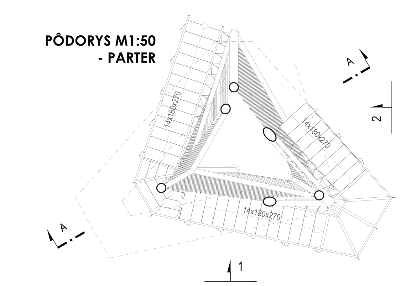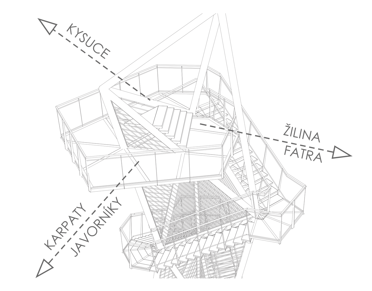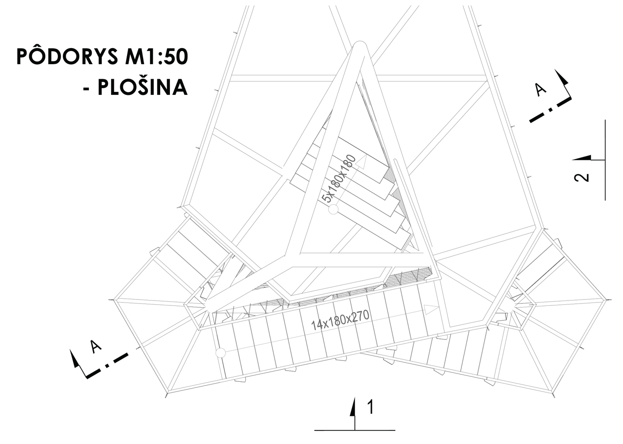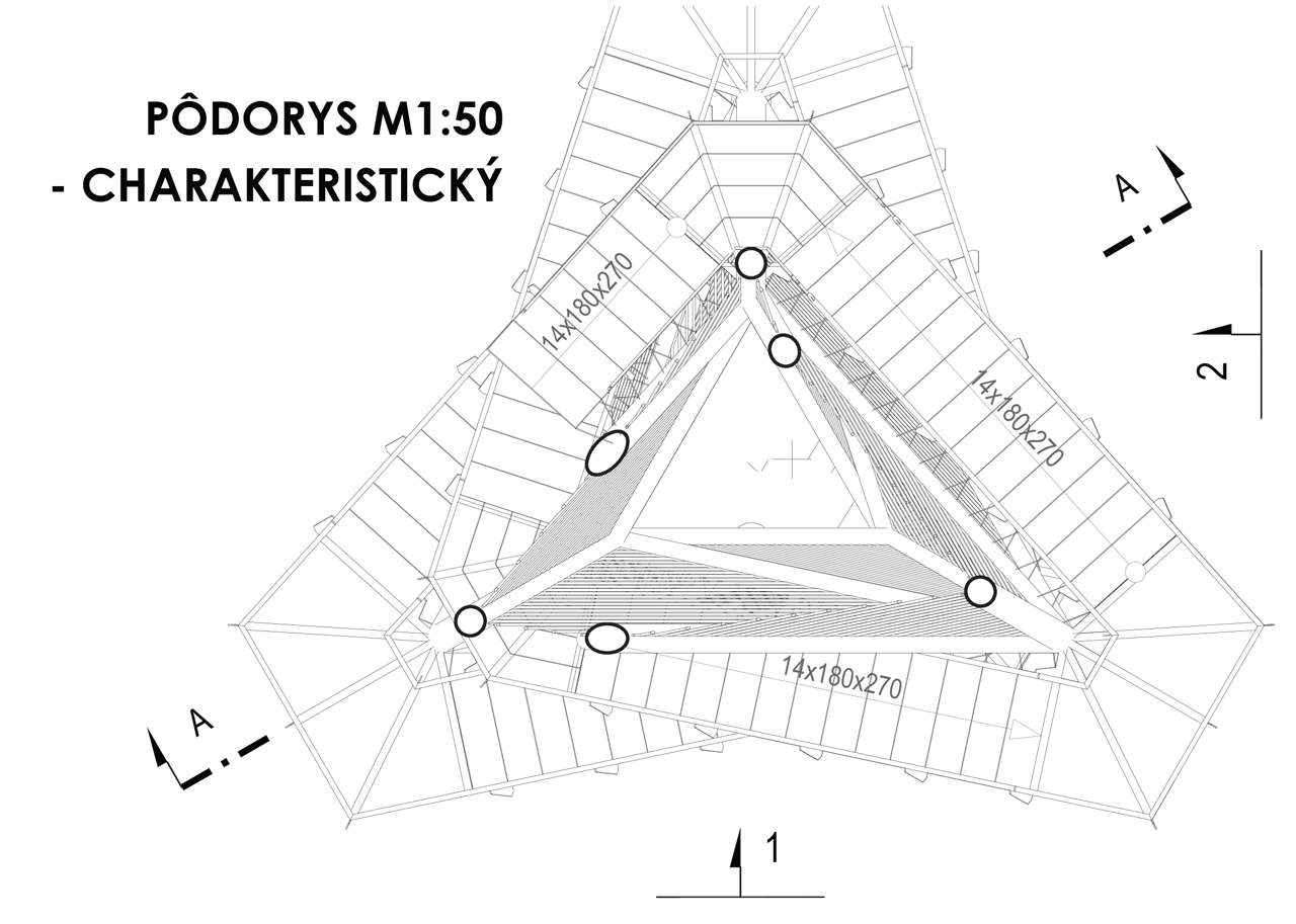 Hlavnú časť nosnej konštrukcie tvorí priestorová priehradová konštrukcia z oceľových kruhových trubiek TR 219x8. Jednotlivé stupne schodišťa sú vykonzolované z týchto šikmých nosných profilov. Medzipodesty z oceľových nosníkov IPE140 sú vykonzolované zo styčníkov hlavnej nosnej konštrukcie. Na vrchole je konštrukcia zakončená vyhliadkovou plošinou, ktorú tvorí sústava oceľových nosníkov IPE200. Podlaha je navrhnutá z ťahokovu.