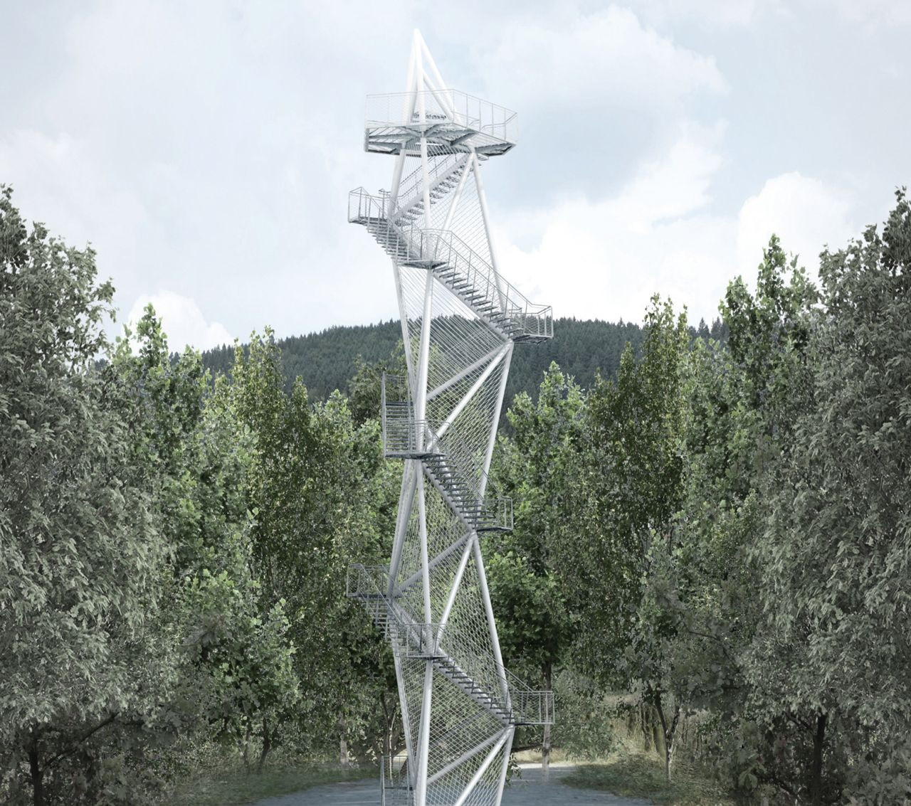 Veža je tvorená prelamovanou trubkovou priehradovinou, ktorá kopíruje priestorovú krivku výstupnej čiary schodišťa. Štruktúra z diaľky nejasne presvitá medzi korunami stromov. Až pri bližšom pohľade sa objaví konkrétna kryštalická forma diagonálnych línií doplňujúca lokálne rozšírený priestor. Pri ďalšom pohybe priestorom je geometria, ktorú vnímame, z každého uhlu pohľadu iná. Základná nosná konštrukcia je doplnená lanovým výpletom, ktorý jemne zvýrazňuje tvar "kryštálu".
